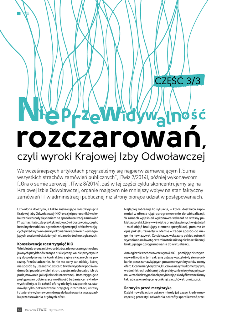 CIO CZĘŚĆ 3/3 Nieprzew dywalność i rozczarowań, czyli wyroki Krajowej Izby Odwoławczej We wcześniejszych artykułach przyjrzeliśmy się najpierw zamawiającym („Suma wszystkich strachów zamówień publicznych“, ITwiz 7/2014), później wykonawcom („Gra o sumie zerowej“, ITwiz 8/2014), zaś w tej części cyklu skoncentrujemy się na Krajowej Izbie Odwoławczej, organie mającym nie mniejszy wpływ na stan faktyczny zamówień IT w administracji publicznej niż strony biorące udział w postępowaniach. Utrwalona doktryna, a także zaskakujące rozstrzygnięcia Krajowej Izby Odwoławczej (KIO) oraz jej poprzedników wielokrotnie rzucały się cieniem na sposób realizacji zamówień IT, wzmacniając złe praktyki nabywców i dostawców, często bezsilnych w obliczu ograniczonej percepcji arbitrów stojących przed wyzwaniem wyrokowania w sprawach wymagających znajomości złożonych niuansów technologicznych. Konsekwencje rozstrzygnięć KIO Wieloletnie orzecznictwo arbitrów, niewzruszonych wobec jawnych przykładów rażąco niskiej ceny, walnie przyczyniło się do podpisywania kontraktów z góry skazanych na porażkę. Przeświadczenie, że nie ma ceny tak niskiej, której nie sposób by uzasadnić, zostało trwale wyryte w podświadomości przedstawicieli stron, często zniechęcając ich do podejmowania jakiejkolwiek interwencji. Rozstrzygnięcia postępowań odbierające możliwość badania cen składowych oferty, o ile całość oferty nie była rażąco niska, stanowiły tylko potwierdzenie przyjętej interpretacji ustawy i otwierały wykonawcom drogę do lawirowania w przypadku przedstawienia błędnych ofert. 44 MAGAZYN ITWIZ styczeń 2015 Najlepiej zobrazuje to sytuacja, w której dostawca zapomniał w ofercie ująć oprogramowanie do wirtualizacji. W ramach wyjaśnień wykonawca wskazał na własny pakiet autorski, który – w świetle przedstawionych wyjaśnień – miał objąć brakujący element specyfikacji, pomimo że opis pakietu zawarty w ofercie w żaden sposób do niego nie nawiązywał. Co ciekawe, wskazany pakiet autorski wyceniono na kwotę czterokrotnie niższą niż koszt licencji brakującego oprogramowania do wirtualizacji. Analogicznie zachowawcze wyroki KIO – pomijając historyczną wadliwość w tym zakresie ustawy – przełożyły się na unikanie przez zamawiających pozacenowych kryteriów oceny ofert. Ocena merytoryczna, kluczowa na rynku komercyjnym, w administracji publicznej była praktycznie niewykorzystywana, w rzadkich wypadkach przybierając skodyfikowane formy tak, aby za wszelką cenę uniknąć zarzutów stronniczości. Retoryka przed merytoryką Dzięki nowelizacjom ustawy minęły już czasy, kiedy mnożące się protesty i odwołania potrafiły sparaliżować prze- CIO Wieloletnie orzecznictwo arbitrów, niewzruszonych wobec jawnych przykładów rażąco niskiej ceny, walnie przyczyniło się do podpisywania kontraktów z góry skazanych na porażkę. Rozstrzygnięcia postępowań odbierające możliwość badania cen składowych oferty, o ile całość oferty nie była rażąco niska, stanowiły tylko potwierdzenie przyjętej interpretacji ustawy i otwierały wykonawcom drogę do lawirowania w przypadku przedstawienia błędnych ofert. targi na lata. Ograniczono również kuriozalne sytuacje, w których zapadały rozstrzygnięcia wzajemnie ze sobą sprzeczne, zwłaszcza pojawiające się w ramach tego samego postępowania. Czasy te jednak obnażyły ponure oblicze zamówień IT, ujawniające się do dzisiaj w powszechnym przekonaniu o nieprzewidywalności wyroków KIO. Obecnie strony każdorazowo szacują swoje szanse na wygranie odwołania w oderwaniu od faktów i własnych racji, koncentrując się przede wszystkim na prawdopodobieństwie wymanewrowania orzekających. Wielokrotnie wydatek rzędu 20 000 zł, obejmujący wpis od odwołania oraz koszty reprezentacji, ponoszony wyłącznie w przypadku przegranej, jest wart położenia na szali, gdy gra toczy się o wielomilionowe i strategiczne kontrakty. Co gorsza, sytuacja taka skłania do spekulacji ze strony zamawiającego iż może nie warto odrzucać wadliwej oferty, skoro szanse na wyjaśnienie przyczyn przed KIO są bardzo niskie. Postępowania przed KIO przypominają amerykański thriller prawniczy, gdzie sprytny adwokat skutecznie broni mordercę – rzeczywistość mija się z prawdą, retoryka radców reprezentujących strony góruje nad merytoryką i – co gorsza – techniczną wykonalnością, zaś dowody w sprawie są przedmiotem manipulacji. Wykonawca przed KIO z uporem i zawziętością będzie wywodził, że dodatek External Connector nie jest niezbędny do zapewnienia użytkownikom zewnętrznym dostępu do Windows Server 2012, zaś dokument potwierdzający udział w szkoleniu komercyjnego oprogramowania desktop GIS potwierdza certyfikowane kwalifikacje dla systemu zarządzania relacyjną bazą danych. Takie przykłady można mnożyć w nieskończoność. Wyzwania dla arbitrów Z jednej strony arbitrom brakuje wiedzy do rozstrzygania w tematach wymagających ponadprzeciętnej wiedzy informatycznej. Z drugiej zaś karmienie orzekających nieprawdą – zarówno przez wykonawców, jak i zamawiających – jest de facto bezkarne. Zawsze bowiem mogą tłumaczyć się pomyłką lub złą interpretacją przedstawionych faktów. Jeśli do tego dodamy brak powoływania biegłych przez Krajową Izbę Odwoławczą, to uzyskamy jednoznaczną receptę na legendarną przypadkowość wyroków. Sytuacje, z jakimi muszą mierzyć się arbitrzy, najlepiej obrazuje postępowanie sprzed kilku lat, w którym kanwą sporu było stwierdzenie, czy system ArcGIS Server w wersji 9.1 będzie działał w systemie operacyjnym Windows Server 2008. Zamawiający mający wątpliwości zwrócił się z zapytaniem do producenta, który w przesłanym oświadczeniu podpisanym zgodnie z reprezentacją spółki potwierdził brak kompatybilności obu środowisk. W trakcie KIO wykonaw