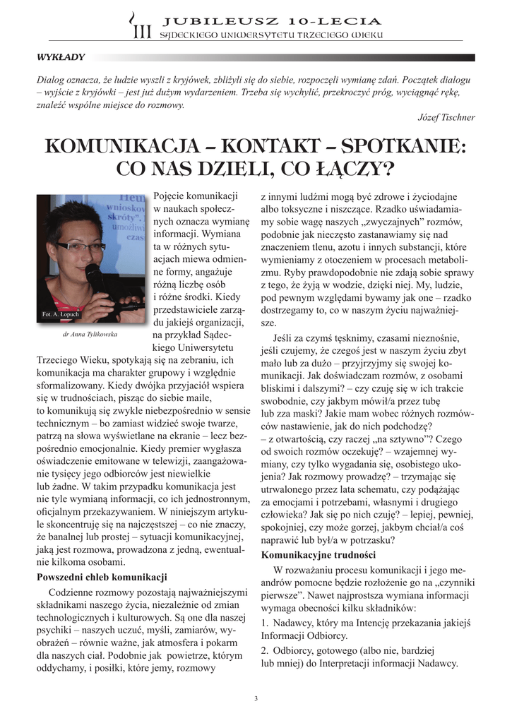 J U B I L E U S Z 1 0 - L E C IA SADECKIEGO UNIWERSYTETU TRZECIEGO WIEKU WYKŁADY Dialog oznacza, że ludzie wyszli z kryjówek, zbliżyli się do siebie, rozpoczęli wymianę zdań. Początek dialogu – wyjście z kryjówki – jest już dużym wydarzeniem. Trzeba się wychylić, przekroczyć próg, wyciągnąć rękę, znaleźć wspólne miejsce do rozmowy. Józef Tischner KOMUNIKACJA – KONTAKT – SPOTKANIE: CO NAS DZIELI, CO ŁĄCZY? Pojęcie komunikacji w naukach społecznych oznacza wymianę informacji. Wymiana ta w różnych sytuacjach miewa odmienne formy, angażuje różną liczbę osób i różne środki. Kiedy przedstawiciele zarząFot. A. Łopuch du jakiejś organizacji, dr Anna Tylikowska na przykład Sądeckiego Uniwersytetu Trzeciego Wieku, spotykają się na zebraniu, ich komunikacja ma charakter grupowy i względnie sformalizowany. Kiedy dwójka przyjaciół wspiera się w trudnościach, pisząc do siebie maile, to komunikują się zwykle niebezpośrednio w sensie technicznym – bo zamiast widzieć swoje twarze, patrzą na słowa wyświetlane na ekranie – lecz bezpośrednio emocjonalnie. Kiedy premier wygłasza oświadczenie emitowane w telewizji, zaangażowanie tysięcy jego odbiorców jest niewielkie lub żadne. W takim przypadku komunikacja jest nie tyle wymianą informacji, co ich jednostronnym, oficjalnym przekazywaniem. W niniejszym artykule skoncentruję się na najczęstszej – co nie znaczy, że banalnej lub prostej – sytuacji komunikacyjnej, jaką jest rozmowa, prowadzona z jedną, ewentualnie kilkoma osobami. Powszedni chleb komunikacji Codzienne rozmowy pozostają najważniejszymi składnikami naszego życia, niezależnie od zmian technologicznych i kulturowych. Są one dla naszej psychiki – naszych uczuć, myśli, zamiarów, wyobrażeń – równie ważne, jak atmosfera i pokarm dla naszych ciał. Podobnie jak powietrze, którym oddychamy, i posiłki, które jemy, rozmowy z innymi ludźmi mogą być zdrowe i życiodajne albo toksyczne i niszczące. Rzadko uświadamiamy sobie wagę naszych „zwyczajnych” rozmów, podobnie jak nieczęsto zastanawiamy się nad znaczeniem tlenu, azotu i innych substancji, które wymieniamy z otoczeniem w procesach metabolizmu. Ryby prawdopodobnie nie zdają sobie sprawy z tego, że żyją w wodzie, dzięki niej. My, ludzie, pod pewnym względami bywamy jak one – rzadko dostrzegamy to, co w naszym życiu najważniejsze. Jeśli za czymś tęsknimy, czasami nieznośnie, jeśli czujemy, że czegoś jest w naszym życiu zbyt mało lub za dużo – przyjrzyjmy się swojej komunikacji. Jak doświadczam rozmów, z osobami bliskimi i dalszymi? – czy czuję się w ich trakcie swobodnie, czy jakbym mówił/a przez tubę lub zza maski? Jakie mam wobec różnych rozmówców nastawienie, jak do nich podchodzę? – z otwartością, czy raczej „na sztywno”? Czego od swoich rozmów oczekuję? – wzajemnej wymiany, czy tylko wygadania się, osobistego ukojenia? Jak rozmowy prowadzę? – trzymając się utrwalonego przez lata schematu, czy podążając za emocjami i potrzebami, własnymi i drugiego człowieka? Jak się po nich czuję? – lepiej, pewniej, spokojniej, czy może gorzej, jakbym chciał/a coś naprawić lub był/a w potrzasku? Komunikacyjne trudności W rozważaniu procesu komunikacji i jego meandrów pomocne będzie rozłożenie go na „czynniki pierwsze”. Nawet najprostsza wymiana informacji wymaga obecności kilku składników: 1. Nadawcy, który ma Intencję przekazania jakiejś Informacji Odbiorcy. 2. Odbiorcy, gotowego (albo nie, bardziej lub mniej) do Interpretacji informacji Nadawcy. 3 J U B I L E U S Z 1 0 - L E C IA SADECKIEGO UNIWERSYTETU TRZECIEGO WIEKU z jej Interpretacją (co zdarza się rzadko), dla obojga może być niepomyślny. • Nasz Język jest niesamowicie skomplikowany. „Potrzebuję spokoju” jest frazą stosunkowo prostą. Im bardziej złożone mamy Intencje i im bardziej rozbudowane zdania wypowiadamy, tym większe jest ryzyko ich błędnej Interpretacji przez Odbiorcę. • Nadawca niekoniecznie potrafi odpowiednio ująć w słowa to, co chce przekazać Odbiorcy. Czasami nie wie nawet, co chce wyrazić – a nie wiedząc „co”, tym bardziej nie wie „jak”. Ola może odczuwać zmęczenie, lecz nie łączyć go ze swoimi próbami spełnienia nadmiernych oczekiwań córki. Posiadając nieokreśloną Intencję, kobieta używa wieloznacznego Języka. Skoro tak, to nic dziwnego, że Janek dokonał niewłaściwej Interpretacji jej wypowiedzi. W sytuacjach, w których jako Nadawcy nie mamy świadomości własnych Intencji, stwarzamy naszym Odbiorcom szerokie pole do mylnych Interpretacji. Takie Interpretacje często prowadzą do konfliktów, pomimo pozytywnych Intencji rozmówców. • W procesie porozumiewania się udział bierze nie tylko Język mówiony, lecz także tzw. niewerbalny – postawa ciała, wyraz twarzy, gesty, wykorzystywane przedmioty. Zdarza się, że „mowa ciała” osoby jest sprzeczna z jej słowami. Za taką sprzeczność odpowiadają zwykle nieświadome Intencje, bezwiednie wyrażane ciałem, które nie podlega naszej pełnej, dowolnej kontroli – w przeciwieństwie do wypowiadanych słów. Może być tak, że na poziomie świadomym Ola chce się widywać z Jankiem, więc mówi mu o tym wprost i chętnie się z nim umawia. Jednocześnie, nieświadomie, kobieta obawia się bliskości – związanej z ryzykiem utraty i zranienia – co sprawia, że często spóźnia się na spotkania z Jankiem, a w ich trakcie rzadko patrzy mu w oczy, chowa się za stołem, filiżanką lub skrzyżowanymi rękami. Spostrzegając u innych ludzi niezgodność między Językiem werbalnym a Językiem ciała, czujemy zwykle, że „coś nie gra”. W efekcie stajemy się nieufni i ostrożni, co nie pozostaje bez wpływu na naszego rozmówcę, który jeszcze bardziej wycofuje się z procesu komunikacji. • Skuteczność komunikacji wymaga zaangażowania obu stron, zarówno Nadaw