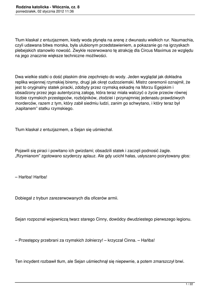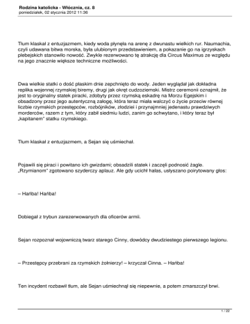 Rodzina katolicka - Włócznia, cz. 8 poniedziałek, 02 stycznia 2012 11:36 Tłum klaskał z entuzjazmem, kiedy woda płynęła na arenę z dwunastu wielkich rur. Naumachia, czyli udawana bitwa morska, była ulubionym przedstawieniem, a pokazanie go na igrzyskach plebejskich stanowiło nowość. Zwykle rezerwowano tę atrakcję dla Circus Maximus ze względu na jego znacznie większe techniczne możliwości. Dwa wielkie statki o dość płaskim dnie zepchnięto do wody. Jeden wyglądał jak dokładna replika wojennej rzymskiej biremy, drugi jak okręt cudzoziemski. Mistrz ceremonii oznajmił, że jest to oryginalny statek piracki, zdobyty przez rzymską eskadrę na Morzu Egejskim i obsadzony przez jego autentyczną załogę, która teraz miała walczyć o życie przeciw równej liczbie rzymskich przestępców, rozbójników, złodziei i przynajmniej jedenastu prawdziwych morderców, razem z tym, który zabił siedmiu ludzi, zanim go schwytano, i który teraz był „kapitanem” statku rzymskiego. Tłum klaskał z entuzjazmem, a Sejan się uśmiechał. Pojawili się piraci i powitano ich gwizdami; obsadzili statek i zaczęli podnosić żagle. „Rzymianom” zgotowano szyderczy aplauz. Ale gdy ucichł hałas, usłyszano poirytowany głos: – Hańba! Hańba! Dobiegał z trybun zarezerwowanych dla oficerów armii. Sejan rozpoznał wojowniczą twarz starego Cinny, dowódcy dwudziestego pierwszego legionu. – Przestępcy przebrani za rzymskich żołnierzy! – krzyczał Cinna. – Hańba! Ten incydent rozbawił tłum, ale Sejan uśmiechnął się niepewnie, a potem zmarszczył brwi. 1 / 22 Rodzina katolicka - Włócznia, cz. 8 poniedziałek, 02 stycznia 2012 11:36 Twarz starego Cinny była purpurowa i jeszcze coś wykrzykiwał, ale nikt już nie słyszał jego słów, bo statki ruszyły na siebie i tłum zaczął wrzeszczeć: – Staranujcie ich, Rzymianie, staranujcie! Balbus wszedł po schodach do loży Sejana. Promieniał. – Najlepsze igrzyska, jakie widziałem w życiu, szlachetny Sejanie. – Nonsens, przyjacielu, ale przyznaję, że wszystko dobrze idzie. Czy postawiłeś zakład na któryś ze statków? – Na Rzymian, oczywiście, i oni wygrają – patrz, tam. Długi żelazny dziób rzymskiej biremy wbił się z ogłuszającym trzaskiem w statek piracki, Rzymianie wdarli się na pokład i rozpoczęła się masowa rzeź. Tłum szalał z zachwytu. – Twój człowiek będzie zaraz po tym – rzekł ze spokojem Sejan. Balbus skinął głową. – Młoda żmija podąży za starą. Dostałeś, oczywiście, mój raport o starym. – Tak. 2 / 22 Rodzina katolicka - Włócznia, cz. 8 poniedziałek, 02 stycznia 2012 11:36 Oczy śniętej ryby, pomyślał Balbus. Może nie był to najlepszy moment, by o to prosić. Podjął jednak decyzję – dość trudno było spotkać tego człowieka samego. – Jeżeli jesteś uprzejmy pamiętać, Sejanie, prosiłem cię o małą przysługę – o twoje słowo w moim imieniu do szlachetnej pani Klaudii Prokuli. Znów rybie oczy. Oczy śniętej ryby. Tylko usta się uśmiechały. – Pamiętam o tym, Balbusie. Chciałbym móc spełnić twoją prośbę, ale niestety nie mogę. – N-nie? – Wykluczone, przyjacielu. Widzisz, pani Klaudia Prokula wychodzi za mąż. Może nawet wyszła dzisiaj albo wczoraj? Jedno lub drugie, nie pamiętam. Chyba wygrałeś swój zakład. To dlatego nie mógł się zobaczyć z Klaudią. Zamężna. Balbus wbił paznokcie w dłonie. Tłum wył szaleńczo. Greccy piraci zostali wybici do nogi. – Za kogo, Sejanie? – Co? A, tak. Miała być tu dzisiaj z mężem. Później zjeść ze mną kolację. Wyruszają wkrótce za morze. Mój stary przyjaciel Gratus wraca z Judei – skończył się jego czas, ku jego wielkiej uldze. Mąż Klaudii jest nowym prokuratorem. Jestem pewien, że ona będzie mu ozdobą. Nie rób takiej zawiedzionej miny, stary przyjacielu. Bardzo mi przykro, że nie mogłem ci w tym pomóc, ale oni się poznali i nie mogłem się wtrącać. Niedobrze jest wysyłać na prowincję wysokiego urzędnika żywiącego urazę, prawda? Może gdybyś mi przedstawił swoje życzenie parę miesięcy wcześniej – ale teraz jest za późno, to już się stało. O właśnie, ona tam jest; są oboje, właśnie wchodzą, mocno spóźnieni. Cóż, państwo młodzi. 3 / 22 Rodzina katolicka - Włócznia, cz. 8 poniedziałek, 02 stycznia 2012 11:36 Woda wypływała z areny i trysnęły strumienie z fontann – w każdej części amfiteatru znajdowała się jedna. – Perfumowana woda – powiedział wesoło Sejan. – Czują się przez to, jak gdyby należeli do wyższych klas, a wyższe klasy mniej cierpią z powodu ich zapachu. Nie, nie, Balbusie, nie idź jeszcze – razem obejrzymy śmierć młodej żmii. Zaraz się tu pojawi. I nie martw się, człowieku – nie ma kobiet niezastąpionych. Kiedy poślubiłem Apikatę, myślałem, że już nigdy nie dotknę innej kobiety, a teraz cieszę się, że się jej pozbyłem. Wzdrygam się na samą myśl o niej. Taka jest kolej rzeczy, przyjacielu, taka kolej rzeczy. Nie jesteś dwudziestoletnim chłopcem, Balbusie, tylko człowiekiem światowym. Uśmiech był teraz przymilny; nawet Sejan nie chciał mieć wroga w milionerze. Ale jego oczy pozostały zimne jak u śniętej ryby. Balbus próbował odwzajemnić uśmiech. Nawet milioner nie mógł ryzykować wrogości Sejana. – Ty też zjesz ze mną kolację – powiedział dostojnik. – Przywitasz się z tą damą i jej mężem, będziesz im życzył szczęścia, pokażesz, jak mało cię to obchodzi, a jutro przyślę ci trzy dziewczyny, które kupiłem w zeszłym tygodniu – uwierz mi, nigdy nie widziałeś czegoś podobnego. Fidiasz wziąłby je na modelki. Ćwiczyła je sama Melissa. Jesteś dobrym przyjacielem, Balbusie. Nie zapominam o dobrych przyjaciołach. Trochę za łaskawie. O wiele za łaskawie. Co się za tym kryło? – Każę wywołać ciebie jako właściciela młodej żmii – rzekł Sejan. To był prawdziwy za