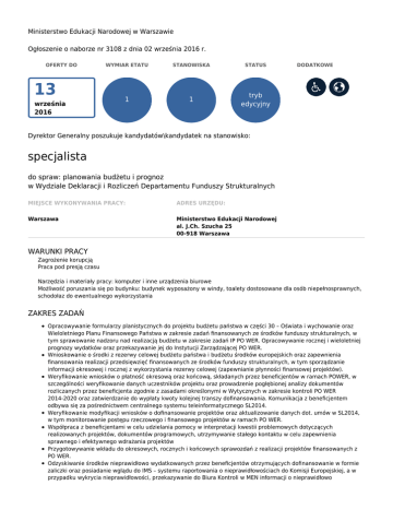 Ministerstwo Edukacji Narodowej w Warszawie Ogłoszenie o naborze nr 3108 z dnia 02 września 2016 r. OFERTY DO 13 września 2016 WYMIAR ETATU STANOWISKA STATUS 1 1 tryb edycyjny DODATKOWE Dyrektor Generalny poszukuje kandydatów\kandydatek na stanowisko: specjalista do spraw: planowania budżetu i prognoz w Wydziale Deklaracji i Rozliczeń Departamentu Funduszy Strukturalnych MIEJSCE WYKONYWANIA PRACY: ADRES URZĘDU: Warszawa Ministerstwo Edukacji Narodowej al. J.Ch. Szucha 25 00-918 Warszawa WARUNKI PRACY Zagrożenie korupcją Praca pod presją czasu Narzędzia i materiały pracy: komputer i inne urządzenia biurowe Możliwość poruszania się po budynku: budynek wyposażony w windy, toalety dostosowane dla osób niepełnosprawnych, schodołaz do ewentualnego wykorzystania ZAKRES ZADAŃ Opracowywanie formularzy planistycznych do projektu budżetu państwa w części 30 – Oświata i wychowanie oraz Wieloletniego Planu Finansowego Państwa w zakresie zadań finansowanych ze środków funduszy strukturalnych, w tym sprawowanie nadzoru nad realizacją budżetu w zakresie zadań IP PO WER. Opracowywanie rocznej i wieloletniej prognozy wydatków oraz przekazywanie jej do Instytucji Zarządzającej PO WER. Wnioskowanie o środki z rezerwy celowej budżetu państwa i budżetu środków europejskich oraz zapewnienia finansowania realizacji przedsięwzięć finansowanych ze środków funduszy strukturalnych, w tym sporządzanie informacji okresowej i rocznej z wykorzystania rezerwy celowej (zapewnianie płynności finansowej projektów). Weryfikowanie wniosków o płatność okresową oraz końcową, składanych przez beneficjentów w ramach POWER, w szczególności weryfikowanie danych uczestników projektu oraz prowadzenie pogłębionej analizy dokumentów rozliczanych przez beneficjenta zgodnie z zasadami określonymi w Wytycznych w zakresie kontroli PO WER 2014-2020 oraz zatwierdzanie do wypłaty kwoty kolejnej transzy dofinansowania. Komunikacja z beneficjentem odbywa się za pośrednictwem centralnego systemu teleinformatycznego SL2014. Weryfikowanie modyfikacji wniosków o dofinansowanie projektów oraz aktualizowanie danych dot. umów w SL2014, w tym monitorowanie postępu rzeczowego i finansowego projektów w ramach PO WER. Współpraca z beneficjentami w celu udzielania pomocy w interpretacji kwestii problemowych dotyczących realizowanych projektów, dokumentów programowych, utrzymywanie stałego kontaktu w celu zapewnienia sprawnego i efektywnego wdrażania projektów Przygotowywanie wkładu do okresowych, rocznych i końcowych sprawozdań z realizacji projektów finansowanych z PO WER. Odzyskiwanie środków nieprawidłowo wydatkowanych przez beneficjentów otrzymujących dofinansowanie w formie zaliczki oraz posiadanie wglądu do IMS – systemu raportowania o nieprawidłowościach do Komisji Europejskiej, a w przypadku wykrycia nieprawidłowości, przekazywanie do Biura Kontroli w MEN informacji o nieprawidłowo wydatkowanych środkach w ramach projektów III Priorytetu PO KL oraz wprowadzanie danych do Rejestru obciążeń na projekcie. Gromadzenie, przechowywanie i archiwizowanie wszelkiej dokumentacji związanej z wykonywanymi zadaniami w ramach PO WER oraz w ramach Priorytetu III PO KL WYMAGANIA NIEZBĘDNE Wykształcenie: wyższe doświadczenie zawodowe: 2 lata w obszarze funduszy strukturalnych znajomość języka angielskiego na poziomie komunikatywnym (B1) znajomość procedur i wytycznych horyzontalnych dla perspektywy finansowej 2014 -2020 w zakresie: kwalifikowalności wydatków (w części dotyczącej EFS), kontroli dla PO WER 2014-2020 (w części dotyczącej weryfikacji wniosków o płatność), korygowania i odzyskiwania nieprawidłowych wydatków oraz raportowania nieprawidłowości w ramach programów operacyjnych polityki spójności na lata 2014-2020 znajomość ustawy o zasadach realizacji programów w zakresie polityki spójności finansowanych w perspektywie finansowej 2014–2020 (rozdział 6 i 7) znajomość zasad dotyczących zamknięcia Programu Operacyjnego PO KL 2007-2013 znajomość zasad funkcjonowania administracji publicznej (w zakresie podziału, zasad organizacji i działania), w tym służby cywilnej (w zakresie organizacji s.c., uprawnień i obowiązków członków korpusu służby cywilnej) umiejętność współpracy samodzielność rzetelność i terminowość odporność na stres Posiadanie obywatelstwa polskiego albo obywatelstwa innego państwa Unii Europejskiej albo obywatelstwa innego państwa, którego obywatele na podstawie umów międzynarodowych lub przepisów prawa wspólnotowego posiadają prawo podjęcia zatrudnienia na terytorium Rzeczypospolitej Polskiej Korzystanie z pełni praw publicznych Nieskazanie prawomocnym wyrokiem za umyślne przestępstwo lub umyśle przestępstwo skarbowe WYMAGANIA DODATKOWE Wykształcenie: wyższe magisterskie studia podyplomowe z zakresu funduszy strukturalnych lub zarządzania projektami lub księgowości lub rachunkowości przeszkolenie z zakresu zarządzania projektami lub rachunkowości lub audytu wewnętrznego znajomość ustawy o finansach publicznych w zakresie wykonywania budżetu środków europejskich znajomość ustawy prawo zamówień publicznych znajomość ustawy o odpowiedzialności za naruszenie dyscypliny finansów publicznych znajomość rozporządzenia Parlamentu Europejskiego i Rady (UE) nr 1304/2013 („rozporządzenie w sprawie EFS”) znajomość rozporządzenia Parlamentu Europejskiego i Rady (UE) 1303/2013 z dnia 17 grudnia 2013 (w zakresie części IV – przepisy ogólne mające zastosowanie do funduszy polityki spójności i EFMR) znajomość Szczegółowego Opisu Osi Priorytetowych PO WER 2014-2020 w zakresie interwencji realizowanej przez MEN (działania 2.10, 2.13, 2.14 i 2.15) znajomość krajowych wytycznych w zakresie kwalifikowania wydatków w ramach Programu Operacyjnego Kapitał Ludzki DOKUMENTY I OŚWIADCZENIA NIEZBĘDNE Życiorys/CV i list motywacyjny Kopie