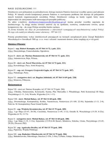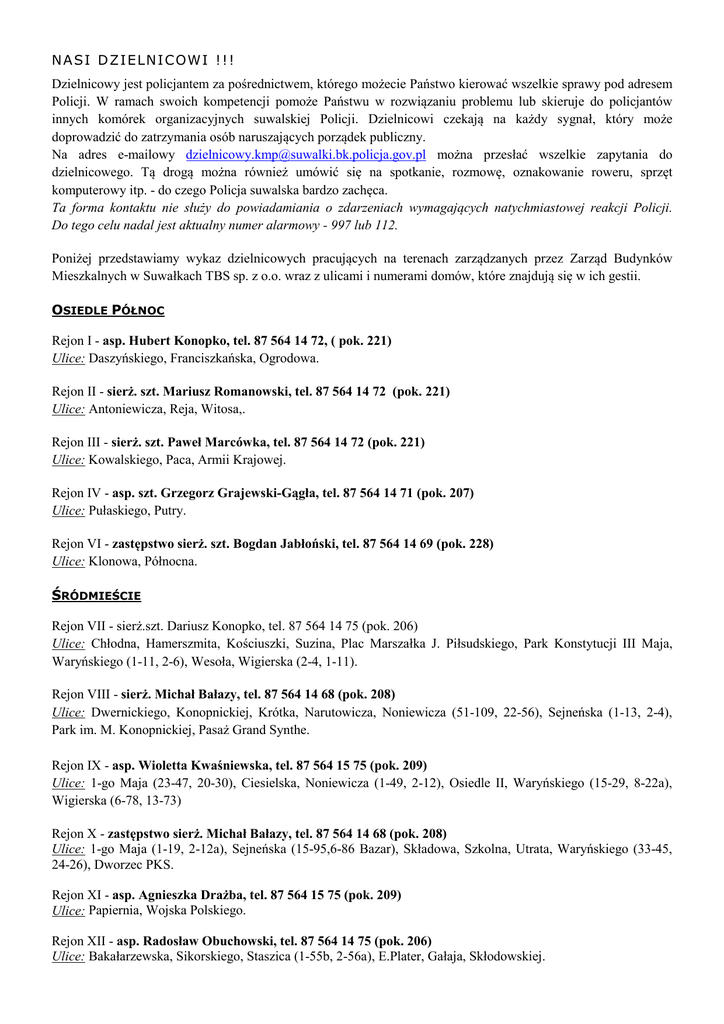 N A SI D Z I E LN I C OW I ! ! ! Dzielnicowy jest policjantem za pośrednictwem, którego możecie Państwo kierować wszelkie sprawy pod adresem Policji. W ramach swoich kompetencji pomoże Państwu w rozwiązaniu problemu lub skieruje do policjantów innych komórek organizacyjnych suwalskiej Policji. Dzielnicowi czekają na każdy sygnał, który może doprowadzić do zatrzymania osób naruszających porządek publiczny. Na adres e-mailowy [email protected] można przesłać wszelkie zapytania do dzielnicowego. Tą drogą można również umówić się na spotkanie, rozmowę, oznakowanie roweru, sprzęt komputerowy itp. - do czego Policja suwalska bardzo zachęca. Ta forma kontaktu nie służy do powiadamiania o zdarzeniach wymagających natychmiastowej reakcji Policji. Do tego celu nadal jest aktualny numer alarmowy - 997 lub 112. Poniżej przedstawiamy wykaz dzielnicowych pracujących na terenach zarządzanych przez Zarząd Budynków Mieszkalnych w Suwałkach TBS sp. z o.o. wraz z ulicami i numerami domów, które znajdują się w ich gestii. OSIEDLE PÓŁNOC Rejon I - asp. Hubert Konopko, tel. 87 564 14 72, ( pok. 221) Ulice: Daszyńskiego, Franciszkańska, Ogrodowa. Rejon II - sierż. szt. Mariusz Romanowski, tel. 87 564 14 72 (pok. 221) Ulice: Antoniewicza, Reja, Witosa,. Rejon III - sierż. szt. Paweł Marcówka, tel. 87 564 14 72 (pok. 221) Ulice: Kowalskiego, Paca, Armii Krajowej. Rejon IV - asp. szt. Grzegorz Grajewski-Gągła, tel. 87 564 14 71 (pok. 207) Ulice: Pułaskiego, Putry. Rejon VI - zastępstwo sierż. szt. Bogdan Jabłoński, tel. 87 564 14 69 (pok. 228) Ulice: Klonowa, Północna. ŚRÓDMIEŚCIE Rejon VII - sierż.szt. Dariusz Konopko, tel. 87 564 14 75 (pok. 206) Ulice: Chłodna, Hamerszmita, Kościuszki, Suzina, Plac Marszałka J. Piłsudskiego, Park Konstytucji III Maja, Waryńskiego (1-11, 2-6), Wesoła, Wigierska (2-4, 1-11). Rejon VIII - sierż. Michał Bałazy, tel. 87 564 14 68 (pok. 208) Ulice: Dwernickiego, Konopnickiej, Krótka, Narutowicza, Noniewicza (51-109, 22-56), Sejneńska (1-13, 2-4), Park im. M. Konopnickiej, Pasaż Grand Synthe. Rejon IX - asp. Wioletta Kwaśniewska, tel. 87 564 15 75 (pok. 209) Ulice: 1-go Maja (23-47, 20-30), Ciesielska, Noniewicza (1-49, 2-12), Osiedle II, Waryńskiego (15-29, 8-22a), Wigierska (6-78, 13-73) Rejon X - zastępstwo sierż. Michał Bałazy, tel. 87 564 14 68 (pok. 208) Ulice: 1-go Maja (1-19, 2-12a), Sejneńska (15-95,6-86 Bazar), Składowa, Szkolna, Utrata, Waryńskiego (33-45, 24-26), Dworzec PKS. Rejon XI - asp. Agnieszka Drażba, tel. 87 564 15 75 (pok. 209) Ulice: Papiernia, Wojska Polskiego. Rejon XII - asp. Radosław Obuchowski, tel. 87 564 14 75 (pok. 206) Ulice: Bakałarzewska, Sikorskiego, Staszica (1-55b, 2-56a), E.Plater, Gałaja, Skłodowskiej.