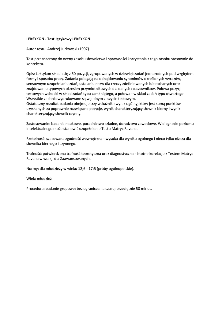 LEKSYKON - Test Językowy LEKSYKON Autor testu: Andrzej Jurkowski (1997) Test przeznaczony do oceny zasobu słownictwa i sprawności korzystania z tego zasobu stosownie do kontekstu. Opis: Leksykon składa się z 60 pozycji, zgrupowanych w dziewięć zadań jednorodnych pod względem formy i sposobu pracy. Zadania polegają na odnajdowaniu synonimów określonych wyrazów, sensownym uzupełnianiu zdań, ustalaniu nazw dla rzeczy zdefiniowanych lub opisanych oraz znajdowaniu typowych określeń przymiotnikowych dla danych rzeczowników. Połowa pozycji testowych wchodzi w skład zadań typu zamkniętego, a połowa - w skład zadań typu otwartego. Wszystkie zadania wydrukowane są w jednym zeszycie testowym. Ostateczny rezultat badania obejmuje trzy wskaźniki: wynik ogólny, który jest sumą punktów uzyskanych za poprawnie rozwiązane pozycje, wynik charakteryzujący słownik bierny i wynik charakteryzujący słownik czynny. Zastosowanie: badania naukowe, poradnictwo szkolne, doradztwo zawodowe. W diagnozie poziomu intelektualnego może stanowić uzupełnienie Testu Matryc Ravena. Rzetelność: szacowana zgodność wewnętrzna - wysoka dla wyniku ogólnego i nieco tylko niższa dla słownika biernego i czynnego. Trafność: potwierdzona trafność teoretyczna oraz diagnostyczna - istotne korelacje z Testem Matryc Ravena w wersji dla Zaawansowanych. Normy: dla młodzieży w wieku 12;6 - 17;5 (próby ogólnopolskie). Wiek: młodzież Procedura: badanie grupowe; bez ograniczenia czasu; przeciętnie 50 minut.