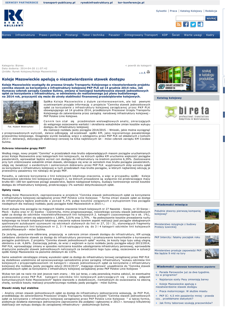 SERWISY PARTNERSKIE transport-publiczny.pl rynekinfrastruktury.pl tor-konferencje.pl Sylwetki Biznes Infrastruktura Prawo i polityka Przetargi Tabor i technika Pasażer Zintegrowany Transport Kategoria: Biznes Data dodania: 2014-0 4-20 11:07:42 (źródło: Rynek Kolejowy/Koleje Mazowieckie) KDP Praca Katalog Kolejowy Świat Warte uwagi Redakcja Kadry < powrót do kategorii A A A Koleje Mazowieckie apelują o niezatwierdzenie stawek dostępu Koleje Mazowieckie wystąpiły do prezesa Urzędu Transportu Kolejowego o niezatwierdzanie projektu cennika stawek za korzystanie z infrastruktury kolejowej PKP PLK od 14 grudnia 2014 roku. Jak tlumaczy członek zarządu Czesław Sulima, zmiana w koncepcji kształtowania stawek jednostkowych opłat za korzystanie z infrastruktury, w odniesieniu do realizowanego już planu budżetowego na 2014 rok, przyczynić się może do utraty stabilności finansowej przedsiębiorstw kolejowych. P Katalog kolejowy Spółk a K o l e j e M a z o w i e c k i e z d uży m z a i n t e r e s o w a n i e m , a l e t eż pewnymi oczekiwaniami przyjęła informację o projekcie "Cennika stawek jednostkowych opłat za korzystanie z infrastruktury kolejowej zarząd z a n e j p r z e z P K P P L K obowiązującego od 14 grudnia 2014, przedłożonym Prezesowi Urzędu Transportu Kolejowego do zatwierdzenia przez zarządcę narodowej infrastruktury kolejowej PKP Polskie Linie Kolejowe. K C e n n i k t e n s t ał się przedmiotem wielowąt k o w y c h a n a l i z , z m i e r z a jących do wstępnego oszacowania wartości i określenia wskaźników zmian kosztów wykupu Fot. Hubert Wietrzyński dostępu do infrastruktury kolejowej dla realizacji rozkładu jazdy pociągów 2014/2015. - Wnioski, jakie można wyciągnąć z przeprowadzonych wyliczeń, dalece odbiegają od oczekiwań spółk i K M , j a k o r e g i o n a l n e g o p a s ażerskiego przewoźnika kolejowego. Osiągnięte wyniki świadczą wręcz o odstąpieniu przez PKP PLK od składanych z końcem 2013 r. deklaracji, dotyczących stabilizacji cenowej na kilka najbliższych lat - mówi członek zarządu KM Czesław Sulima. N Ochrona interesów grupy PKP? Według niego, nowy projekt "Cennika" w przedziałach mas brutto odpowiadających masom pociągów uruchamianych przez Koleje Mazowieckie oraz kategoriach linii kolejowych, na których spółka KM uruchamia większoś ć pociągów pasażerskich, wprowadzał będzie wzrost cen dostępu do infrastruktury na średnim poziomie 6,39%. Zastosowane przy tym zróżnicowane wskaźniki zmian stawek, obniżające się wraz ze wzrostem mas brutto pociągów pasażerskich, zdają się świadczyć o ewidentnym i zamierzonym dobieraniu przez PKP PLK wygórowanych stóp wzrostu opłat za korzystanie z infrastruktury kolejowej w tych przedziałach mas brutto pociągów, w których najbardziej odczują je przewoźnicy pasażerscy nie należący do grupy PKP. Ponadto, w zakresie korzystania z linii kolejowych lokalnego znaczenia, a więc w przypadku spółki Koleje Mazowieckie odcinków linii kolejowych kategorii 2, na których prowadzone są wyłącznie nie przekraczające masy brutto 60 i 100 ton spalinowe pociągi pasażerskie, będzie następował kolejny, budzący kontrowersje wzrost kosztów dostępu do infrastruktury kolejowej, przekraczający 1% wartości dotychczasowych opłat. Opłaty rosną Według Kolei Mazowieckich, zaproponowana w projekcie "Cennika stawek jednostkowych opłat za korzystanie z infrastruktury kolejowej zarządzanej przez PKP Polskie Linie Kolejowe " forma zmian stawek opłat za dostęp do infrastruktury będzie podnosiła o p o n a d 4 , 4 % p uła p k o s z t ó w z w iązanych z wykupieniem tras pociągów niezbędnych dla realizacji rozkładu jazdy pociągów Kolei Mazowieckich w 2015 r.; Koszt wykupu tras pociągów na mających lokalne znaczenie liniach kolejowych nr 27 Nasielsk - Sierpc, nr 33 Sierpc Płock - Kutno oraz nr 31 Siedlce - Czeremcha, mimo prognozowanego, niewielkiego wzrostu stawek jednostkowych opłat za dostęp do odcinków niezelektryfikowanych linii kolejowych 2. kategorii (szacowanego na o ok. 1%), w rzeczywistości zmieni się odpowiednio o 1,08%, 3,01% oraz 3,75%. - Na podwyższenie kosztów prowadzenia ruchu kolejowego na liniach kolejowych lokalnego znaczenia wpływa bowiem aspekt realizacji jazd pociągów obsługiwanych spalinowymi autobusami szynowymi na odcinkach stykowych do linii nr 27, 33 i 31, stanowiących fragmenty zelektryfikowanych linii kolejowych nr 2, 3 i 9 wpisujących się do 3 i 4 kategorii odcinków linii kolejowych zelektryfikowanych - mówi Sulima. Za jedyną, pozytywnie odbieraną propozycję w zakresie zmian stawek dostępu do infrastruktury, KM uznają zakładane obniżenie stawek za dostęp do infrastruktury peronowej i przekazywanie komunikatów o kursowaniu pociągów podróżnym. Z projektu "Cennika stawek jednostkowych opłat" wynika, że koszty tego typu usług ulegną obniżeniu o ok. 4,66%. Zaznaczają jednak, że wraz z wejściem w życie rozkładu jazdy pociągów edycji 2013/2014, PKP PLK, wprowadzając zmiany w sposobie rozliczania kosztów udostępniania infrastruktury peronowej, wprowadziła drastyczne podwyżki stawek jednostkowych naliczanych za świadczenie tego typu usług, oszacowane w sytuacji spółki Koleje Mazowieckie na poziomie zbliżonym do 133%. Same wskaźniki określające zmianę wysokości opłat za dostęp do infrastruktury torowej zarządzanej przez PKP PLK są dodatkowo uzależnione od opracowywanego samodzielnie przez zarządcę infrastruktury "wykazu odcinków linii kolejowych z przyporządkowaniem im kategorii i stawek jednostkowych opłat za korzystanie z infrastruktury kolejowej dla rozkładu jazdy pociągów edycji 2014/2015", mającego stanowić uzupełnienie do "Cennika stawek jednostkowych opłat za korzystanie z infrastruktury kolejowej zarządzanej przez PKP Polskie Linie Kolejowe " Wykaz ten jak na razie nie jest jeszcze nam znany. - Ale już teraz, z całą pe