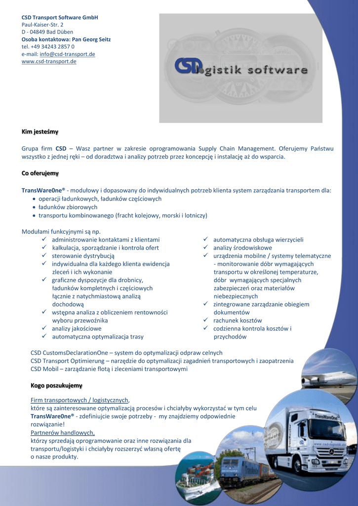 CSD Transport Software GmbH Paul-Kaiser-Str. 2 D - 04849 Bad Düben Osoba kontaktowa: Pan Georg Seitz tel. +49 34243 2857 0 e-mail: [email protected] www.csd-transport.de Kim jesteśmy Grupa firm CSD – Wasz partner w zakresie oprogramowania Supply Chain Management. Oferujemy Państwu wszystko z jednej ręki – od doradztwa i analizy potrzeb przez koncepcję i instalację aż do wsparcia. Co oferujemy TransWare0ne® - modułowy i dopasowany do indywidualnych potrzeb klienta system zarządzania transportem dla: operacji ładunkowych, ładunków częściowych ładunków zbiorowych transportu kombinowanego (fracht kolejowy, morski i lotniczy) Modułami funkcyjnymi są np. administrowanie kontaktami z klientami kalkulacja, sporządzanie i kontrola ofert sterowanie dystrybucją indywidualna dla każdego klienta ewidencja zleceń i ich wykonanie graficzne dyspozycje dla drobnicy, ładunków kompletnych i częściowych łącznie z natychmiastową analizą dochodową wstępna analiza z obliczeniem rentowności wyboru przewoźnika analizy jakościowe automatyczna optymalizacja trasy automatyczna obsługa wierzycieli analizy środowiskowe urządzenia mobilne / systemy telematyczne - monitorowanie dóbr wymagających transportu w określonej temperaturze, dóbr wymagających specjalnych zabezpieczeń oraz materiałów niebezpiecznych zintegrowane zarządzanie obiegiem dokumentów rachunek kosztów codzienna kontrola kosztów i przychodów CSD CustomsDeclarationOne – system do optymalizacji odpraw celnych CSD Transport Optimierung – narzędzie do optymalizacji zagadnień transportowych i zaopatrzenia CSD Mobil – zarządzanie flotą i zleceniami transportowymi Kogo poszukujemy Firm transportowych / logistycznych, które są zainteresowane optymalizacją procesów i chciałyby wykorzystać w tym celu TransWare0ne® - zdefiniujcie swoje potrzeby - my znajdziemy odpowiednie rozwiązanie! Partnerów handlowych, którzy sprzedają oprogramowanie oraz inne rozwiązania dla transportu/logistyki i chciałyby rozszerzyć własną ofertę o nasze produkty.