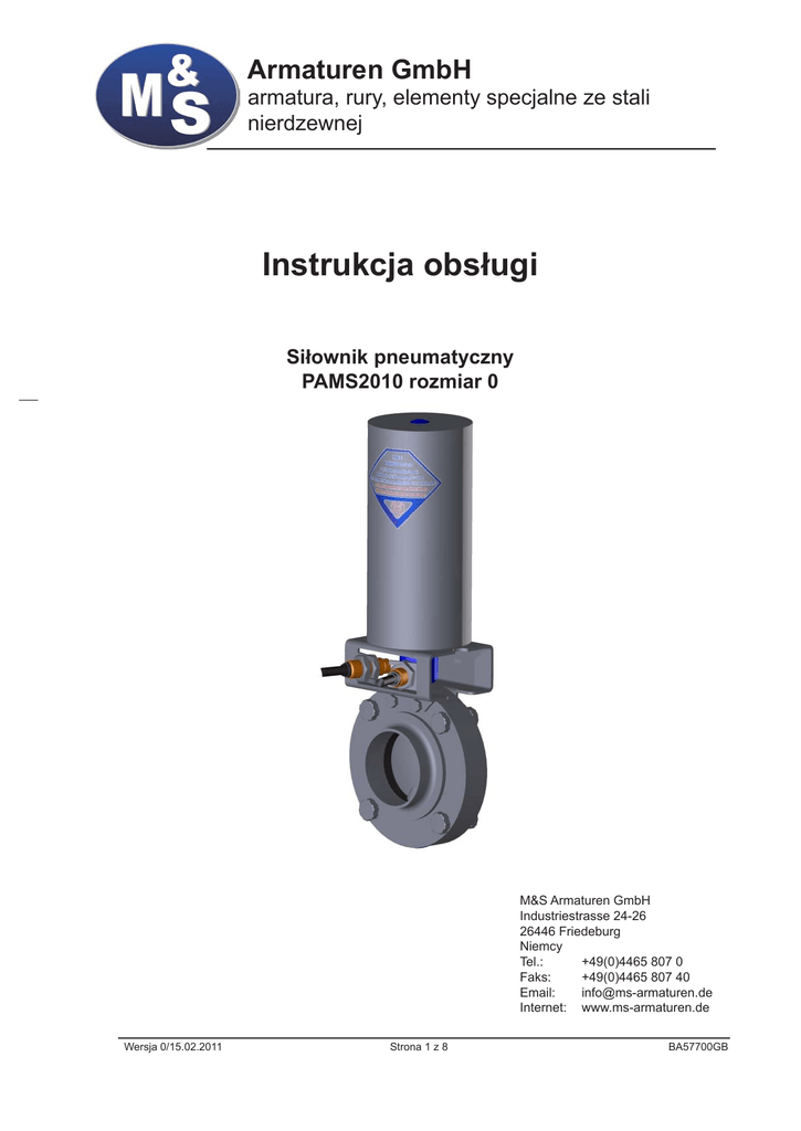 Armaturen GmbH armatura, rury, elementy specjalne ze stali nierdzewnej Instrukcja obsługi Siłownik pneumatyczny PAMS2010 rozmiar 0 M&S Armaturen GmbH Industriestrasse 24-26 26446 Friedeburg Niemcy Tel.: +49(0)4465 807 0 Faks: +49(0)4465 807 40 Email: [email protected] Internet: www.ms-armaturen.de Wersja 0/15.02.2011 Strona 1 z 8 BA57700GB Siłownik pneumatyczny PAMS2010 rozmiar 0 © Copyright M&S Armaturen GmbH Reprodukowanie, kopiowanie lub rozprowadzanie tego dokumentu lub jego części w jakiejkolwiek formie bez pisemnego zezwolenia M&S Armaturen GmbH jest zabronione. 1 Spis treści 1 Spis treści....................................................................................................................................2 2 Widok siłownika PAMS2010 rozmiar 0........................................................................................3 3 Użytkowanie i zasada działania...................................................................................................4 4 Transport i magazynowanie.........................................................................................................5 4.1 Sprawdzenie zawartości dostawy.........................................................................................5 4.2 Transport..............................................................................................................................5 5 Montaż / demontaż......................................................................................................................5 5.1 Montaż..................................................................................................................................5 5.2 Demontaż.............................................................................................................................6 5.3 Instalacja / przekazanie do użytkowania..............................................................................6 6 Naprawy/konserwacja.................................................................................................................7 7 Dane techniczne..........................................................................................................................7 7.1 Momenty i dopuszczalne ciśnienia robocze.........................................................................7 7.2 Wymagania odnośnie powietrza sterującego.......................................................................7 7.3 Temperatury robocze............................................................................................................8 8 Czyszczenie................................................................................................................................8 9 Uszkodzenia, możliwe przyczyny, środki zaradcze.....................................................................8 Wersja 0/15.02.2011 Strona 2 z 8 BA57700GB Siłownik pneumatyczny PAMS2010 rozmiar 0 Stosowane symbole Ostrzeżenia o niebezpieczeństwie Ostrzeżenia o niebezpieczeństwie są oznaczone symbolem po lewej stronie i są one w ramkach. Informacja Opisy, na które należy zwrócić szczególną uwagę oznaczone są tym symbolem i są one w ramkach. 2 Widok siłownika PAMS2010 rozmiar 0 Ø70 Pozycja Opis 4 149 1 7 8 1 Siłownik pneumatyczny PAMS2010 rozmiar 0 2 Zawór motylkowy SV04 DIN SS (opcja) 3 Wspornik SV04 (opcja) 4 Przyłącze powietrza G1/8’’ (opcja) 5 Sześciokątna śruba gniazda (opcja) 6 Nakrętka sześciokątna (opcja) 7 Indukcyjny czujnik zbliżeniowy (opcja) 8 4 śruby sześciokątne gniazda 9 Wskaźnik pozycji (opcja) 9 3 6 5 2 Rys. 1. Siłownik pneumatyczny PAMS2010 rozmiar 0 jako przykład z zaworem motylkowym SV04 SS i indukcyjne czujniki zbliżeniowe Wersja 0/15.02.2011 Strona 3 z 8 BA57700GB Siłownik pneumatyczny PAMS2010 rozmiar 0 3 Użytkowanie i zasada działania Napęd pneumatyczny PAMS2010 rozmiar 0 ułatwia sterowanie zaworami motylkowymi. Ruch posuwisty zamieniany jest przez zębnik na ruch obrotowy wałka napędowego. Długość ruchu posuwistego tłoka jest ograniczona tak, że wałek napędowy obraca się o 90° na jeden ruch posuwisty. Dzięki temu można uzyskać precyzyjny kąt obrotu wymagany do otwarcia lub zamknięcia klapy zaworu motylkowego zamontowanego kołnierzowo (2). W siłowniku LF/FL sprężone powietrze dostarczane jest przez nawiercony otwór G 1/8’’ (4) w wieku. Sprężone powietrze płynące ponad tłokiem powoduje ruch tłoka w dół i obrót klapy zaworu motylkowego. Zainstalowana sprężyna powoduje powrotny ruch tłoka. Siłownik LL wyposażony jest w dodatkowy otwór G 1/8’’ nawiercony w podstawie siłownika. Dzięki temu siłownik może wykonywać ruch powrotny, gdy nastąpi dopływ sprężonego powietrza przez ten otwór. Przyłącza pneumatyczne nie są objęte zakresem dostawy. LF /FL 1 2 Napęd jest obciążony sprężonym powietrzem nad tłokiem. Powietrze uchodzi drugą stroną przez otwór odpowietrzający. Ruch powrotny odbywa się dzięki sprężynie. Siłownik dostarczany jest z prowadzeniem sprężonego powietrza nad tłok lub pod tłok. LL3 Zastrzegamy sobie prawo wprowadzenia zmian konstrukcyjnych w celu udoskonalenia urządzenia. 1 Otwieranie powietrzem / zamykanie sprężyną (działanie pojedyncze) 2 Otwieranie sprężyną / zamykanie powietrzem (działanie pojedyncze) 3 Otwieranie powietrzem / zamykanie powietrzem (działanie podwójne) Wersja 0/15.02.2011 Strona 4 z 8 BA57700GB Siłownik pneumatyczny PAMS2010 rozmiar 0 4 Transport i magazynowanie 4.1 Sprawdzanie zawartości dostawy Po otrzymaniu urządzenia sprawdzić zgodność dostawy z zamówieniem. Sprawdzić kompletność i stan urządzenia. Jeżeli są widoczne objawy uszkodzenia podczas transportu lub braki w przesyłce, należy niezwłocznie powiadomić przedstawiciela podając numer listu przewozowego. Odbiorca powinien wystąpić z prawem regresu wobec przedstawiciela, a M&S Armaturen GmbH musi być poinformowana o tym działaniu. P