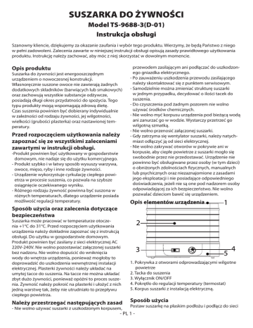 SUSZARKA DO ŻYWNOŚCI Model TS-9688-3(D-01) Instrukcja obsługi Szanowny kliencie, dziękujemy za okazanie zaufania i wybór tego produktu. Wierzymy, że będą Państwo z niego w pełni zadowoleni. Zalecenia zawarte w niniejszej instrukcji obsługi opisują zasady prawidłowego użytkowania produktu. Instrukcję należy zachować, aby móc z niej skorzystać w dowolnym momencie. Opis produktu Suszarka do żywności jest energooszczędnym urządzeniem o nowoczesnej konstrukcji. Własnoręcznie suszone owoce nie zawierają żadnych dodatkowych składników (barwiących lub smakowych) oraz zachowują wszystkie substancje odżywcze, posiadają długi okres przydatności do spożycia. Tego typu produkty mogą wspomagają zdrową dietę. Czas suszenia powinien być dobierany indywidualnie w zależności od rodzaju żywności, jej wilgotności, wielkości (grubości plasterka) oraz nastawionej temperatury. Przed rozpoczęciem użytkowania należy zapoznać się ze wszystkimi zaleceniami zawartymi w instrukcji obsługi. -Produkt powinien być użytkowany w gospodarstwie domowym, nie nadaje się do użytku komercyjnego. - Produkt szybko i w łatwy sposób wysuszy warzywa, owoce, mięso, ryby i inne rodzaje żywności. - Urządzenie wykorzystuje cyrkulację ciepłego powietrza w procesie suszenia, co pozwala na szybsze osiągnięcie oczekiwanego wyniku. - Różnego rodzaju żywność powinna być suszona w różnych temperaturach, dlatego urządzenie posiada możliwość regulacji temperatury. przewodem zasilającym ani podłączać do uszkodzonego gniazdka elektrycznego. - Po zauważeniu uszkodzenia przewodu zasilającego należy skontaktować się z punktem serwisowym. - Samodzielnie można zmieniać strukturę suszarki w jednym przypadku, decydować o ilości tacek do suszenia. - Do czyszczenia pod żadnym pozorem nie wolno używać środków chemicznych. - Nie wolno myć korpusu urządzenia pod bieżącą wodą ani zanurzać go w wodzie. Wystarczy przetrzeć go wilgotną szmatką. - Nie wolno przenosić załączonej suszarki. - Gdy zatrzyma się wentylator suszarki, należy natychmiast odłączyć ją od sieci elektrycznej. - Nie wolno zakrywać otworów w pokrywie ani w korpusie, aby ciepłe powietrze z suszarki mogło się swobodnie przez nie przedostawać. Urządzenie nie powinno być obsługiwane przez osoby (w tym dzieci) o obniżonych zdolnościach fizycznych, manualnych lub psychicznych oraz niezaznajomione z zasadami jego eksploatacji i nie posiadające odpowiedniego doświadczenia, jeżeli nie są one pod nadzorem osoby odpowiadającej za ich bezpieczeństwo. Nie wolno pozwalać dzieciom bawić się urządzeniem. Opis elementów urządzenia Sposób użycia oraz zalecenia dotyczące bezpieczeństwa Suszarka może pracować w temperaturze otoczenia +1°C do 31°C. Przed rozpoczęciem użytkowania urządzenia należy dokładnie zapoznać się z instrukcją obsługi. Do użytku w gospodarstwie domowym. Produkt powinien być zasilany z sieci elektrycznej AC 220V-240V. Nie wolno pozostawiać załączonej suszarki bez nadzoru. Nie wolno dopuścić do wniknięcia wody do wnętrza urządzenia, ponieważ mogłoby to doprowadzić do uszkodzenia wewnętrznej instalacji elektrycznej. Plasterki żywności należy układać na umytej tacce do suszenia. Na tacce nie można układać zbyt dużo żywności, ponieważ opóźni to proces suszenia. Żywność należy pokroić na plasterki i ułożyć z nich jedną warstwę tak, żeby nie utrudniało to przepływu ciepłego powietrza. Należy przestrzegać następujących zasad - Nie wolno używać suszarki z uszkodzonym korpusem, 1 2 3 5 4 1. Pokrywka z otworami odprowadzającymi wilgotne powietrze 2. Tacka do suszenia 3. Wyłącznik ON/OFF 4. Pokrętło do regulacji temperatury (termostat) 5. Korpus suszarki z instalacją elektryczną. Sposób użycia Postaw suszarkę na płaskim podłożu i podłącz do sieci - PL 1 - elektrycznej. Na tackach do suszenia (opłukanych ciepłą wodą) poukładaj cienko pokrojone plasterki żywności. Załącz urządzenie przełączając wyłącznik w pozycję ON i ustaw na termostacie odpowiednią temperaturę. Ogrzane powietrze jest wdmuchiwane przez wentylator w otwory tacek, w ten sposób zapewnione jest szybkie i równomierne suszenie plasterków żywności. Wilgotne powietrze jest odprowadzane przez otwory w pokrywce. Pod żadnym pozorem nie wolno zakrywać tych otworów. Zalecenia, których należy bezwzględnie przestrzegać w trakcie eksploatacji produktu: Wskazówki dotyczące przygotowania żywności do suszenia: (Uwaga: poniższe metody są tylko naszą propozycją, nie musicie się Państwo nimi kierować) A. Przygotowanie owoców Zmieszaj 2 garnki wody z 1 garnkiem soku owocowego i namaczaj przez 2 minuty w tym roztworze pokrojone w plasterki owoce przeznaczone do suszenia. (Uwaga: użyj soku z tych owoców, które chcesz suszyć, np. sok jabłkowy do suszenia jabłek.) Wyjmij owoce, pozostaw aż okapią z soku i daj do suszenia. B. Przygotowanie warzyw 1. Maksymalny okres ciągłej pracy urządzenia nie powinien przekraczać 72 godzin, aby nie doprowadzić do jego uszkodzenia. 2. Każdorazowo po zakończeniu pracy należy ustawić termostat na wartość minimalną, wyłączyć suszarkę i odłączyć ją od sieci elektrycznej. 3. Podczas suszenia ciepłe powietrze powinno swobodnie przepływać. Nie wolno układać na tackach za dużo żywności, plasterki powinny być tak rozłożone, żeby nie wystawały poza krawędzie tacki. Różne rodzaje żywności mają różny czas suszenia. Jeżeli nie możesz odpowiedniej ilości czasu na suszenie w jednym dniu, możesz ten proces kontynuować w dniu kolejnym. W takim przypadku należy umieścić niedosuszoną żywność w zamykanym plastikowym pojemniku lub woreczku. 4. Intensywność suszenia jest największa na tacce znajdującej się bezpośrednio nad korpusem (dolna tacka), a najniższa bezpośrednio pod pokrywką (górna tacka). Aby przyspieszyć suszenie 