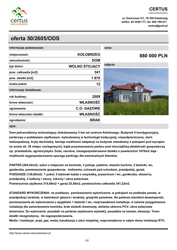 CERTUS nieruchomości ul. Dworcowa 3/1, 78-100 Kołobrzeg tel/fax: 94 3548 777, tel: 604 188 671 [email protected] oferta 50/2605/ODS informacje podstawowe: cena: KOŁOBRZEG miejscowość: typ domu: 880 000 PLN DOM nieruchomość: WOLNO STOJĄCY zdjęcie: 341 pow. całkowita [m2]: 1 870 pow. działki [m2]: 12 liczba pokoi: informacje dodatkowe: 2009 rok budowy: forma własności: ogrzewanie: forma własności działki: WŁASNOŚĆ C.O. GAZOWE WŁASNOŚĆ BRAK ogrodzenie: opis: Dom jednorodzinny wolnostojący zlokalizowany 3 km od centrum Kołobrzegu. Budynek II kondygnacyjny, parterowy z poddaszem użytkowym, wybudowany w technologii tradycyjnej, niepodpiwniczony, dach wielospadowy, kryty dachówką. Istnieje możliwość adaptacji na budynek mieszkalny z pokojami pod wynajem (w sumie ok. 30 miejsc noclegowych), bądź przystosowania parteru pod nieuciążliwą działalność gospodarczą np. przedszkole, agroturystyka. Duża, narożna, niezagospodarowana działka o powierzchni 1870m2 daje możliwość wygospodarowania sporego parkingu dla ewentualnych klientów. PARTER (204,42m2): salon z miejscem na kominek, 3 pokoje, jadalnia, otwarta kuchnia, 2 łazienki, wc, garderoba, pomieszczenie gospodarcze - kotłownia, schowek pod schodami, przedpokój, garaż; PODDASZE (136,80m2): 7 pokoi, 5 łazienek każda z umywalką, prysznicem i wc, garderoba, obszerny przedpokój, 2 balkony / skosy, lukarny i okna połaciowe. Powierzchnia użytkowa 315,66m2 + garaż 25,56m2, powierzchnia całkowita 341,22m2. STANDARD WYKOŃCZENIA: na poddaszu pomieszczenia wykończone, w pokojach na podłodze panele, w przedpokoju terakota, w łazienkach glazura i terakota, grzejniki panelowe. Na parterze standard deweloperski, pomieszczenia do wykończenia z wyjątkiem 1 łazienki i wc, rozprowadzone instalacje, w salonie przygotowana instalacja dla zamontowania kominka, brak stolarki drzwiowej, stolarka okienna PCV, okna połaciowe drewniane. Do wykonania: posadzki na parterze (wykonane wylewki), posadzka na tarasie, elewacja. Teren działki nieogrodzony, do zagospodarowania. Media / instalacje: prąd, gaz, woda, kanalizacja z sieci miejskiej, rozprowadzona w całym domu instalacja RTV, http://www.certus.nieruchomosci.pl 1/2 CERTUS nieruchomości ul. Dworcowa 3/1, 78-100 Kołobrzeg tel/fax: 94 3548 777, tel: 604 188 671 [email protected] ogrzewanie gazowe, piec 2-funkcyjny. LOKALIZACJA: Niekanin, 500 metrów od drogi głównej Kołobrzeg - Białogard, 3 km od centrum Kołobrzegu, 4 km od morza. W sąsiedztwie nowa zabudowa jednorodzinna. MOŻLIWOŚĆ ZAMIANY NA MIESZKANIE W KOŁOBRZEGU ZA DOPŁATĄ. W celu uzyskania szczegółowych informacji o ofercie prosimy o kontakt telefoniczny, bądź mailowy http://www.certus.nieruchomosci.pl 2/2