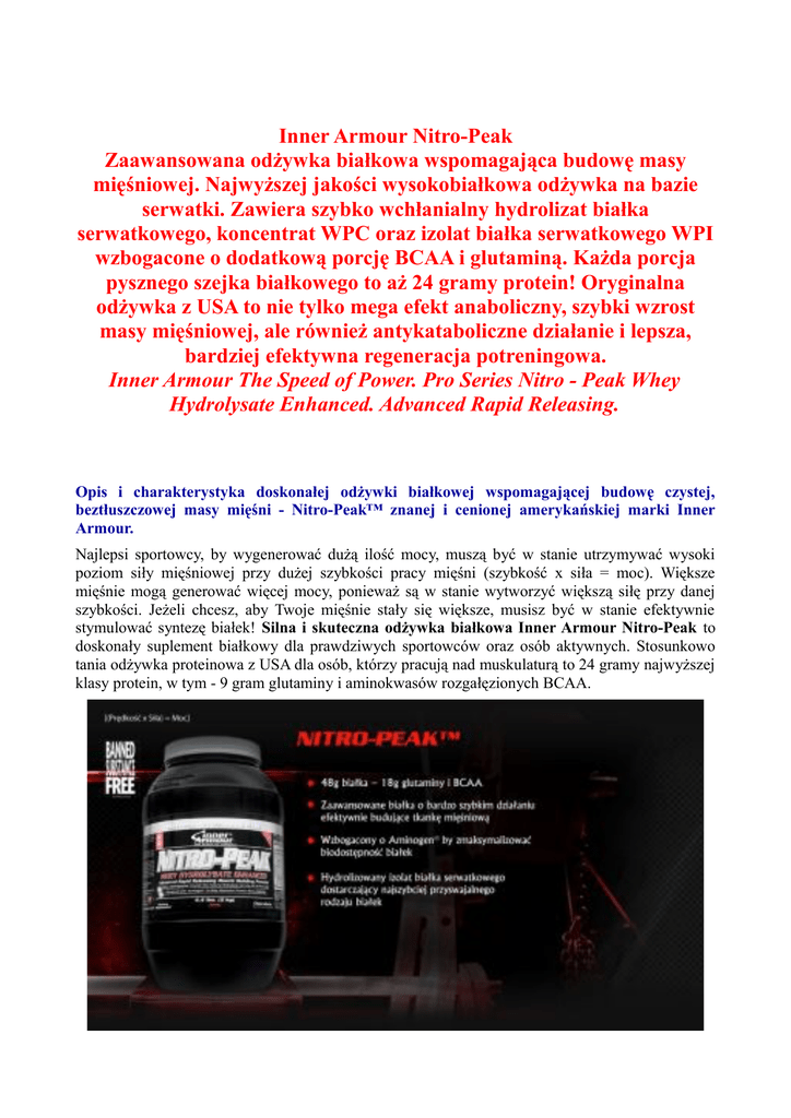Inner Armour Nitro-Peak Zaawansowana odżywka białkowa wspomagająca budowę masy mięśniowej. Najwyższej jakości wysokobiałkowa odżywka na bazie serwatki. Zawiera szybko wchłanialny hydrolizat białka serwatkowego, koncentrat WPC oraz izolat białka serwatkowego WPI wzbogacone o dodatkową porcję BCAA i glutaminą. Każda porcja pysznego szejka białkowego to aż 24 gramy protein! Oryginalna odżywka z USA to nie tylko mega efekt anaboliczny, szybki wzrost masy mięśniowej, ale również antykataboliczne działanie i lepsza, bardziej efektywna regeneracja potreningowa. Inner Armour The Speed of Power. Pro Series Nitro - Peak Whey Hydrolysate Enhanced. Advanced Rapid Releasing. Opis i charakterystyka doskonałej odżywki białkowej wspomagającej budowę czystej, beztłuszczowej masy mięśni - Nitro-Peak™ znanej i cenionej amerykańskiej marki Inner Armour. Najlepsi sportowcy, by wygenerować dużą ilość mocy, muszą być w stanie utrzymywać wysoki poziom siły mięśniowej przy dużej szybkości pracy mięśni (szybkość x siła = moc). Większe mięśnie mogą generować więcej mocy, ponieważ są w stanie wytworzyć większą siłę przy danej szybkości. Jeżeli chcesz, aby Twoje mięśnie stały się większe, musisz być w stanie efektywnie stymulować syntezę białek! Silna i skuteczna odżywka białkowa Inner Armour Nitro-Peak to doskonały suplement białkowy dla prawdziwych sportowców oraz osób aktywnych. Stosunkowo tania odżywka proteinowa z USA dla osób, którzy pracują nad muskulaturą to 24 gramy najwyższej klasy protein, w tym - 9 gram glutaminy i aminokwasów rozgałęzionych BCAA. • • • • • Zalety i korzyści stosowania odżywki białkowej z Ameryki - Nitro Peak od Inner Armour: 24 g najwyższej jakości białka oraz 9 gram L-glutaminy i BCAA w każdej porcji produktu, zaawansowane białko o bardzo szybkim działaniu efektywnie budujące tkankę mięśniową, suplement białkowy został wzbogacony o Aminogen by zmaksymalizować biodostępność odżywki, hydrolizowany izolat białka serwatkowego dostarcza najszybciej przyswajalnego rodzaju białek, doskonała rozpuszczalność preparatu oraz wyśmienity smak! Stymulacja syntezy białek mięśniowych (tworzenie mięśni) dzięki Nitro-Peak™ - najlepsze amerykańskie białko na masę! Badania wykazują, że w przypadku stymulacji wzrostu mięśni SZYBCIEJ ZNACZY LEPIEJ! Amerykańskie białko na masę Nitro-Peak™ zawiera najszybciej wchłaniane białko na świecie hydrolizat izolatu białka serwatki. Badania pokazują, że spożycie szybkodziałających białek o bardzo wysokiej biodostępności zwiększa poziom aminokwasów w krwioobiegu, skąd później pobierane są do mięśni w procesach anabolicznych (wzrostu). Im szybciej wzrasta poziom aminokwasów we krwi tym silniejsza reakcja anaboliczna organizmu. Każda porcja Nitro-Peak™ sprzyja rozwojowi mięśni i chroni je przy pomocy 24 gramów hydrolizatu i izolatu białka serwatkowego naładowanego aminokwasami rozgałęzionymi (BCAA) i glutaminą. Naukowcy odkryli, że te właśnie białka i powstające z nich aminokwasy są dla kulturystów i sportowców najkorzystniejsze, gdyż wchłaniają się najszybciej i tworzą maksymalnie skutecznie pobudzają anabolizm mięśni. Silny i skuteczny suplement sportowy Nitro-Peak™ wprowadza aminokwasy i azot do organizmu z pełną mocą dzięki naszemu proteolitycznemu systemowi enzymów, który w testach wykazał się zdolnością do podnoszenia poziomu BCAA we krwi o niesamowite 250%! Każda porcja Nitro-Peak to zaledwie 3,5 g tłuszczów i 7 g węglowodanów! Nitro-Peak™ rozwija Twoją zdolność do generowania mocy. A jeśli chodzi o maksymalną wydolność organizmu, to właśnie moc charakteryzuje naprawdę doskonałych sportowców! Dawkowanie oraz sposób użycia odżywki białkowej Nitro-Peak: Zmieszać 1 porcję produktu (1 miarka) z 150-170 ml wody lub odtłuszczonego mleka w zależności od pożądanej konsystencji. Dodatkowe porcje mogą być spożywane w celu pokrycia zwiększonego dziennego zapotrzebowania na białko. Produkt nie powinien być stosowany jako substytut (zamiennik) zróżnicowanej diety. Przeciwwskazania i ostrzeżenia: Uczulenie na którykolwiek ze składników produktu. Produkt przeznaczony jest dla osób zdrowych. Długotrwałe przyjmowanie produktu powinno odbywać się pod kontrolą specjalisty z zakresu medycyny. Osoby stosujące produkty lecznicze powinny skonsultować stosowanie preparatu z lekarzem. Produkt zawiera alergeny: białko mleka, soja. Produkt zawiera źródło fenyloalaniny i nie może być stosowany u osób chorych na fenyloketonurię. Opis i charakterystyka preparatu białkowego Nitro-Peak: • 1 porcja = 1 miarka (36 g) odżywki • Ilość porcji w opakowaniu: 55 • Zawartość opakowania: 2 kg Skład produktu dla sportowców siłowych Nitro-Peak od Inner Armour: Zawartość: w jednej porcji Wartość energetyczna [kJ/kcal] 1697/405 628/150 Białko [g] 64,9 24 Węglowodany [g] 18,9 7 W tym cukry [g] 10,8 4 Tłuszcze [g] 9,5 3,5 W tym nasycone [g] 2,7 1 W tym kwasy trans [g] 2,7 1 Cholesterol [mg] 135 50 Błonnik [g] 2,7 1 Sód [mg] 54 20 Wapń [mg] 357 132 Składniki Nitro-Peak: Kompleks białek serwatkowych (koncentrat białek serwatki, izolat białek serwatki, hydrolizowany izolat białek serwatki), fosfoproteinowy kompleks micelarnej kazeiny (kazeina alfa, beta i kappa), tauryna, aminokwasy BCAA (l-leucyna, l-izoleucyna, l-walina), izolat białek mleka (80% białek kazeinowych, 20% białek serwatkowych), laktaza, Aminogen® (kompleks polipeptydowy). Pozostałe składniki odżywki na masę: naturalne i sztuczne aromaty, fruktoza, mąka wzbogacana [(mąka pszenna, żelazo, witamina B1, witamina B2, kwas foliowy), cukier, tłuszcz roślinny, kakao (smak cookies and cream oraz czekoladowy), mąka kukurydziana, czekolada (smak cookies and cream oraz czekoladowy), sól], guma ksantanowa, dwutlenek krzemu, sukraloza. www.kulturystyka.skl