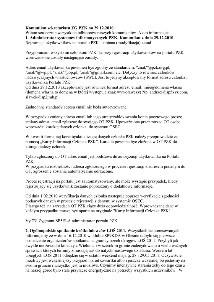 Komunikat sekretariatu ZG PZK na 29.12.2010. Witam serdecznie wszystkich odbiorców naszych komunikatów. A oto informacje: 1. Administrator systemów informatycznych PZK. Komunikat z dnia 29.12.2010. Rejestracja uŜytkowników na portalu PZK - zmiana (modyfikacja) zasad. Przypominam wszystkim członkom PZK, Ŝe przy rejestracji uŜytkowników na portalu PZK wprowadzone zostały następujące zasady. Adres email uŜytkownika powinien być zgodny ze standardem: "znak"@pzk.org.pl, "znak"@wp.pl, "znak"@op.pl, "znak"@gmail.com, etc. Dotyczy to równieŜ członków nadzwyczajnych –nasłuchowców (SWL). Jest to jedyny akceptowany format adresu członka i uŜytkownika Portalu PZK. Od dnia 29.12.2010 akceptowany jest równieŜ format adresu email: imie@domena własna (domena własna to domena w której występuje znak wywoławczy) Np. [email protected], [email protected] śadne inne standardy adresu email nie będą autoryzowane. W przypadku zmiany adresu email lub jego utraty/zablokowania konta pocztowego proszę zmiany adresu email zgłaszać do swojego OT PZK. UpowaŜniona przez zarząd OT osoba wprowadzi korektę danych członka do systemu OSEC. W kwestii formalnej korektę/aktualizację danych członka PZK naleŜy przeprowadzić za pomocą „Karty Informacji Członka PZK”. Karta ta powinna być złoŜona w OT PZK do którego naleŜy członek. Tylko zgłoszony do OT adres email jest podstawa do autoryzacji uŜytkownika na Portalu PZK. W przypadku rozbieŜności adresu zgłoszonego w procesie rejestracji z adresem podanym do OT, zgłoszenie zostanie automatycznie odrzucone. Proces rejestracji na portalu jest zautomatyzowany, ale moŜe wystąpić przypadek, kiedy rejestrujący się uŜytkownik zostanie poproszony o dodatkowe informacje. Od dnia 1.02.2010 weryfikacja danych członka następuje poprzez weryfikację zgodności podanych danych w procesie rejestracji z danymi w systemie OSEC. Dlatego teŜ na zarządach OT PZK ciąŜy duŜa odpowiedzialność. Wprowadzane dane w kaŜdym przypadku muszą być oparte na oryginale "Karty Informacji Członka PZK". Vy 73! Zygmunt SP5ELA administrator portalu PZK 2. Ogólnopolskie spotkanie krótkofalowców ŁOŚ 2011. Wszystkich zainteresowanych informujemy Ŝe w dniu 16.12.2010 w klubie SP9KDA w Oleśnie odbyło się pierwsze posiedzenie organizatorów spotkania na granicy trzech okręgów ŁOŚ 2011. Przybyli jak zwykle nie zawodni koledzy z Wielunia i w szerokim gronie zadecydowano o wielu waŜnych sprawach których terminy zmuszają nas do natychmiastowego działania. Wzorem lat ubiegłych ŁOŚ 2011 odbędzie się w ostatni weekend maja tj. 28 i 29.05.2011. Oczywiście moŜliwy jest wcześniejszy przyjazd np. od czwartku albo i jeszcze wcześniej bo jesteśmy na swoim gruncie i wszystko jest tu moŜliwe. Czynimy intensywne starania Ŝeby do tego czasu na naszej górce było stale przyłącze energetyczne na potrzeby wszystkich uczestników. W programie spotkania przewidujemy jak zwykle prelekcje na najbardziej interesujące tematy /lista prelegentów nie jest jeszcze zamknięta, zapraszamy /, program rozrywkowy, giełda, specjalne atrakcje dla rodzin krótkofalowców, ogólnie dostępny Internet, dobrze zaopatrzony bufet z posiłkiem dla wszystkich uczestników i ognisko. Podobnie jak w latach ubiegłych nadal nie przewidujemy Ŝadnych wcześniejszych zgłoszeń ani przedpłat, a kaŜdy uczestnik otrzyma darmowy identyfikator i pamiątkowy bhuton. Zapewniamy, Ŝe robimy bardzo duŜo Ŝeby wszyscy uczestnicy byli zadowoleni i uśmiechnięci. 73 Zespoły klubowe SP9KDA i SP7KED. 3. Styczniowe QTC. W nowej szacie graficznej ukaŜe się styczniowe wydanie MK QTC, ale z taką samą jak dotychczas porcją wiadomości operatorskich. W numerze 1/2011 wyraźnie widoczny jest charakter miesięcznika. Wszystkie widomości adresowane są do czynnych w eterze radiooperatorów o wyraźnych zainteresowaniach. Są zatem informacje z zakresu zawodów, dotyczące dyplomów, a takŜe DX-ingu. Sporo miejsca poświęcone jest entuzjastom wypraw terenowych do SPFFs, zamków, gmin itp. Jednym słowem wszystkie wiadomości mają charakter wyczynowy i są poŜytecznym narzędziem. Uwagę zwraca analiza krajowych zawodów PGA-TEST 2010, przez które przewinęło się łącznie 465 róŜnych stacji. Są w niej ciekawe dane statystyczne, komentarze i opinie uczestników. Na tych ostatnich oparto się przy opracowywaniu regulaminu na nadchodzący rok. Stacjom indywidualnym i zespołom operatorskim MK QTC proponuje udział w międzynarodowym współzawodnictwie organizowanym przez redakcję amerykańskiego miesięcznika "CQ". Nasza redakcja (QTC) ma w tym teŜ skromny udział. W zasadzie wszystkie teksty są godne polecenia. Dla wnikliwych, wyniki uzyskane w zawodach PGA mogą być doskonałym materiałem do analiz. MoŜe tylko warto zwrócić uwagę na projekty QTC, czyli na to, czym redakcja będzie się zajmowała w 2011 roku. śyczę Czytelnikom i ich rodzinom Szczęśliwego Nowego Roku, dobrego zdrowia, pogody ducha i tolerancji wobec innych. Jednym słowem: Cieszmy się naszym radiowym hobby przez cały nadchodzący rok. Szczególne podziękowania składam krótkofalowcom, którzy nie szczędzili swojego talentu i czasu w pracy na rzecz innych. To dzięki nim współrealizowane są wyczynowe projekty operatorskie: EW4DX SP2LNW SP5ADX SP5DDJ SP5GBT SP5KP SP5LP SP6IEQ SP8WQX SQ7B SQ9E SQ9NFI. Dziękuję takŜe wszystkim korespondentom QTC, których informacje co miesiąc wykorzystywane były w naszym miesięczniku. To dzięki Wam zdołaliśmy wspólnie utrwalić najwaŜniejsze wydarzenia operatorskie. 73s & GL de sp2fap. Spis treści MK QTC 1/2011 ADIF2DXCC dostępny Amerykanin w SP-CFF Astana-Almaty 2011 - Olimpiada Zimowa w UN BV100 Award - nowoczesne procedury Certyfikaty za PGA-TEST XII CQ DX Maraton - roczne współzawodnictwo dla MO CQ DX Maraton - roczne współzawodnictwo dla SO DQR_Log - nowa wersja Drogocenne dyplomy? Dyplomy i Certyfikaty QTC - bezpłatne Ent
