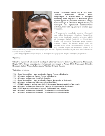 Roman Zakrzewski urodził się w 1955 roku. Ukończył Państwowe Liceum Sztuk Plastycznych w Bielsku-Białej a następnie Akademię Sztuk Pięknych w Krakowie, gdzie uzyskał dyplom w pracowni malarstwa Jerzego Nowosielskiego w 1985 roku. Artysta malarz, od wczesnych lat wykazywał zainteresowanie portretem, który stał się głównym tematem jego twórczości. „ W malarstwie poszukuję prostoty i harmonii oraz piękna duchowego człowieka. Oczywiście, mam swoje inspiracje, swoich mistrzów takich jak Leonardo, Rafael, Botticelli czy Modigliani. Sztuka tych artystów formowała moją postawę twórczą. Piękno, do którego dążyli stało się również moim celem i sensem sztuki. Wierzę, że Bóg powołał artystę do tworzenia piękna i że obowiązkiem artysty jest obrona najwyższych wartości etycznych i estetycznych oraz wnoszenie ich w dzisiejszą rzeczywistość. ” „Tylko Bóg jest prawdziwym artystą. Z niczego stworzył piękno. Artyści muszą się inspirować.” Wystawy: Udział w wystawach zbiorowych i aukcjach charytatywnych w Krakowie, Rzeszowie, Niemczech, Belgii, USA. Obrazy znajdują się w kolekcjach prywatnych w Polsce, USA, Niemczech, Holandii, Hiszpanii, Belgii, Włoszech, Szwajcarii, Wielkiej Brytanii, Japonii. Ważniejsze wystawy: 1986 - Jerzy Nowosielski i jego uczniowie, Galeria Forum w Krakowie. 1989 - Wystawa malarstwa, Galeria Forum w Krakowie. 1996 - Wystawa malarstwa w Art-Club, Kraków. 1999 - Jerzy Nowosielski i jego uczniowie, Galeria Sukiennice w Krakowie. 2002 - Wystawa malarstwa w Muzeum w Bielsku-Białej. 1997 - 2004 Ekspozycja malarstwa w Galerii Katarzyny Napiórkowskiej w Warszawie. 2004 - Wystawa malarstwa w Teatrze im. Wandy Siemaszkowej w Rzeszowie. 2006 - 2007 Wystawa malarstwa w Japonii, Daimaru ( Kobe, Ashiya ). 2008 - Wystawa malarstwa w Holandii, Giardino Galerie & Beeldentuin. 2011 - Wystawa malarstwa w Holandii, Giardino Galerie & Beeldentuin