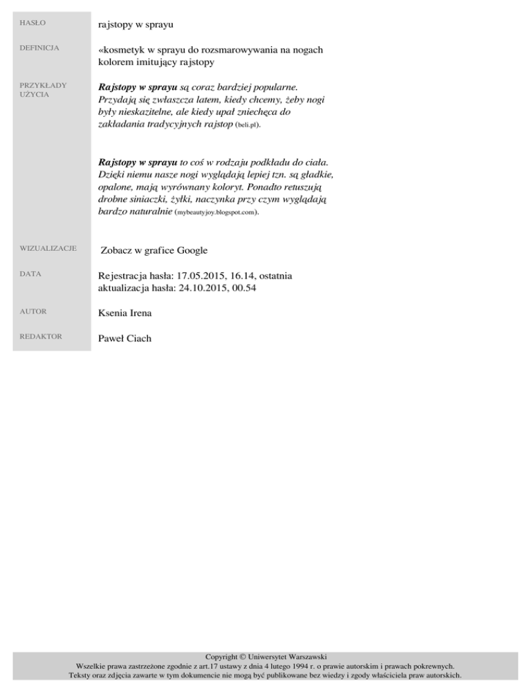 HASŁO rajstopy w sprayu DEFINICJA «kosmetyk w sprayu do rozsmarowywania na nogach kolorem imitujący rajstopy» PRZYKŁADY UŻYCIA Rajstopy w sprayu są coraz bardziej popularne. Przydają się zwłaszcza latem, kiedy chcemy, żeby nogi były nieskazitelne, ale kiedy upał zniechęca do zakładania tradycyjnych rajstop (beli.pl). Rajstopy w sprayu to coś w rodzaju podkładu do ciała. Dzięki niemu nasze nogi wyglądają lepiej tzn. są gładkie, opalone, mają wyrównany koloryt. Ponadto retuszują drobne siniaczki, żyłki, naczynka przy czym wyglądają bardzo naturalnie (mybeautyjoy.blogspot.com). WIZUALIZACJE Zobacz w grafice Google DATA Rejestracja hasła: 17.05.2015, 16.14, ostatnia aktualizacja hasła: 24.10.2015, 00.54 AUTOR Ksenia Irena REDAKTOR Paweł Ciach Copyright © Uniwersytet Warszawski Wszelkie prawa zastrzeżone zgodnie z art.17 ustawy z dnia 4 lutego 1994 r. o prawie autorskim i prawach pokrewnych. Teksty oraz zdjęcia zawarte w tym dokumencie nie mogą być publikowane bez wiedzy i zgody właściciela praw autorskich. Powered by TCPDF (www.tcpdf.org)