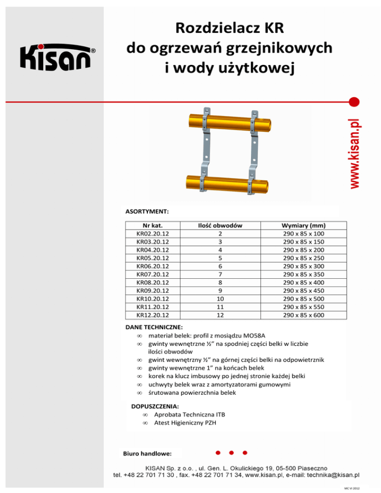Rozdzielacz KR do ogrzewań grzejnikowych i wody użytkowej ASORTYMENT: Nr kat. KR02.20.12 KR03.20.12 KR04.20.12 KR05.20.12 KR06.20.12 KR07.20.12 KR08.20.12 KR09.20.12 KR10.20.12 KR11.20.12 KR12.20.12 Ilość obwodów 2 3 4 5 6 7 8 9 10 11 12 Wymiary (mm) 290 x 85 x 100 290 x 85 x 150 290 x 85 x 200 290 x 85 x 250 290 x 85 x 300 290 x 85 x 350 290 x 85 x 400 290 x 85 x 450 290 x 85 x 500 290 x 85 x 550 290 x 85 x 600 DANE TECHNICZNE: • materiał belek: profil z mosiądzu MO58A • gwinty wewnętrzne ½” na spodniej części belki w liczbie ilości obwodów • gwint wewnętrzny ½” na górnej części belki na odpowietrznik • gwinty wewnętrzne 1” na końcach belek • korek na klucz imbusowy po jednej stronie każdej belki • uchwyty belek wraz z amortyzatorami gumowymi • śrutowana powierzchnia belek DOPUSZCZENIA: • Aprobata Techniczna ITB • Atest Higieniczny PZH Biuro handlowe: MC VI 2012