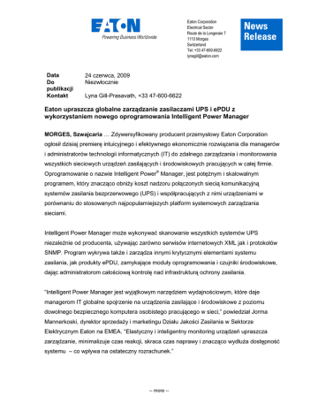 Eaton Corporation Electrical Sector Route de la Longeraie 7 1110 Morges Switzerland Tel: +33 47-600-6622 [email protected] Data Do publikacji Kontakt 24 czerwca, 2009 Niezwłocznie Lyna Gill-Prasavath, +33 47-600-6622 Eaton upraszcza globalne zarządzanie zasilaczami UPS i ePDU z wykorzystaniem nowego oprogramowania Intelligent Power Manager MORGES, Szwajcaria … Zdywersyfikowany producent przemysłowy Eaton Corporation ogłosił dzisiaj premierę intuicyjnego i efektywnego ekonomicznie rozwiązania dla managerów i administratorów technologii informatycznych (IT) do zdalnego zarządzania i monitorowania wszystkich sieciowych urządzeń zasilających i środowiskowych pracujących w całej firmie. Oprogramowanie o nazwie Intelligent Power® Manager, jest potężnym i skalowalnym programem, który znacząco obniży koszt nadzoru połączonych siecią komunikacyjną systemów zasilania bezprzerwowego (UPS) i współpracujących z nimi urządzeniami w porównaniu do stosowanych najpopularniejszych platform systemowych zarządzania sieciami. Intelligent Power Manager może wykonywać skanowanie wszystkich systemów UPS niezależnie od producenta, używając zarówno serwisów internetowych XML jak i protokołów SNMP. Program wykrywa także i zarządza innymi krytycznymi elementami systemu zasilania, jak produkty ePDU, zamykające moduły oprogramowania i czujniki środowiskowe, dając administratorom całościową kontrolę nad infrastrukturą ochrony zasilania. “Intelligent Power Manager jest wyjątkowym narzędziem wydajnościowym, które daje managerom IT globalne spojrzenie na urządzenia zasilające i środowiskowe z poziomu dowolnego bezpiecznego komputera osobistego pracującego w sieci,” powiedział Jorma Mannerkoski, dyrektor sprzedaży i marketingu Działu Jakości Zasilania w Sektorze Elektrycznym Eaton na EMEA. “Elastyczny i inteligentny monitoring urządzeń upraszcza zarządzanie, minimalizuje czas reakcji, skraca czas naprawy i znacząco wydłuża dostępność systemu – co wpływa na ostateczny rozrachunek.” -- more -- Eaton/Page 2 Pełne możliwości oprogramowanie przedstawia skonsolidowany ogląd głównych parametrów eksploatacyjnych wszystkich systemów UPS, które mogą być łatwo konfigurowane zgodnie z typem UPS, lokalizacją, stanem pracy i innymi parametrami zdefiniowanymi przez użytkownika. Poprzez kolorowe kody wyświetlacza oraz personalizowane ekrany, administratorzy mogą aktywować zaawansowane funkcje, takie jak automatyczne zamykanie bezobsługowych serwerów, automatyczne ponowne uruchamianie oraz operacje na systemach operacyjnych zgodnie z założonym harmonogramem, wielu urządzeń w rozproszonych lokalizacjach. Oprogramowanie oferuje także możliwość organizowania urządzeń według kilku różnych kryteriów, na podstawie adresu protokołu internetowego (IP), typu aplikacji lub użytkownika. Użytkownik może przyporządkować automatyczne akcje, takie jak, powiadamianie o zdarzeniach w zasilaniu lub środowisku poprzez e-mail, a także grupować alarmy i prowadzić dziennik zdarzeń do celów okresowych przeglądów prewencyjnych całej bazy zainstalowanych urządzeń. Co więcej, ustawienia kart sieciowych i utrzymanie jest ograniczone do zdalnej jednoczesnej aktualizacji oprogramowania sprzętowego. Intelligent Power Manager jest rozwiązaniem skalowalnym, zarządzającym dowolną ilością urządzeń zasilających w sieci. „Oprogramowanie daje użytkownikom IT, którzy nie mają głębokiej wiedzy o koncepcji jakości zasilania, proste w użyciu narzędzie do zdalnego zarządzania i nadzorowania zbiorem wyposażenia elektrycznego,” powiedział Mannerkoski. Wieloplatformowe, oparte na przeglądarce internetowej oprogramowanie, jest dostarczane z zasilaczami UPS Eaton bezpłatnie maksymalnie dla dziesięciu monitorowanych urządzeń. Więcej informacji znajduje się na stronie www.eaton.com/powerquality. Dział elektryczny firmy Eaton jest globalnym liderem w dystrybucji zasilania, jakości energii, produkcji urządzeń, sterowania i automatyki przemysłowej. Globalny asortyment produktów elektrycznych zawiera rozwiązania Cutler-Hammer®, Moeller®, Powerware®, Holec®, MEM®, Santak®, i MGE Office Protection Systems™, rozwiązania systemowe łańcucha zasilania PowerChain Management® ukierunkowane na klienta do zaspokojenia potrzeb zasilania elektrycznego dla centrów przetwarzania danych, przemysłu, instytucji, rządu, energetyki, sektora komercyjnego i mieszkaniowego oraz rynku OEM na całym świecie. Eaton Corporation jest zdywersyfikowaną firmą specjalizująca się w zarządzaniu energią ze sprzedażą 15,4 mld $ w 2008. Eaton jest globalnym liderem w technologii urządzeń Eaton/Page 3 elektrycznych i systemów jakości energii elektrycznej, rozdziału i sterowania; elementów hydraulicznych, systemów i usług dotyczących urządzeń przemysłowych i mobilnych, systemów paliwowych, hydraulicznych i pneumatycznych dla lotnictwa i kosmonautyki cywilnej i militarnej, systemów napędów samochodów osobowych i ciężarowych w zakresie eksploatacji, zużycia paliwa i bezpieczeństwa. Eaton zatrudnia około 75 000 pracowników i sprzedaje produkty dla klientów w ponad 150 krajach. Więcej informacji znajduje się na stronie www.eaton.com. ###