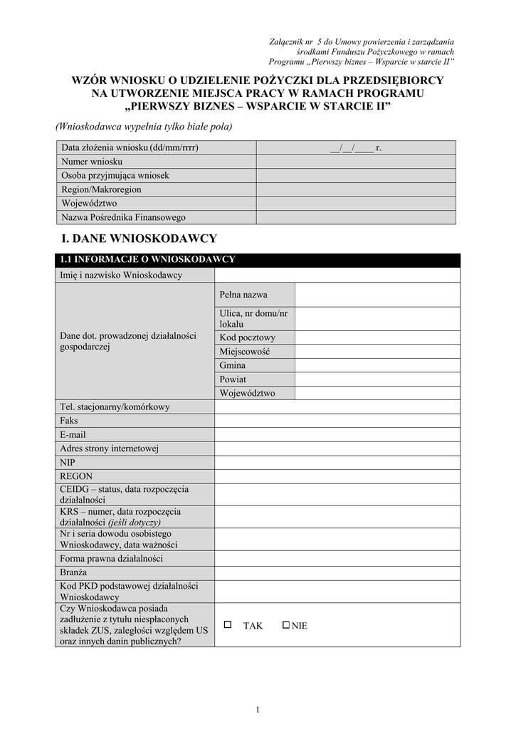 Załącznik nr 5 do Umowy powierzenia i zarządzania środkami Funduszu Pożyczkowego w ramach Programu „Pierwszy biznes – Wsparcie w starcie II” WZÓR WNIOSKU O UDZIELENIE POŻYCZKI DLA PRZEDSIĘBIORCY NA UTWORZENIE MIEJSCA PRACY W RAMACH PROGRAMU „PIERWSZY BIZNES – WSPARCIE W STARCIE II” (Wnioskodawca wypełnia tylko białe pola) Data złożenia wniosku (dd/mm/rrrr) Numer wniosku Osoba przyjmująca wniosek Region/Makroregion Województwo Nazwa Pośrednika Finansowego __/__/____ r. I. DANE WNIOSKODAWCY 1.1 INFORMACJE O WNIOSKODAWCY Imię i nazwisko Wnioskodawcy Pełna nazwa Dane dot. prowadzonej działalności gospodarczej Tel. stacjonarny/komórkowy Faks E-mail Adres strony internetowej NIP REGON CEIDG – status, data rozpoczęcia działalności KRS – numer, data rozpoczęcia działalności (jeśli dotyczy) Nr i seria dowodu osobistego Wnioskodawcy, data ważności Forma prawna działalności Branża Kod PKD podstawowej działalności Wnioskodawcy Czy Wnioskodawca posiada zadłużenie z tytułu niespłaconych składek ZUS, zaległości względem US oraz innych danin publicznych? Ulica, nr domu/nr lokalu Kod pocztowy Miejscowość Gmina Powiat Województwo TAK 1 NIE II. CHARAKTERYSTYKA POŻYCZKI I PLANOWANEGO DO UTWORZENIA MIEJSCA PRACY 2.1 OPIS PLANOWANEGO DO UTWORZENIA MIEJSCA PRACY Opis: Zakres obowiązków: Wymagane kwalifikacje: 2.2 OBECNE PRZYCHODY I KOSZTY PROWADZONEJ DZIAŁALNOŚCI PRZYCHODY (MIESIĘCZNE) Lp. Źródła przychodów Kwota brutto (PLN) 1. 2. 3. … Razem przychody OPIS (PODSTAWY UZYSKIWANYCH PRZYCHODÓW) KOSZTY (MIESIĘCZNE) Lp. Rodzaj kosztu Kwota brutto (PLN) 1. 2. 3. … Razem koszty OPIS (PODSTAWY PONOSZONYCH KOSZTÓW) 2 2.3 PLANOWANE PRZYCHODY I KOSZTY ZWIĄZANE Z UTWORZENIEM MIEJSCA PRACY PLANOWANE PRZYCHODY (MIESIĘCZNE) Źródła przychodów Lp. Kwota brutto(PLN) 1. 2. 3. … Razem przychody OPIS ZAŁOŻEŃ LEŻĄCYCH U PODSTAW PLANOWANYCH PRZYCHODÓW PLANOWANE KOSZTY (MIESIĘCZNE) Lp. Rodzaj kosztu Kwota brutto (PLN) 1. 2. 3. … Razem koszty OPIS ZAŁOŻEŃ LEŻĄCYCH U PODSTAW PLANOWANYCH KOSZTÓW 2.4 INFORMACJA O OSOBIE PLANOWANEJ DO ZATRUDNIENIA W RAMACH TWORZONEGO MIEJSCA PRACY Osoba bezrobotna Osoba bezrobotna skierowana przez powiatowy urząd pracy 2.5 SZCZEGÓŁOWA SPECYFIKACJA I HARMONOGRAM WYDATKÓW W RAMACH WNIOSKOWANEJ POŻYCZKI WYDATKI Planowany termin Lp. Rodzaj wydatku Kwota brutto (PLN) wydatkowania 1. 2. 3. … Razem wydatki OPIS SPOSOBU WYCENY WYDATKÓW Rodzaj źródła Wnioskowana pożyczka Środki własne Inne źródła (jakie?) ………………………………….. Razem źródła finansowania ŹRÓDŁA FINANSOWANIA Kwota brutto(PLN) 3 2.6 INFORMACJA O WNIOSKOWANYCH PARAMETRACH FINANSOWANIA Kwota pożyczki (w tysiącach) Okres spłaty (w miesiącach) Planowana data/y wypłat/y (w transzach lub jednorazowo) 2.7 FORMY ZABEZPIECZENIA SPŁAT NALEŻNOŚCI Z TYTUŁU POŻYCZKI Propozycje zabezpieczenia Weksel in blanco (obowiązkowo) Poręczenie dwóch osób fizycznych Proszę podać imię/ona i nazwisko/a proponowanego/ych poręczyciela/i 1. ………………………………………………………………………………………………. 2. ………………………………………………………………………………………………. Lp. 1. 2. Propozycje innych prawnych zabezpieczeń spłat należności z tytułu pożyczki Rodzaj zabezpieczenia wartość (PLN) III. OŚWIADCZENIA 1. Oświadczam, że wszystkie informacje, które zawarłem/am w niniejszym wniosku oraz dane zamieszczone w załączonych dokumentach są prawdziwe i zgodne z Regulaminem udzielania pożyczek. 2. Oświadczam, że wyrażam zgodę na przetwarzanie i udostępnianie danych przekazanych w niniejszym wniosku i załączanych do niego dokumentach dla potrzeb niezbędnych dla realizacji procesu rozpatrywania i monitorowania pożyczki przez pośrednika finansowego (zgodnie z Ustawą z dnia 29 sierpnia 1997r. o ochronie danych osobowych; tekst jednolity Dz. U. z 2002 roku Nr 101 poz. 926 z późn. zm.). 3. Oświadczam, że nie zostałem/am prawomocnie skazany/a za przestępstwa przeciwko obrotowi gospodarczemu, w rozumieniu ustawy z dnia 6 czerwca 1997 r. Kodeks karny lub ustawy z dnia 28 października 2002 r. o odpowiedzialności podmiotów zbiorowych za czyny zabronione pod groźbą kary, w okresie 2 lat przed dniem złożenia niniejszego wniosku. 4. Oświadczam, że tworzone stanowisko pracy nie jest jednocześnie finansowane w ramach pożyczki i refundacji kosztów wyposażenia i doposażenia stanowiska pracy dla skierowanego bezrobotnego o której mowa w art. 46 ust. 1 pkt 1 i 1a oraz ust. 1a Ustawy o promocji zatrudnienia i instytucjach rynku pracy lub z innych środków publicznych. 5. Zobowiązuję się, że poddam się kontroli, w tym kontroli w siedzibie mojej działalności gospodarczej, która może być dokonywana przez MPiPS, BGK, Pośrednika Finansowego bądź inne uprawnione podmioty w zakresie prawidłowości wykorzystania środków pożyczki i zapewniam prawo wglądu we wszystkie dokumenty i dane związane z udzieloną pożyczką i przedmiotem finansowania ze środków pożyczki w czasie tej kontroli . 6. Zobowiązuję się do przechowywania dokumentacji związanej z udzieloną pożyczką i przedmiotem finansowania ze środków pożyczki przez okres 10 lat od podpisania umowy pożyczki, w sposób zapewniający poufność i bezpieczeństwo. 7. Zobowiązuję się, że wykorzystam środki pożyczki zgodnie z jej przeznaczeniem. 8. Zobowiązuję się, że utrzymam utworzone stanowisko pracy dla osoby bezrobotnej, w tym bezrobotnej skierowanej przez Powiatowy Urząd Pracy przez okres co najmniej 12 miesięcy od dnia zatrudnienia osoby na to stanowisko. 9. Zobowiązuję się do poinformowania z 14 – dniowym wyprzedzeniem, powiatowy urząd pracy oraz pośrednika finansowego o terminie zatrudnienia bezrobotnego oraz potwierdzić zatrudnienie bezrobotnego, w terminie 7 dni od dnia jego zatrudnienia. 10. Zobowiązuję się