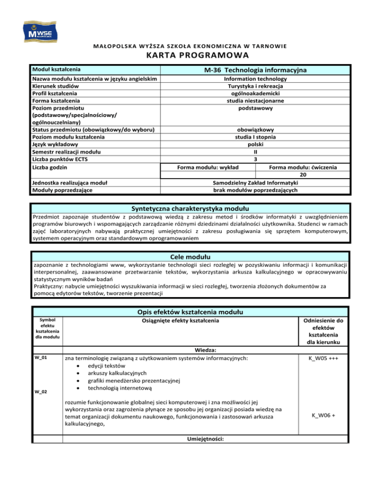 M AŁ O PO L S K A WYŻ SZ A S ZK OŁ A E K ON OM I CZN A W TA RN O WI E KARTA PROGRAMOWA Moduł kształcenia M-36 Technologia informacyjna Nazwa modułu kształcenia w języku angielskim Kierunek studiów Profil kształcenia Forma kształcenia Poziom przedmiotu (podstawowy/specjalnościowy/ ogólnouczelniany) Status przedmiotu (obowiązkowy/do wyboru) Poziom modułu kształcenia Język wykładowy Semestr realizacji modułu Liczba punktów ECTS Liczba godzin Jednostka realizująca moduł Moduły poprzedzające Information technology Turystyka i rekreacja ogólnoakademicki studia niestacjonarne podstawowy obowiązkowy studia I stopnia polski II 3 Forma modułu: wykład Forma modułu: ćwiczenia 20 Samodzielny Zakład Informatyki brak modułów poprzedzających Syntetyczna charakterystyka modułu Przedmiot zapoznaje studentów z podstawową wiedzą z zakresu metod i środków informatyki z uwzględnieniem programów biurowych i wspomagających zarządzanie różnymi dziedzinami działalności użytkownika. Studenci w ramach zajęć laboratoryjnych nabywają praktycznej umiejętności z zakresu posługiwania się sprzętem komputerowym, systemem operacyjnym oraz standardowym oprogramowaniem Cele modułu zapoznanie z technologiami www, wykorzystanie technologii sieci rozległej w pozyskiwaniu informacji i komunikacji interpersonalnej, zaawansowane przetwarzanie tekstów, wykorzystania arkusza kalkulacyjnego w opracowywaniu statystycznym wyników badań Praktyczny: nabycie umiejętności wyszukiwania informacji w sieci rozległej, tworzenia złożonych dokumentów za pomocą edytorów tekstów, tworzenie prezentacji Opis efektów kształcenia modułu Symbol efektu kształcenia dla modułu W_01 W_02 Osiągnięte efekty kształcenia Wiedza: zna terminologię związaną z użytkowaniem systemów informacyjnych: edycji tekstów arkuszy kalkulacyjnych grafiki menedżersko prezentacyjnej technologią internetową rozumie funkcjonowanie globalnej sieci komputerowej i zna możliwości jej wykorzystania oraz zagrożenia płynące ze sposobu jej organizacji posiada wiedzę na temat organizacji dokumentu naukowego, funkcjonowania i zastosowań arkusza kalkulacyjnego, Umiejętności: Odniesienie do efektów kształcenia dla kierunku K_W05 +++ K_W06 + U_01 U_02 U_03 K_01 potrafi przygotować dokument o charakterze naukowym K_U07 +++ ma umiejętności wykorzystania narzędzi informatycznych w przygotowaniu przekazu komunikacyjnego K_U06 ++ potrafi korzystać z systemów internetowych do pozyskiwania wiedzy i wykorzystania ich w samokształceniu Kompetencje społeczne: ma świadomość poziomu własnej wiedzy i umiejętności informatycznych oraz rozumie potrzebę ustawicznego kształcenia się w tej dziedzinie K_U11 +++ K_K01 ++ Treści kształcenia modułu Forma modułu: wykład Forma modułu: ćwiczenia Wprowadzenie do technologii internetowych: a. Protokoły i usługi internetowe b. Zasoby informacyjne sieci www, sieci semantyczne , wyszukiwanie informacji c. Komunikacja interpersonalna w sieci www 2. Zawansowane przetwarzanie tekstów 8h a. Elementy złożonego dokumentu, typografia b. Generowanie spisów treści, indeksów, przypisów c. Elementy składu typograficznego d. Korekta i metody szybkiego przeredagowywania złożonych dokumentów 3. Grafika prezentacyjna i menedżerska a. Elementy prezentacji: - wzorzec slajdu tytułowego i slajdu podstawowego definiowanie wzorców b. przygotowanie konspektu, tworzenie prezentacji na podstawie konspektu zaawansowane elementy prezentacji: animacje, chronometraż 4. Gromadzenie i opracowanie wyników badań za pomocą arkusza kalkulacyjnego a. gromadzenie danych w formie tabelarycznej: sortowanie, wyszukiwanie, selekcja b. graficzna prezentacja wyników c. statystyczne metody opracowania wyników - opracowanie ilościowe danych 1. Literatura podstawowa 1. 2. 3. 4. Literatura uzupełniająca Nowakowski Zdzisław, Europejski Certyfikat Umiejętności Komputerowych moduł 1-6. Warszawa : Mikom : Wydawnictwo Naukowe PWN, cop. 2007 http://pe.mwse.edu.pl/course/view.php?id=9 http://office.microsoft.com/pl-pl/powerpoint-help/CH006255618.aspx http://office.microsoft.com/pl-pl/word-help/CH010224758.aspx 1. Dec Z., Konieczny R.: ABC komputera 2003, Edition, 2000 2. Wykłady z podstaw informatyki, W.Sikorski, Wyd II. Mikom, Warszawa 2005 Metody dydaktyczne pokaz, ćwiczenia laboratoryjne, kursy na platformie e-learningowej
