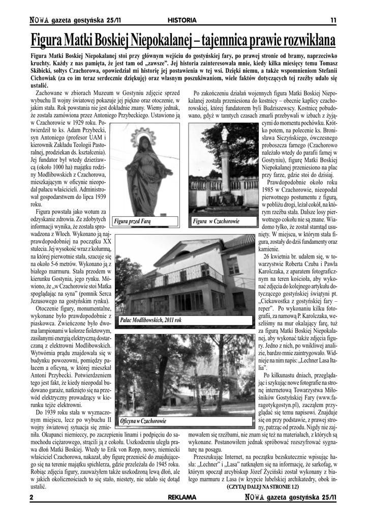 NOWA gazeta gostyñska 25/11 HISTORIA 11 Figura Matki Boskiej Niepokalanej tajemnica prawie rozwik³ana Figura Matki Boskiej Niepokalanej stoi przy g³ównym wejciu do gostyñskiej fary, po prawej stronie od bramy, naprzeciwko kruchty. Ka¿dy z nas pamiêta, ¿e jest tam od zawsze. Jej historia zainteresowa³a mnie, kiedy kilka miesiêcy temu Tomasz Skibicki, so³tys Czachorowa, opowiedzia³ mi historiê jej postawienia w tej wsi. Dziêki niemu, a tak¿e wspomnieniom Stefanii Cichowiak (za co im teraz serdecznie dziêkujê) oraz w³asnym poszukiwaniom, wiele faktów dotycz¹cych tej rzeby uda³o siê ustaliæ. Zachowane w zbiorach Muzeum w Gostyniu zdjêcie sprzed Po zakoñczeniu dzia³añ wojennych figura Matki Boskiej Niepowybuchu II wojny wiatowej pokazuje jej piêkno oraz otoczenie, w kalanej zosta³a przeniesiona do kostnicy obecnie kaplicy czachojakim sta³a. Rok powstania nie jest dok³adnie znany. Wiemy jednak, rowskiej, której fundatorem byli Budziszewscy. Kostnicê pobudo¿e zosta³a zamówiona przez Antoniego Przybeckiego. Ustawiono j¹ wano, gdy¿ w tamtych czasach zmarli przebywali w izbach z ¿yj¹w Czachorowie w 1929 roku. Pocymi do momentu pochówku. Króttwierdzi³ to ks. Adam Przybecki, ko potem, na polecenie ks. Bronisyn Antoniego (profesor UAM i s³awa Siczyñskiego, ówczesnego kierownik Zak³adu Teologii Pastoproboszcza farnego (Czachorowo ralnej, prodziekan ds. kszta³cenia). nale¿a³o wtedy do parafii farnej w Jej fundator by³ wtedy dzier¿awGostyniu), figurê Matki Boskiej c¹ (oko³o 1000 ha) maj¹tku rodziNiepokalanej przeniesiono na plac ny Modlibowskich z Czachorowa, przy farze, gdzie stoi do dzisiaj. mieszkaj¹cym w oficynie nieopoPrawdopodobnie oko³o roku dal pa³acu w³acicieli. Administro1985 w Czachorowie, nieopodal wa³ gospodarstwem do lipca 1939 pierwotnego postumentu z figur¹, roku. w pobli¿u drogi, le¿a³ cokó³, na któFigura powsta³a jako wotum za rym rzeba sta³a. Dalsze losy pierodzyskanie zdrowia. Ze zdobytych Figura przed Far¹ wotnego coko³u nie s¹ znane. WiaFigura w Czachorowie informacji wynika, ¿e zosta³a sprodomo tylko, ¿e zosta³ stamt¹d usuwadzona z W³och. Wykonano j¹ najniêty. W miejscu, w którym sta³a fiprawdopodobniej na pocz¹tku XX gura, zosta³y do dzi fundamenty oraz stulecia. Jej wysokoæ wraz z kolumn¹, kamienie. na której pierwotnie sta³a, szacuje siê 26 kwietnia br. uda³em siê, w tona oko³o 5-6 metrów. Wykonano j¹ z warzystwie Roberta Czuba i Paw³a bia³ego marmuru. Sta³a przodem w Karolczaka, z aparatem fotograficzkierunku Gostynia, jego rynku. Mónym na teren kocio³a, aby wykowiono, ¿e w Czachorowie stoi Matka naæ zdjêcia do kolejnego artyku³u dospogl¹daj¹c na syna (pomnik Serca tycz¹cego gostyñskiej wi¹tyni pt. Jezusowego na gostyñskim rynku). Ciekawostka z gostyñskiej fary Otoczenie figury, monumentalne, reper. Po wykonaniu kilku fotowykonane by³o prawdopodobnie z grafii, za namow¹ P. Karolczaka, wepiaskowca. Zwieñczone by³o dwo- Pa³ac Modlibowskich, 2011 rok szlimy na mur okalaj¹cy farê, tu¿ ma lampionami w kolorze fioletowym, za figur¹ Matki Boskiej Niepokalazasilanymi energi¹ elektryczn¹ dostarnej, aby wykonaæ tak¿e zdjêcia figuczan¹ z elektrowni Modlibowskich. ry. Jedno z nich, po wnikliwej analiWytwórnia pr¹du znajdowa³a siê w zie, bardzo mnie zaintrygowa³o. Widbudynku powozowni, pomiêdzy panieje na nim napis: Lechner Lasa Ita³acem a oficyn¹, w której mieszka³ lia. Antoni Przybecki. Potwierdzeniem Po kilkunastu dniach, przegl¹datego jest fakt, ¿e kiedy nieopodal buj¹c i szykuj¹c nowe fotografie na strodowano gara¿e, natkniêto siê na przenê internetow¹ Towarzystwa Mi³owód elektryczny prowadz¹cy w kieników Gostyñskiej Fary (www.farunku tej¿e elektrowni. ragotykgostyn.pl), zacz¹³em przyDo 1939 roku sta³a w wyznaczogl¹daæ siê temu napisowi. Znajduje nym miejscu, lecz po wybuchu II Oficyna w Czachorowie siê on przy podstawie, z prawej strowojny wiatowej sytuacja siê zmieny, patrz¹c od przodu. Nigdy nie zajni³a. Okupanci niemieccy, po zaczepieniu linami i podpiêciu do sa- mowa³em siê rzebami, nie znam siê te¿ na materia³ach, z których s¹ mochodu ciê¿arowego, str¹cili j¹ z coko³u. Uszkodzeniu uleg³a pra- wykonane. Postanowi³em jednak spróbowaæ rozszyfrowaæ sygnawa d³oñ Matki Boskiej. Wtedy to Erik von Ropp, nowy, niemiecki turê na pos¹gu. w³aciciel Czachorowa, nakaza³, aby figurê przenieæ do znajduj¹cePrzeszukuj¹c Internet, na pocz¹tku bezskutecznie wpisuj¹c hago siê na terenie maj¹tku spichlerza, gdzie przele¿a³a do 1945 roku. s³a: Lechner i Lasa natkn¹³em siê na informacjê, ¿e sarkofag, w Robi¹c zdjêcia figury, zauwa¿y³em tak¿e uszkodzon¹ lew¹ d³oñ, ale którym spocz¹³ arcybiskup Józef ¯yciñski zosta³ wykonany z biaw jakich okolicznociach to siê sta³o, niestety, nie uda³o siê dot¹d ³ego marmuru z Lasa (w krypcie lubelskiej archikatedry, obok inustaliæ. (CZYTAJ DALEJ NA STRONIE 12) 2 REKLAMA NOWA gazeta gostyñska 25/11