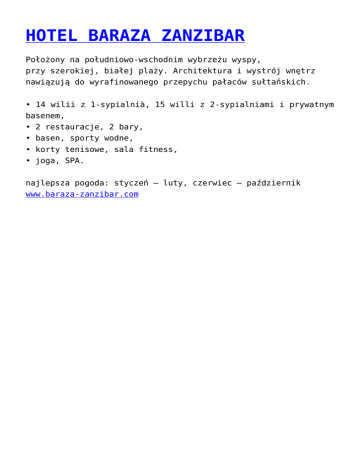 HOTEL BARAZA ZANZIBAR Położony na południowo-wschodnim wybrzeżu wyspy, przy szerokiej, białej plaży. Architektura i wystrój wnętrz nawiązują do wyrafinowanego przepychu pałaców sułtańskich. • 14 wilii z 1-sypialnià, 15 willi z 2-sypialniami i prywatnym basenem, • 2 restauracje, 2 bary, • basen, sporty wodne, • korty tenisowe, sala fitness, • joga, SPA. najlepsza pogoda: styczeń – luty, czerwiec – październik www.baraza-zanzibar.com