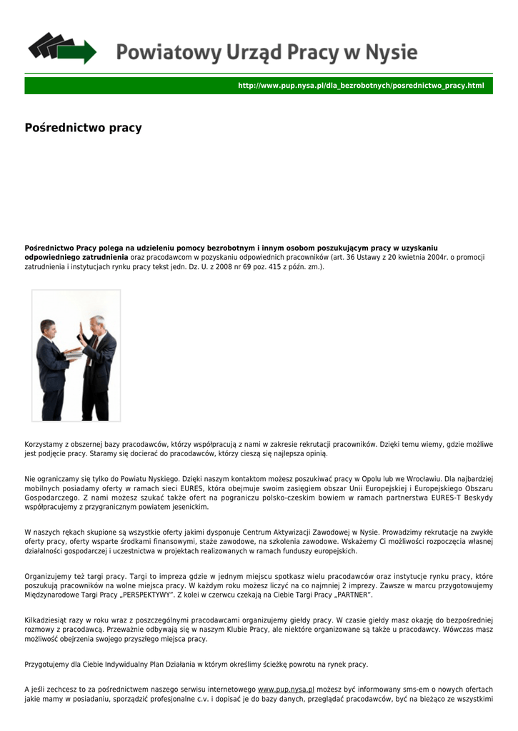 http://www.pup.nysa.pl/dla_bezrobotnych/posrednictwo_pracy.html Pośrednictwo pracy OD 1 LIPCA 2011R. USŁUGA POŚREDNICTWA PRACY ŚWIADCZONA JEST W BUDYNKU CENTRUM AKTYWIZACJI ZAWODOWEJ PRZY POWIATOWYM URZĘDZIE PRACY W NYSIE, UL SŁOWIAŃSKA 19. Pośrednictwo Pracy polega na udzieleniu pomocy bezrobotnym i innym osobom poszukującym pracy w uzyskaniu odpowiedniego zatrudnienia oraz pracodawcom w pozyskaniu odpowiednich pracowników (art. 36 Ustawy z 20 kwietnia 2004r. o promocji zatrudnienia i instytucjach rynku pracy tekst jedn. Dz. U. z 2008 nr 69 poz. 415 z późn. zm.). Korzystamy z obszernej bazy pracodawców, którzy współpracują z nami w zakresie rekrutacji pracowników. Dzięki temu wiemy, gdzie możliwe jest podjęcie pracy. Staramy się docierać do pracodawców, którzy cieszą się najlepsza opinią. Nie ograniczamy się tylko do Powiatu Nyskiego. Dzięki naszym kontaktom możesz poszukiwać pracy w Opolu lub we Wrocławiu. Dla najbardziej mobilnych posiadamy oferty w ramach sieci EURES, która obejmuje swoim zasięgiem obszar Unii Europejskiej i Europejskiego Obszaru Gospodarczego. Z nami możesz szukać także ofert na pograniczu polsko-czeskim bowiem w ramach partnerstwa EURES-T Beskydy współpracujemy z przygranicznym powiatem jesenickim. W naszych rękach skupione są wszystkie oferty jakimi dysponuje Centrum Aktywizacji Zawodowej w Nysie. Prowadzimy rekrutacje na zwykłe oferty pracy, oferty wsparte środkami finansowymi, staże zawodowe, na szkolenia zawodowe. Wskażemy Ci możliwości rozpoczęcia własnej działalności gospodarczej i uczestnictwa w projektach realizowanych w ramach funduszy europejskich. Organizujemy też targi pracy. Targi to impreza gdzie w jednym miejscu spotkasz wielu pracodawców oraz instytucje rynku pracy, które poszukują pracowników na wolne miejsca pracy. W każdym roku możesz liczyć na co najmniej 2 imprezy. Zawsze w marcu przygotowujemy Międzynarodowe Targi Pracy „PERSPEKTYWY”. Z kolei w czerwcu czekają na Ciebie Targi Pracy „PARTNER”. Kilkadziesiąt razy w roku wraz z poszczególnymi pracodawcami organizujemy giełdy pracy. W czasie giełdy masz okazję do bezpośredniej rozmowy z pracodawcą. Przeważnie odbywają się w naszym Klubie Pracy, ale niektóre organizowane są także u pracodawcy. Wówczas masz możliwość obejrzenia swojego przyszłego miejsca pracy. Przygotujemy dla Ciebie Indywidualny Plan Działania w którym określimy ścieżkę powrotu na rynek pracy. A jeśli zechcesz to za pośrednictwem naszego serwisu internetowego www.pup.nysa.pl możesz być informowany sms-em o nowych ofertach jakie mamy w posiadaniu, sporządzić profesjonalne c.v. i dopisać je do bazy danych, przeglądać pracodawców, być na bieżąco ze wszystkimi wydarzeniami na lokalnym rynku pracy. W chwili rejestracji poznajesz swojego pośrednika pracy. Utrzymuj z nim kontakt, bowiem jest on odpowiedzialny za wspieranie Cię w poszukiwaniu pracy. Pośrednictwo pracy: jesteśmy po aby Ci pomagać. Pośrednictwo Pracy jest wykonywane nieodpłatnie i opiera się na następujących zasadach: ● ● ● ● bezpłatności dostępności dobrowolności równości jawności Informacje o aktualnych ofertach pracy zamieszczane są na: ● ● stronie internetowej urzędu pracy, oraz tablicy ogłoszeń zlokalizowanej w siedzibie urzędu. Szczególowe infomacje tel. 19524, 774 489 940