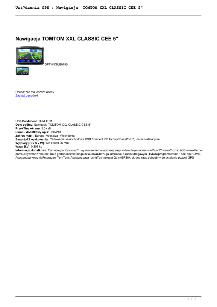 Urz?dzenia GPS : Nawigacja TOMTOM XXL CLASSIC CEE 5" Nawigacja TOMTOM XXL CLASSIC CEE 5" GPTNNGUE0190 Ocena: Nie ma jeszcze oceny Zapytaj o produkt Opis Producent: TOM TOM Opis ogólny: Nawigacja TOMTOM XXL CLASSIC CEE 5" Przek?tna ekranu: 5.0 cali Ekran - dodatkowy opis: 320x240 Zakres map :: Europa ?rodkowa i Wschodnia Zawarto?? opakowania:: ?adowarka samochodowa USB & kabel USB Uchwyt EasyPort™, ulotka instalacyjna Wymiary [G x S x W]: 135 x 90 x 26 mm Waga [kg]: 0.206 kg Informacje dodatkowe: Technologia IQ routes™: wyznaczenie najszybszej trasy w dowolnym momenciePami?? wewn?trzna: 2GB wewn?trznej pami?ci?ywotno?? baterii: Do 3 godzin niezale?nego dzia?aniaObs?uga informacji o ruchu drogowym (TMC)Oprogramowanie TomTom HOME, Asystent parkowaniaFotoradary TomTom, Asystent pasa ruchuTechnologia QuickGPSfix: skraca czas potrzebny do ustalenia pozycji GPS 1 / 1 Powered by TCPDF (www.tcpdf.org)