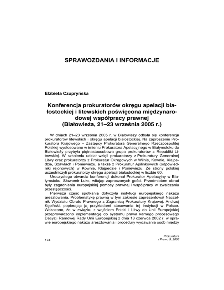 E. Czupryńska SPRAWOZDANIA I INFORMACJE Elżbieta Czupryńska Konferencja prokuratorów okręgu apelacji białostockiej i litewskich poświęcona międzynarodowej współpracy prawnej (Białowieża, 21–23 września 2005 r.) W dniach 21–23 września 2005 r. w Białowieży odbyła się konferencja prokuratorów litewskich i okręgu apelacji białostockiej. Na zaproszenie Prokuratora Krajowego – Zastępcy Prokuratora Generalnego Rzeczpospolitej Polskiej wystosowane w imieniu Prokuratora Apelacyjnego w Białymstoku do Białowieży przybyła piętnastoosobowa grupa prokuratorów z Republiki Litewskiej. W szkoleniu udział wzięli prokuratorzy z Prokuratury Generalnej Litwy oraz prokuratorzy z Prokuratur Okręgowych w Wilnie, Kownie, Kłajpedzie, Szawlach i Poniewieżu, a także z Prokuratur Apilinkowych (odpowiedniki rejonowych) w Kownie, Kłajpedzie i Poniewieżu. Ze strony polskiej uczestniczyli prokuratorzy okręgu apelacji białostockiej w liczbie 60. Uroczystego otwarcia konferencji dokonał Prokurator Apelacyjny w Białymstoku, Sławomir Luks, witając zaproszonych gości. Przedmiotem obrad były zagadnienia europejskiej pomocy prawnej i współpracy w zwalczaniu przestępczości. Pierwsza część spotkania dotyczyła instytucji europejskiego nakazu aresztowania. Problematykę prawną w tym zakresie zaprezentował Naczelnik Wydziału Obrotu Prawnego z Zagranicą Prokuratury Krajowej, Andrzej Kępiński, popierając ją przykładami stosowania tej instytucji w Polsce. Wskazano, że w związku z wejściem Polski i Litwy do Unii Europejskiej przeprowadzono implementację do systemu prawa karnego procesowego Decyzji Ramowej Rady Unii Europejskiej z dnia 13 czerwca 2002 r. w sprawie europejskiego nakazu aresztowania i procedury wydawania osób między 174 Prokuratura i Prawo 5, 2006 Konferencja prokuratorów okręgu apelacji... Państwami Członkowskimi. Decyzja weszła w życie w państwach członkowskich z dniem 1 stycznia 2004 r., zaś w stosunku do państw nowo przyjętych obowiązuje od dnia 1 maja 2004 r. W trakcie wykładu zwrócono szczególną uwagę na skutki obowiązku implementacji Decyzji Ramowej i poważne spory w doktrynie prawa karnoprocesowego i konstytucyjnego wywołane zagadnieniem ekstradycji własnych obywateli. Zaprezentowano treść wyroku Trybunału Konstytucyjnego z dnia 27 kwietnia 2005 r. stwierdzającego niezgodność unormowań artykułu 607t § 1 k.p.k. w zakresie, w jakim zezwala na przekazanie obywatela polskiego do państwa członkowskiego Unii Europejskiej na podstawie europejskiego nakazu aresztowania, z artykułem 55 ust. 1 Konstytucji Rzeczypospolitej Polskiej. Wywołało to ożywioną dyskusję, w trakcie której prokuratorzy litewscy podzielili się uwagami na temat stosowania ENA w praktyce i umiejscowieniu jego w systemie prawa litewskiego. Okazało się, że dotychczas problem konstytucyjności wydawania własnych obywateli nie wynikł na Litwie, choć również i Konstytucja litewska zawiera zakaz ekstradycji własnych obywateli. W trakcie dyskusji wymieniano doświadczenia i ujawniano różnice w przesłankach stosowania i treści tego pojęcia w obu krajach, wymogach formalnych i trybie podejmowania decyzji. Zwrócono uwagę na konieczność kontynuowania wspólnych szkoleń międzynarodowych mających na celu ujednolicenie interpretacji stosowania przepisów dotyczących europejskiego nakazu aresztowania i harmonijnej współpracy w dziedzinie obrotu prawnego w tym zakresie między obu krajami. Kolejną część tematyczną stanowiła problematyka przestępczości zorganizowanej i narzędzi procesowych wykorzystywanych w jej zwalczaniu. Ze strony polskiej tematykę tę zaprezentował prokurator Prokuratury Krajowej, przedstawiciel Biura do Spraw Przestępczości Zorganizowanej, wskazując na wykorzystanie w praktyce instytucji świadka koronnego i świadka anonimowego. Przedstawiono także instrumenty prawne wprowadzone w celu poprawy współpracy międzynarodowej w sprawach karnych Protokołem Dodatkowym Rady Europy z dnia 16 października 2001 r., takie jak: przesłuchanie w drodze konferencji video bądź telefonicznej, obserwacja transgraniczna, dostawy kontrolowane, niejawne dochodzenia, kontrola połączeń telekomunikacyjnych itp. Przedstawiciel prokuratury litewskiej zaprezentował obowiązujące na Litwie uregulowania prawne mające na celu ochronę osób – uczestników procesu karnego. Skupiono się następnie na przestępczości przygranicznej po zmianie granic unijnych ze szczególnym uwzględnieniem nielegalnej migracji osób i handlu żywym towarem. Ze strony polskiej prawne aspekty powyższego Prokuratura i Prawo 5, 2006 175 E. Czupryńska zagadnienia zaprezentował prokurator z Prokuratury Krajowej, Krzysztof Karsznicki. Przedstawił on rys historyczny zjawiska oraz zwrócił uwagę na ewolucję funkcji Polski w tym procederze z kraju, z którego głównie pochodziły kobiety świadczące usługi seksualne w Europie Zachodniej (przede wszystkim w Niemczech i Holandii), do roli kraju tranzytowego i docelowego dla kobiet pochodzących z państw powstałych po rozpadzie Związku Radzieckiego i innych krajów Europy Południowo-Wschodniej. Zaznaczył, iż statystycznie najwięcej ofiar pochodzi z Ukrainy i Białorusi, zaś werbowaniem kobiet zajmują się osoby pochodzące z tego samego co ofiary kraju. Wykorzystanie ofiar następuje już w kraju docelowym. W Polsce aktywnością w tym procederze wyróżniają się obywatele Bułgarii, pochodzący z miasta Dobricz koło Warny. Powyższy wykład stał się przyczynkiem do dyskusji i wymiany doświadczeń w zakresie regulacji prawnych dotyczących tego przestępczego zjawiska w obu krajach. Zwrócono uwagę na obowiązywanie ratyfikowanej przez Polskę, jak i przez Litwę, Konwencji Narodów Zjednoczonych przeciwko międzynarodowej przestępczości zorganizowanej, uzupełnionej następnie Protokołem Dodatkowym o zapobieganiu, zwalczaniu oraz karaniu handlu ludźmi, w szczegó