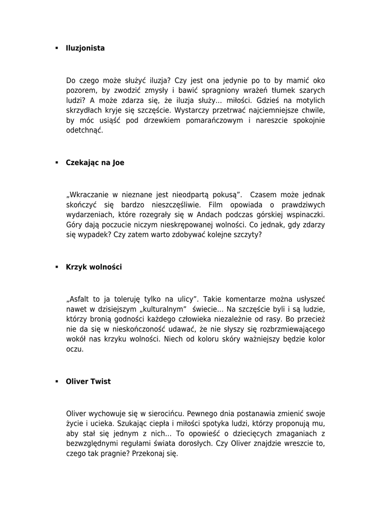 Iluzjonista Do czego może służyć iluzja? Czy jest ona jedynie po to by mamić oko pozorem, by zwodzić zmysły i bawić spragniony wrażeń tłumek szarych ludzi? A może zdarza się, że iluzja służy… miłości. Gdzieś na motylich skrzydłach kryje się szczęście. Wystarczy przetrwać najciemniejsze chwile, by móc usiąść pod drzewkiem pomarańczowym i nareszcie spokojnie odetchnąć. Czekając na Joe „Wkraczanie w nieznane jest nieodpartą pokusą”. Czasem może jednak skończyć się bardzo nieszczęśliwie. Film opowiada o prawdziwych wydarzeniach, które rozegrały się w Andach podczas górskiej wspinaczki. Góry dają poczucie niczym nieskrępowanej wolności. Co jednak, gdy zdarzy się wypadek? Czy zatem warto zdobywać kolejne szczyty? Krzyk wolności „Asfalt to ja toleruję tylko na ulicy”. Takie komentarze można usłyszeć nawet w dzisiejszym „kulturalnym” świecie… Na szczęście byli i są ludzie, którzy bronią godności każdego człowieka niezależnie od rasy. Bo przecież nie da się w nieskończoność udawać, że nie słyszy się rozbrzmiewającego wokół nas krzyku wolności. Niech od koloru skóry ważniejszy będzie kolor oczu. Oliver Twist Oliver wychowuje się w sierocińcu. Pewnego dnia postanawia zmienić swoje życie i ucieka. Szukając ciepła i miłości spotyka ludzi, którzy proponują mu, aby stał się jednym z nich… To opowieść o dziecięcych zmaganiach z bezwzględnymi regułami świata dorosłych. Czy Oliver znajdzie wreszcie to, czego tak pragnie? Przekonaj się. Robinson Crusoe Jak trudno zbudować sobie dom, gdy się ma do dyspozycji tylko własny mózg i parę rąk. Jak trudno zmierzyć się z lękiem o własne życie podglądając z ukrycia dzikie rytuały ludożerców. Jak dobrze jest mieć kogoś, kto ci jest oddany i na kim możesz polegać… Dolina Issy „Litwo, ojczyzno moja…” ojczyzno dzieci, niespełnionych miłości, zdrady wyznawanych ideałów… Film Konwickiego to zaproszenie w świat realnych ludzkich namiętności, niepokojów, rozterek i zbrodni przenikający się ze światem mitycznych duchów, diabłów i demonów. Czy jednak Issa rzeczywiście przepływa przez Litwę? Wytęż wzrok i powiedz… czy nie dostrzegasz jej nurtu wśród krajobrazów własnego serca? Bez mojej zgody „Może powinni Państwo pomyśleć o jeszcze jednym dziecku?” I w ten oto sposób jedna siostra stała się warsztatem części zamiennych dla drugiej. Kochała siostrę i była posłuszna rodzicom. Aż do czasu… Ten film to opowieść o ludzkich dylematach, wyborach i ich konsekwencjach, o przeżywanej szybko młodości i przyśpieszonym dorastaniu. A jakiż koniec tej historii? Sam zobacz. Zaskoczy Cię. Kto nigdy nie żył. „Życie, mój panie to jest ubieranie w umieranie”, jak słusznie zauważa Ernest Bryll. Czemu więc śmierć wciąż nas zaskakuje? Czemu przeraża? Czy wiara może pomóc poradzić sobie z wyrokiem cierpienia? Powinna… zwłaszcza, gdy ów wyrok dotyczy … księdza. Ale czy pomoże także wtedy, gdy wyrok brzmi: AIDS? „…a śmierć, proszę pana to jest rozbieranie z umierania” Popiełuszko - wolność jest w nas. „Akurat jestem wolny.” – od tych słów zaczęła się dziwna przygoda ks. Jerzego. I tak oto, przez wszechobecną szarość zalegającą Smutny Ziemniaczany Kraj, z wolna począł przebijać się listek nadziei. Bo być prawdziwie wolnym to otworzyć się na ludzi i czekające nas w życiu wyzwania. Bez względu na konsekwencje… Dzieci Ireny Sendlerowej. „Kto ratuje jedno życie – uratował cały świat”. A kto ratuje wiele ludzkich istnień? Ileż odwagi, zdolności do poświęceń i mocy może tkwić w słabej na pozór kobiecie. Przekonajmy się. Generał Nil „Przed generałem Nilem Baczność!”. Film jest swego rodzaju portretem zapomnianego już bohatera Augusta Emila Fieldorfa. Zapomnianego, choć przecież żyjącego stosunkowo niedawno. To portret człowieka, który walczy, kocha, wydaje rozkazy, ale także potrafi rozumieć i współczuć… Kubuś i Hefalumpy Był sobie kiedyś las… Stumilowy las. Któż nie pamięta przygód sympatycznego Misia i jego przyjaciół? Tym razem postanawiają oni zbadać sprawę tajemniczych odgłosów i niespotykanych wcześniej śladów, które pojawiły się w stumilowym lesie… Jak zakończy się ekspedycja tej dzielnej drużyny? Dziadek i ja. Bywa, że rodzice nie maja czasu lub cierpliwości do swoich pociech. Na szczęście jest ktoś taki jak dziadek. Ktoś spokojny, opanowany, cierpliwy. Ktoś, kto odpowie na każde pytanie. Kiedy go brakuje świat staje się niemożliwie pusty. Szczególnie świat małego chłopca. Teraz sam musi sobie odpowiedzieć na najważniejsze życiowe pytania. Jak sobie z tym poradzi? Anioł w Krakowie. Wierzysz w Anioły? Nie, nie, tylko nie mówi, że to bajki. Są na świecie ludzie, którzy doświadczyli ich obecności wręcz namacalnie. Może to Twoi sąsiedzi? Może dziecko bawiące się w podwórkowej piaskownicy? Anioły są wszędzie. Czasem człowieczeją i nie możesz ich już odróżnić od ludzi, ale to nie znaczy, że przestały istnieć. Sam sprawdź. Zmruż oczy. Może trzeba czasem uciec od wielkomiejskiego zgiełku. Wtedy zwalnia czas, można leniwie przymknąć oczy i poddać się rytmowi natury… Chociaż, gdy jest się kilkuletnią dziewczynką trudno o tym samodzielnie decydować. No, chyba, że ma się sprzymierzeńca.