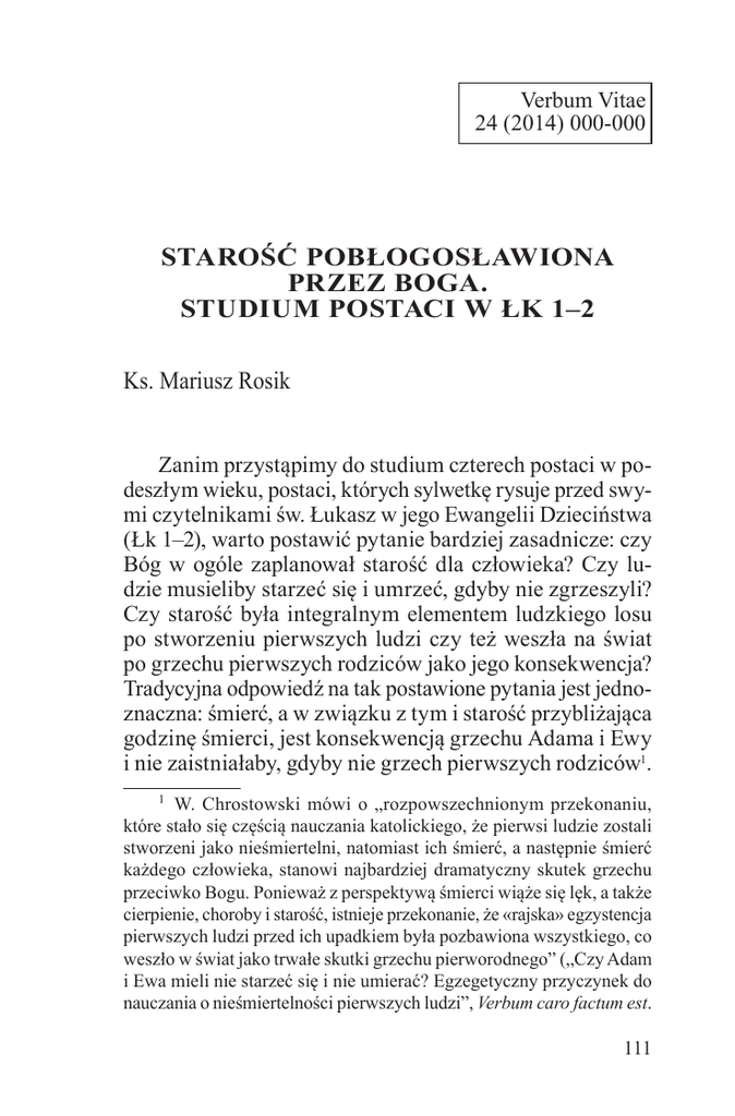 Verbum Vitae 24 (2014) 000-000 Starość pobłogosławiona przez Boga. Studium postaci w Łk 1–2 Ks. Mariusz Rosik Zanim przystąpimy do studium czterech postaci w podeszłym wieku, postaci, których sylwetkę rysuje przed swymi czytelnikami św. Łukasz w jego Ewangelii Dzieciństwa (Łk 1–2), warto postawić pytanie bardziej zasadnicze: czy Bóg w ogóle zaplanował starość dla człowieka? Czy ludzie musieliby starzeć się i umrzeć, gdyby nie zgrzeszyli? Czy starość była integralnym elementem ludzkiego losu po stworzeniu pierwszych ludzi czy też weszła na świat po grzechu pierwszych rodziców jako jego konsekwencja? Tradycyjna odpowiedź na tak postawione pytania jest jednoznaczna: śmierć, a w związku z tym i starość przybliżająca godzinę śmierci, jest konsekwencją grzechu Adama i Ewy i nie zaistniałaby, gdyby nie grzech pierwszych rodziców1. 1 W. Chrostowski mówi o „rozpowszechnionym przekonaniu, które stało się częścią nauczania katolickiego, że pierwsi ludzie zostali stworzeni jako nieśmiertelni, natomiast ich śmierć, a następnie śmierć każdego człowieka, stanowi najbardziej dramatyczny skutek grzechu przeciwko Bogu. Ponieważ z perspektywą śmierci wiąże się lęk, a także cierpienie, choroby i starość, istnieje przekonanie, że «rajska» egzystencja pierwszych ludzi przed ich upadkiem była pozbawiona wszystkiego, co weszło w świat jako trwałe skutki grzechu pierworodnego” („Czy Adam i Ewa mieli nie starzeć się i nie umierać? Egzegetyczny przyczynek do nauczania o nieśmiertelności pierwszych ludzi”, Verbum caro factum est. 111 Jednak badania egzegetyczne i teologiczne prowadzone w ostatnich dekadach nakazują raczej powstrzymanie się od tak jednoznacznej odpowiedzi. 1. Starość Bożym planem? – wprowadzenie do studium postaci Zanim przyjrzymy się czterem postaciom w podeszłym wieku, których wizerunek nakreślił Łukasz ewangelista w swej Ewangelii Dzieciństwa (Łk 1–2), warto poczynić pewne uwagi natury ogólnej. Pytanie o to, czy Bóg zaplanował ludzką śmierć, a w związku z tym także i starzenie się ludzi, łączy się nierozerwalnie z pytaniem o przemijanie. A tu egzegeci nie mają wątpliwości: przemijanie od początku wpisane było w naturę stworzonego przez Boga świata. W przepięknej pieśni o stworzeniu, zwanej niekiedy „pierwszym opisem stworzenia świata” (Rdz 1,1–2,4a), przemawia za tym wiele argumentów: Bóg stwarza rośliny, zdolne produkować nasiona, co jednoznacznie wskazuje na proces wegetatywny (Rdz 1,11-12); stwarza Słońce i Księżyc, które w naturalny sposób funkcjonowały jako wyznaczniki upływającego czasu (Rdz 1,14-18); stworzył zwierzęta i pobłogosławił ich płodność, nakazując wręcz rozmnażanie się (Rdz 1,20-25). Stworzenie więc poddane jest zasadzie przemijalności, a co za tym idzie – konieczności starzenia się. Czy można przypuścić, aby człowiek wyłączony był spod tego prawa? Nie ulega wątpliwości, że człowiek zdecydowanie wyróżnia się od pozostałych dzieł stworzonych i to z powodu świadomego zamysłu Boga, który stwarza istotę ludzką na swój obraz i podobieństwo (Rdz 1,26-27). Według ujęcia tradycyjnego podobieństwo i obraz Boży w człowieku obejmuje aspekt nieśmiertelności fizycznej. Czy jednak ujęcie takie jest usprawiedliwione bez zastrzeżeń? Najpierw Księga pamiątkowa dla Księdza Profesora Tomasza Jelonka w 70. rocznicę urodzin [red. R. Bogacz – W. Chrostowski] [Warszawa 2007] 152). 112 trzeba zwrócić uwagę, że Bóg pobłogosławił człowieka w jego płciowym zróżnicowaniu i nakazał rozmnażanie się i czynienie ziemi poddaną. Polecenie rodzenia potomstwa oznacza nic innego jak rozwój człowieka, począwszy od okresu prenatalnego. W takiej perspektywie „[…] groteskowa byłaby sugestia, że na jakimś etapie, np. gdy chłopiec i dziewczyna osiągają dojrzałość i są fizycznie najpiękniejsi, ich «rajski» rozwój zatrzymał się i tę młodość mieliby zachować na całą wieczność”2. Nie ma w omawianym tekście opisu stworzenia człowieka podstaw do takich stwierdzeń. Podobnie rzecz ma się z tzw. drugim opisem stworzenia człowieka (Rdz 2,4b-24). Tu z ust Boga wychodzi bezpośrednia groźba śmierci: „Ze wszystkich drzew tego ogrodu możesz spożywać z całą swobodą, natomiast z drzewa poznania dobra i zła nie wolno ci jeść, bo gdy z niego spożyjesz, niechybnie umrzesz” (Rdz 2,16-17). Czy wolno nam na ślepo przyjąć, że chodzi tu o śmierć fizyczną? Czy autor nie ma raczej na myśli śmierci rozumianej jako duchowe oddzielenie od Boga, pozbawienie się Jego miłości? To drugie opowiadanie bardziej jeszcze niż pierwsze przesycone jest elementami ludzkiej cielesności i płciowości, które wyraźnie wskazują na podleganie ludzi prawu przemijania. Zauważmy, że chodzi o pierwszą parę ludzką jeszcze przed popełnieniem grzechu pierworodnego. Do przemijania nawiązuje choćby stwierdzenie Boga, że człowiek opuszcza ojca i matkę, by połączyć się ze swą żoną (Rdz 2,24). To wyraźne nawiązanie do kolejnych etapów ludzkiego życia. A skoro mowa o kolejnych etapach ludzkiego życia podlegającego przemijaniu, to także o procesie starzenia się. Ponieważ dyskusja teologów na temat tego, czy i w jakim sensie śmierć fizyczna i starość są konsekwencjami grzechu pierwszych rodziców, jest niezwykle skomplikowana i obejmuje wiele wątków, świadomie unikając próby jednoznacznej odpowiedzi na tak postawione pytania, po2 165. Chrostowski, „Czy Adam i Ewa mieli nie starzeć się i nie umierać?”, 113 wiedzmy tylko tyle: współczesna teologia otwiera możliwość przyjęcia wstępnej tezy, że człowiek podlegałby procesowi starzenia się (i śmierci fizycznej), nawet gdyby nie doszło do grzechu pierwszych rodziców. Grzech ten z całą pewnością wpłynął na ów proces, co nie oznacza jednak, że samo istnienie starości koniecznie mus