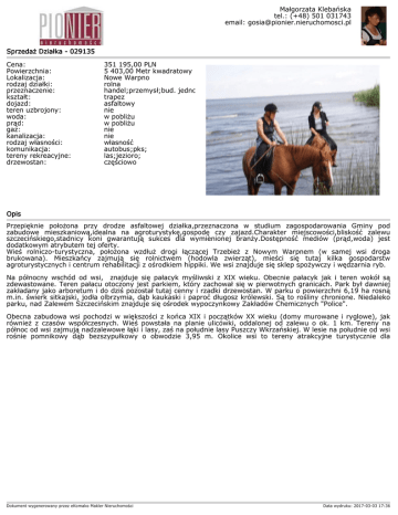 Małgorzata Klebańska tel.: (+48) 501 031743 email: [email protected] Sprzedaż Działka - 029135 Cena: Powierzchnia: Lokalizacja: rodzaj działki: przeznaczenie: kształt: dojazd: teren uzbrojony: woda: prąd: gaz: kanalizacja: rodzaj własności: komunikacja: tereny rekreacyjne: drzewostan: 351 195,00 PLN 5 403,00 Metr kwadratowy Nowe Warpno rolna handel;przemysł;bud. jednorodzinne; trapez asfaltowy nie w pobliżu w pobliżu nie nie własność autobus;pks; las;jezioro; częściowo Opis Przepięknie położona przy drodze asfaltowej działka,przeznaczona w studium zagospodarowania Gminy pod zabudowe mieszkaniową,idealna na agroturystykę,gospodę czy zajazd.Charakter miejscowości,bliskość zalewu szczecińskiego,stadnicy koni gwarantują sukces dla wymienionej branży.Dostępność mediów (prąd,woda) jest dodatkowym atrybutem tej oferty. Wieś rolniczo-turystyczna, położona wzdłuż drogi łączącej Trzebież z Nowym Warpnem (w samej wsi droga brukowana). Mieszkańcy zajmują się rolnictwem (hodowla zwierząt), mieści się tutaj kilka gospodarstw agroturystycznych i centrum rehabilitacji z ośrodkiem hippiki. We wsi znajduje się sklep spożywczy i wędzarnia ryb. Na północny wschód od wsi, znajduje się pałacyk myśliwski z XIX wieku. Obecnie pałacyk jak i teren wokół są zdewastowane. Teren pałacu otoczony jest parkiem, który zachował się w pierwotnych granicach. Park był dawniej zakładany jako arboretum i do dziś pozostał tutaj cenny i rzadki drzewostan. W parku o powierzchni 6,19 ha rosną m.in. świerk sitkajski, jodła olbrzymia, dąb kaukaski i paproć długosz królewski. Są to rośliny chronione. Niedaleko parku, nad Zalewem Szczecińskim znajduje się ośrodek wypoczynkowy Zakładów Chemicznych "Police". Obecna zabudowa wsi pochodzi w większości z końca XIX i początków XX wieku (domy murowane i ryglowe), jak również z czasów współczesnych. Wieś powstała na planie ulicówki, oddalonej od zalewu o ok. 1 km. Tereny na północ od wsi zajmują nadzalewowe łąki i lasy, zaś na południe lasy Puszczy Wkrzańskiej. W lesie na południe od wsi rośnie pomnikowy dąb bezszypułkowy o obwodzie 3,95 m. Okolice wsi to tereny atrakcyjne turystycznie dla Dokument wygenerowany przez eKomako Makler Nieruchomości Data wydruku: 2017-03-03 17:36