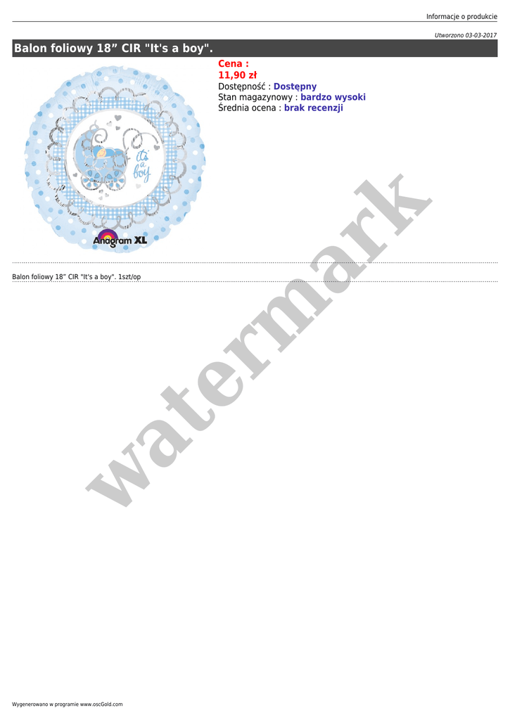 Informacje o produkcie Utworzono 03-03-2017 Balon foliowy 18” CIR "It's a boy". Cena : 11,90 zł w at Balon foliowy 18” CIR "It's a boy". 1szt/op er m ar k Dostępność : Dostępny Stan magazynowy : bardzo wysoki Średnia ocena : brak recenzji Wygenerowano w programie www.oscGold.com