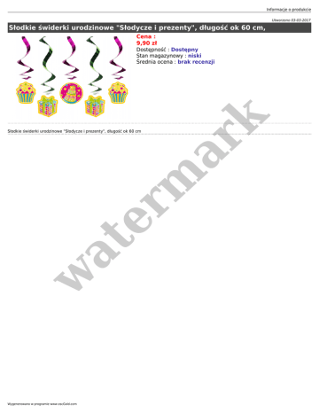 Informacje o produkcie Utworzono 03-03-2017 Słodkie świderki urodzinowe "Słodycze i prezenty", długość ok 60 cm, Cena : 9,90 zł er m ar k Dostępność : Dostępny Stan magazynowy : niski Średnia ocena : brak recenzji w at Słodkie świderki urodzinowe "Słodycze i prezenty", długość ok 60 cm Wygenerowano w programie www.oscGold.com