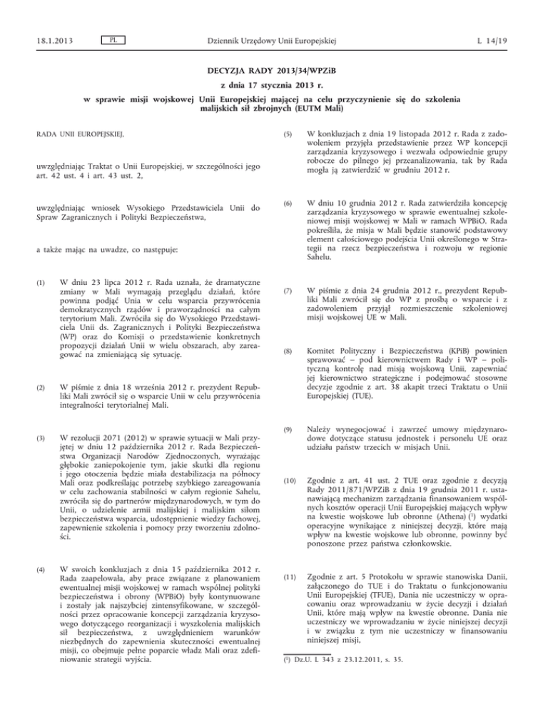 18.1.2013 PL Dziennik Urzędowy Unii Europejskiej L 14/19 DECYZJA RADY 2013/34/WPZiB z dnia 17 stycznia 2013 r. w sprawie misji wojskowej Unii Europejskiej mającej na celu przyczynienie się do szkolenia malijskich sił zbrojnych (EUTM Mali) RADA UNII EUROPEJSKIEJ, (5) W konkluzjach z dnia 19 listopada 2012 r. Rada z zado woleniem przyjęła przedstawienie przez WP koncepcji zarządzania kryzysowego i wezwała odpowiednie grupy robocze do pilnego jej przeanalizowania, tak by Rada mogła ją zatwierdzić w grudniu 2012 r. (6) W dniu 10 grudnia 2012 r. Rada zatwierdziła koncepcję zarządzania kryzysowego w sprawie ewentualnej szkole niowej misji wojskowej w Mali w ramach WPBiO. Rada pokreśliła, że misja w Mali będzie stanowić podstawowy element całościowego podejścia Unii określonego w Stra tegii na rzecz bezpieczeństwa i rozwoju w regionie Sahelu. (7) W piśmie z dnia 24 grudnia 2012 r., prezydent Repub liki Mali zwrócił się do WP z prośbą o wsparcie i z zadowoleniem przyjął rozmieszczenie szkoleniowej misji wojskowej UE w Mali. (8) Komitet Polityczny i Bezpieczeństwa (KPiB) powinien sprawować – pod kierownictwem Rady i WP – poli tyczną kontrolę nad misją wojskową Unii, zapewniać jej kierownictwo strategiczne i podejmować stosowne decyzje zgodnie z art. 38 akapit trzeci Traktatu o Unii Europejskiej (TUE). (9) Należy wynegocjować i zawrzeć umowy międzynaro dowe dotyczące statusu jednostek i personelu UE oraz udziału państw trzecich w misjach Unii. (10) Zgodnie z art. 41 ust. 2 TUE oraz zgodnie z decyzją Rady 2011/871/WPZiB z dnia 19 grudnia 2011 r. usta nawiającą mechanizm zarządzania finansowaniem wspól nych kosztów operacji Unii Europejskiej mających wpływ na kwestie wojskowe lub obronne (Athena) (1) wydatki operacyjne wynikające z niniejszej decyzji, które mają wpływ na kwestie wojskowe lub obronne, powinny być ponoszone przez państwa członkowskie. (11) Zgodnie z art. 5 Protokołu w sprawie stanowiska Danii, załączonego do TUE i do Traktatu o funkcjonowaniu Unii Europejskiej (TFUE), Dania nie uczestniczy w opra cowaniu oraz wprowadzaniu w życie decyzji i działań Unii, które mają wpływ na kwestie obronne. Dania nie uczestniczy we wprowadzaniu w życie niniejszej decyzji i w związku z tym nie uczestniczy w finansowaniu niniejszej misji, uwzględniając Traktat o Unii Europejskiej, w szczególności jego art. 42 ust. 4 i art. 43 ust. 2, uwzględniając wniosek Wysokiego Przedstawiciela Unii do Spraw Zagranicznych i Polityki Bezpieczeństwa, a także mając na uwadze, co następuje: (1) W dniu 23 lipca 2012 r. Rada uznała, że dramatyczne zmiany w Mali wymagają przeglądu działań, które powinna podjąć Unia w celu wsparcia przywrócenia demokratycznych rządów i praworządności na całym terytorium Mali. Zwróciła się do Wysokiego Przedstawi ciela Unii ds. Zagranicznych i Polityki Bezpieczeństwa (WP) oraz do Komisji o przedstawienie konkretnych propozycji działań Unii w wielu obszarach, aby zarea gować na zmieniającą się sytuację. (2) W piśmie z dnia 18 września 2012 r. prezydent Repub liki Mali zwrócił się o wsparcie Unii w celu przywrócenia integralności terytorialnej Mali. (3) W rezolucji 2071 (2012) w sprawie sytuacji w Mali przy jętej w dniu 12 października 2012 r. Rada Bezpieczeń stwa Organizacji Narodów Zjednoczonych, wyrażając głębokie zaniepokojenie tym, jakie skutki dla regionu i jego otoczenia będzie miała destabilizacja na północy Mali oraz podkreślając potrzebę szybkiego zareagowania w celu zachowania stabilności w całym regionie Sahelu, zwróciła się do partnerów międzynarodowych, w tym do Unii, o udzielenie armii malijskiej i malijskim siłom bezpieczeństwa wsparcia, udostępnienie wiedzy fachowej, zapewnienie szkolenia i pomocy przy tworzeniu zdolno ści. (4) W swoich konkluzjach z dnia 15 października 2012 r. Rada zaapelowała, aby prace związane z planowaniem ewentualnej misji wojskowej w ramach wspólnej polityki bezpieczeństwa i obrony (WPBiO) były kontynuowane i zostały jak najszybciej zintensyfikowane, w szczegól ności przez opracowanie koncepcji zarządzania kryzyso wego dotyczącego reorganizacji i wyszkolenia malijskich sił bezpieczeństwa, z uwzględnieniem warunków niezbędnych do zapewnienia skuteczności ewentualnej misji, co obejmuje pełne poparcie władz Mali oraz zdefi niowanie strategii wyjścia. (1) Dz.U. L 343 z 23.12.2011, s. 35. L 14/20 PL Dziennik Urzędowy Unii Europejskiej PRZYJMUJE NINIEJSZĄ DECYZJĘ: Artykuł 1 Misja 1. Unia prowadzi wojskową misję szkoleniową (EUTM Mali), w celu świadczenia doradztwa wojskowego oraz doradztwa w zakresie szkolenia na południu Mali na rzecz malijskich sił zbrojnych działających pod kontrolą prawowitych władz cywil nych, w celu przyczynienia się do odzyskania przez nie zdol ności wojskowej z myślą o umożliwieniu im przeprowadzania operacji wojskowych mających na celu przywrócenie integral ności terytorialnej Mali oraz ograniczenie zagrożenia ze strony ugrupowań terrorystycznych. EUTM nie może uczestniczyć w operacjach bojowych. 2. Celem EUTM Mali jest reagowanie na potrzeby operacyjne malijskich sił zbrojnych przez zapewnienie: a) wsparcia szkoleniowego na rzecz zdolności malijskich sił zbrojnych; b) szkolenia i doradztwa w zakresie dowodzenia i kontroli, łańcucha logistycznego i zasobów ludzkich, jak również szkolenia w zakresie międzynarodowego prawa humanitar nego, ochrony ludności cywilnej oraz praw człowieka. 3. EUTM Mali dąży do poprawy warunków dla sprawowania przez prawowite władze cywilne należytej kontroli politycznej nad malijskimi siłami zbrojnymi. 4. Działania EUTM Mali prowadzone są w ścisłej koordynacji z innymi podmiotami zaangażowanymi we wspieranie malij skich sił zbrojnych, w szczególności z Organizacją Narodów Zjednoczonych (ONZ) i Wspólnotą Gospodarczą Państw Afryki Zachodniej (ECOWAS). Artykuł 2 18.1.2013 do EUTM Mali. Rada 