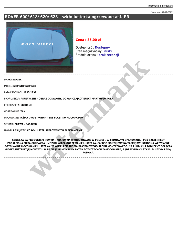 Informacje o produkcie Utworzono 03-03-2017 ROVER 600/ 618/ 620/ 623 - szkło lusterka ogrzewane asf. PR Cena : 35,00 zł MARKA: ROVER MODEL: 600/ 618/ 620/ 623 LATA PRODUKCJI: 1993-1999 er m ar k Dostępność : Dostępny Stan magazynowy : niski Średnia ocena : brak recenzji PROFIL SZKŁA: ASFERYCZNE - OBRAZ ODDALONY, OGRANICZAJĄCY EFEKT MARTWEGO POLA KOLOR SZKŁA: SREBRNE OGRZEWANIE: TAK MOCOWANIE: TAŚMA DWUSTRONNA - BEZ PLASTIKU MOCUJĄCEGO STRONA: PRAWA - PASAŻER UWAGI: PASUJE TYLKO DO LUSTER STEROWANYCH ELEKTRYCZNIE w at SZKIEŁKA SĄ PRODUKTEM NOWYM - KRAJOWYM (PRODUKOWANE W POLSCE), W FIRMOWYM OPAKOWANIU. POD SZKŁEM JEST PODKLEJONA MATA GRZEWCZA UMOŻLIWIAJĄCA OGRZEWANIE LUSTERKA. CAŁOŚĆ MONTUJEMY NA TAŚMĘ DWUSTRONNĄ WE WŁASNE ORYGINALNE MOCOWANIE LUSTERKA. W KOMPLECIE NIE MA PLASTIKOWEGO SPODU MONTAŻOWEGO. NA PUDEŁKU PRODUCENT DOŁĄCZA KRÓTKĄ INSTRUKCJĘ MONTAŻU. W RAZIE JAKICHKOLWIEK PYTAŃ DOTYCZĄCYCH ZAMOCOWANIA, BĄDŻ WYMIANY SZKIEŁ SŁUŻYMY RADĄ I POMOCĄ.