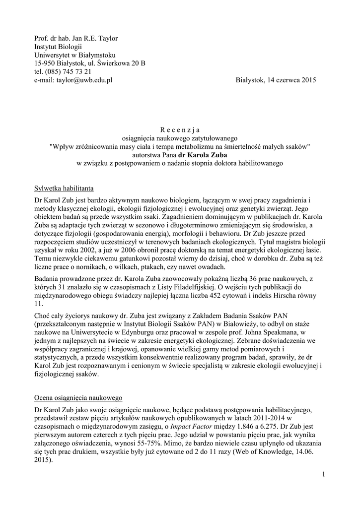 Prof. dr hab. Jan R.E. Taylor Instytut Biologii Uniwersytet w Białymstoku 15-950 Białystok, ul. Świerkowa 20 B tel. (085) 745 73 21 e-mail: [email protected] Białystok, 14 czerwca 2015 Recenzja osiągnięcia naukowego zatytułowanego "Wpływ zróżnicowania masy ciała i tempa metabolizmu na śmiertelność małych ssaków" autorstwa Pana dr Karola Zuba w związku z postępowaniem o nadanie stopnia doktora habilitowanego Sylwetka habilitanta Dr Karol Zub jest bardzo aktywnym naukowo biologiem, łączącym w swej pracy zagadnienia i metody klasycznej ekologii, ekologii fizjologicznej i ewolucyjnej oraz genetyki zwierząt. Jego obiektem badań są przede wszystkim ssaki. Zagadnieniem dominującym w publikacjach dr. Karola Zuba są adaptacje tych zwierząt w sezonowo i długoterminowo zmieniającym się środowisku, a dotyczące fizjologii (gospodarowania energią), morfologii i behawioru. Dr Zub jeszcze przed rozpoczęciem studiów uczestniczył w terenowych badaniach ekologicznych. Tytuł magistra biologii uzyskał w roku 2002, a już w 2006 obronił pracę doktorską na temat energetyki ekologicznej łasic. Temu niezwykle ciekawemu gatunkowi pozostał wierny do dzisiaj, choć w dorobku dr. Zuba są też liczne prace o nornikach, o wilkach, ptakach, czy nawet owadach. Badania prowadzone przez dr. Karola Zuba zaowocowały pokaźną liczbą 36 prac naukowych, z których 31 znalazło się w czasopismach z Listy Filadelfijskiej. O wejściu tych publikacji do międzynarodowego obiegu świadczy najlepiej łączna liczba 452 cytowań i indeks Hirscha równy 11. Choć cały życiorys naukowy dr. Zuba jest związany z Zakładem Badania Ssaków PAN (przekształconym następnie w Instytut Biologii Ssaków PAN) w Białowieży, to odbył on staże naukowe na Uniwersytecie w Edynburgu oraz pracował w zespole prof. Johna Speakmana, w jednym z najlepszych na świecie w zakresie energetyki ekologicznej. Zebrane doświadczenia we współpracy zagranicznej i krajowej, opanowanie wielkiej gamy metod pomiarowych i statystycznych, a przede wszystkim konsekwentnie realizowany program badań, sprawiły, że dr Karol Zub jest rozpoznawanym i cenionym w świecie specjalistą w zakresie ekologii ewolucyjnej i fizjologicznej ssaków. Ocena osiągnięcia naukowego Dr Karol Zub jako swoje osiągnięcie naukowe, będące podstawą postępowania habilitacyjnego, przedstawił zestaw pięciu artykułów naukowych opublikowanych w latach 2011-2014 w czasopismach o międzynarodowym zasięgu, o Impact Factor między 1.846 a 6.275. Dr Zub jest pierwszym autorem czterech z tych pięciu prac. Jego udział w powstaniu pięciu prac, jak wynika załączonego oświadczenia, wynosi 55-75%. Mimo, że bardzo niewiele czasu upłynęło od ukazania się tych prac drukiem, wszystkie były już cytowane od 2 do 11 razy (Web of Knowledge, 14.06. 2015). 1 Przedstawione prace to: [1]. Zub K, Szafrańska PA, Konarzewski M, Speakman JR. 2011. Effect of energetic constraints on distribution and winter survival of weasel males. Journal of Animal Ecology 80: 259-269. IF=4.937, 11 cytowań, 45 pkt MNiSW. [2]. Zub K, Piertney S, Szafrańska PA, Konarzewski M. 2012. Environmental and genetic influences on body mass and resting metabolic rates (RMR) in a natural population of weasel Mustela nivalis. Molecular Ecology 21: 1283-1293. IF= 6.275, 9 cytowań, 40 pkt MNiSW. [3]. McDevitt AD, Oliver MK, Piertney SB, Szafrańska PA, Konarzewski M, Zub K. 2013. Individual variation in dispersal associated with phenotype influences fine-scale genetic structure in weasels. Conservation Genetics 14: 499-509. IF=1.846, 4 cytowania, 20 pkt MNiSW. [4]. Zub K, Fletcher QE, Szafrańska PA, Konarzewski M. 2013. Male weasels decrease activity and energy expenditure in response to high ambient temperatures. PLoS ONE 8: 1-7. IF=3.534, 2 cytowania, 40 pkt MNiSW. [5]. Zub K, Borowski Z, Szafrańska PA, Wieczorek M, Konarzewski M. 2014. Lower body mass and higher metabolic rate enhance winter survival in root voles, Microtus oeconomus. Biological Journal of the Linnean Society 113: 297-309. IF=2.535, 3 cytowania, 20 pkt MNiSW. Obiektem badań w czterech z pięciu prac, składających się na osiągnięcie naukowe, jest łasica, mały drapieżny ssak o bardzo wysokich wymaganiach energetycznych i silnie wyrażonym dymorfizmie płciowym. Okazał się on idealnym obiektem do rozpatrywania kwestii ogólnobiologicznych. Dużym problemem w badaniach nad znaczeniem masy ciała jest jej mała zmienność w obrębie gatunku, co uniemożliwia stwierdzenie istotnych zależności między masą przeżywalnością. Tymczasem łasice charakteryzują się aż trzykrotną jej zmiennością. Gatunek ten jest także ciekawy z tego względu, że duże rozmiary samców, ważne w okresie rozrodu, mogą być niekorzystne w zimie, gdyż pociągają za sobą większe zapotrzebowanie na pokarm. W pracy opublikowanej w „Journal of Animal Ecology” [praca 1], Autor wykazał, że sytuacja nie jest tak prosta – większe osobniki zasiedlały bardziej produktywne siedliska, co zniwelowało wpływ masy ciała na zimową śmiertelność. Uzasadnienia tego wniosku dostarczył ogromny i unikalny materiał przedstawiony w pracy, uzyskany przez ważenie schwytanych łasic, pomiar ich otłuszczenia, pomiar tempa metabolizmu i aktywności w naturalnych warunkach. Dane te umożliwiły Autorowi skonstruowanie modelu skutecznie przewidującego, jak łasice różnej wielkości mogą zbilansować swój budżet energetyczny polując na duże i małe ofiary, a jednocześnie minimalizując czas polowania, podczas którego są narażone na ataki innych drapieżników. Dużym walorem tej pracy jest wykazanie, że wymagania energetyczne osobników, związane z rozmiarami ciała, wpływają na ich przestrzenne rozmieszczenie w bardzo małej skali – sąsiadujących siedlisk. Wyróżnia to tę pracę na tle szeroko analizowanych wielkoobszarowych wzorców geograficznej zmienności masy ciała, zwłaszcza w kontekś