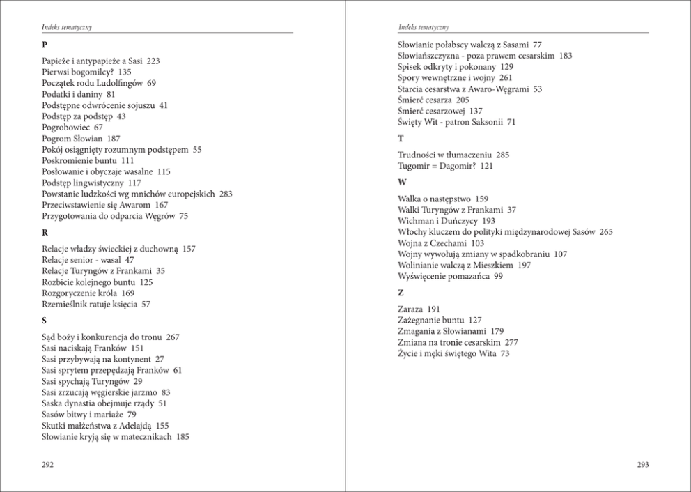 Indeks tematyczny Indeks tematyczny P Słowianie połabscy walczą z Sasami 77 Słowiańszczyzna - poza prawem cesarskim 183 Spisek odkryty i pokonany 129 Spory wewnętrzne i wojny 261 Starcia cesarstwa z Awaro-Węgrami 53 Śmierć cesarza 205 Śmierć cesarzowej 137 Święty Wit - patron Saksonii 71 Papieże i antypapieże a Sasi 223 Pierwsi bogomilcy? 135 Początek rodu Ludolfingów 69 Podatki i daniny 81 Podstępne odwrócenie sojuszu 41 Podstęp za podstęp 43 Pogrobowiec 67 Pogrom Słowian 187 Pokój osiągnięty rozumnym podstępem 55 Poskromienie buntu 111 Posłowanie i obyczaje wasalne 115 Podstęp lingwistyczny 117 Powstanie ludzkości wg mnichów europejskich 283 Przeciwstawienie się Awarom 167 Przygotowania do odparcia Węgrów 75 R Relacje władzy świeckiej z duchowną 157 Relacje senior - wasal 47 Relacje Turyngów z Frankami 35 Rozbicie kolejnego buntu 125 Rozgoryczenie króla 169 Rzemieślnik ratuje księcia 57 S Sąd boży i konkurencja do tronu 267 Sasi naciskają Franków 151 Sasi przybywają na kontynent 27 Sasi sprytem przepędzają Franków 61 Sasi spychają Turyngów 29 Sasi zrzucają węgierskie jarzmo 83 Saska dynastia obejmuje rządy 51 Sasów bitwy i mariaże 79 Skutki małżeństwa z Adelajdą 155 Słowianie kryją się w matecznikach 185 292 T Trudności w tłumaczeniu 285 Tugomir = Dagomir? 121 W Walka o następstwo 159 Walki Turyngów z Frankami 37 Wichman i Duńczycy 193 Włochy kluczem do polityki międzynarodowej Sasów 265 Wojna z Czechami 103 Wojny wywołują zmiany w spadkobraniu 107 Wolinianie walczą z Mieszkiem 197 Wyświęcenie pomazańca 99 Z Zaraza 191 Zażegnanie buntu 127 Zmagania z Słowianami 179 Zmiana na tronie cesarskim 277 Życie i męki świętego Wita 73 293