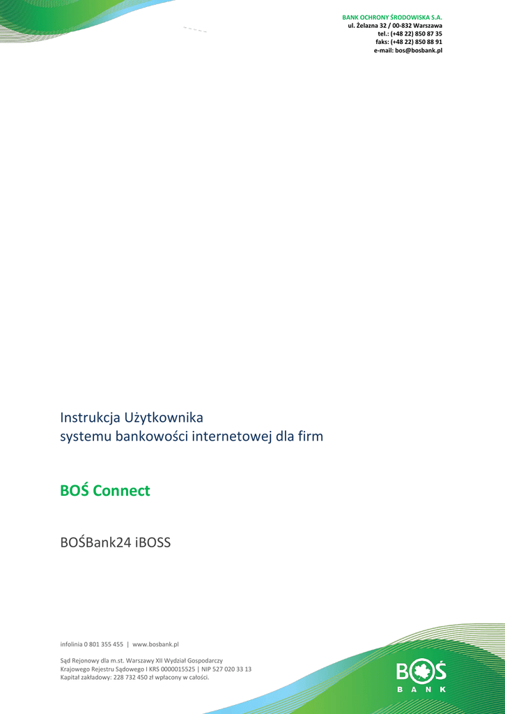 BANK OCHRONY ŚRODOWISKA S.A. ul. Żelazna 32 / 00-832 Warszawa tel.: (+48 22) 850 87 35 faks: (+48 22) 850 88 91 e-mail: [email protected] 2. Instrukcja Użytkownika systemu bankowości internetowej dla firm BOŚ Connect BOŚBank24 iBOSS infolinia 0 801 355 455 | www.bosbank.pl Sąd Rejonowy dla m.st. Warszawy XII Wydział Gospodarczy Krajowego Rejestru Sądowego I KRS 0000015525 | NIP 527 020 33 13 Kapitał zakładowy: 228 732 450 zł wpłacony w całości. BOŚ Connect 1.Opis usługi Usługa BOŚ Connect zapewni komunikację w postaci automatycznej wymiany danych pomiędzy systemem bankowości internetowej a systemem finansowo – księgowym Klienta za pomocą usług sieciowych. BOŚ Connect jest usługą skierowaną do wszystkich Klientów z pionu Korporacyjnego BOŚ Bank S.A., którzy korzystają z BOŚBank24 iBOSS. Usługa zapewnia połączenie online szyfrowane, dzięki któremu Klient bezpośrednio z systemu finansowo - księgowego będzie mógł pobierać i wysyłać dane. BOŚ Connect zapewnia połączenie oraz wymianę danych pomiędzy systemem BOSBank24 iBOSS, a systemami finansów-księgowym. Dzięki usłudze Klienci mogą z poziomu swojego systemu FK/ERP przekazywać dane bezpośrednio do systemu BOŚBank24 iBOSS. Usługa umożliwi pobieranie danych z bankowości elektronicznej bezpośrednio z systemu FK/ERP. Wdrożenie usługi pozwoli Klientom Korporacyjnym na korzystanie z funkcji: pobierania informacji: wyciągów, historii operacji, salda na rachunkach, statusów wystawionych zleceń, statusów wystawionych dyspozycji Poleceń Zapłaty, raportów Masowych Płatności Przychodzących, wysłania zleceń: przelewów zwykłych, przelewów walutowych, przelewów ZUS, przelewów US, przelewów SEPA i Target2, paczek zleceń. Po wdrożeniu usługi BOŚ Connect Klient będzie miał możliwość podpisania zleceń wysyłanych z poziomu systemu FK/ERP, które będzie walidowane podczas wysyłki komunikatów do systemu bankowości elektronicznej. Wprowadzenie podpisu i jego walidacja zapewnia zautomatyzowanie przekazywania zleceń np. przelewów i ich realizacji bez konieczności korzystania z systemów bankowości elektronicznej. Instrukcja użytkownika systemu bankowości internetowej dla firm BOŚBank24 iBOSS Strona 2 Usługa BOŚ Connect oparta jest na standardach wymiany danych w zakresie wykorzystywanych protokołów, bezpieczeństwa i formatów. Podstawowym protokołem transportu danych jest SOAP (Simple Object Access Protocol), a język opisujący usługi sieciowe to WSDL. Formaty komunikatów xml, którymi posługuje się usługa będą zgodne z formatami przedstawionymi w „Rekomendacji Rady Bankowości Elektronicznej ZBP w sprawie przyjęcia standardu wymiany danych finansowych pomiędzy klientem a bankiem oraz bankiem a klientem na rynku polskim wersja 2.00”. Formaty tworzone są również w oparciu o normę ISO 20022. Bezpieczeństwo wymiany danych zapewnia dwustronne uwierzytelnienie SSL. 2. Uruchomienie usługi: Uruchomienie usługi BOŚ Connect odbywa się po podpisaniu Umowy z Klientem. Klient wraz z Umową otrzymuję Specyfikację Techniczną na podstawie, której dokonuje modyfikacji swojego systemu FK/ERP. W tym samym czasie występuje Wnioskiem elektronicznym w BOŚBank24 iBOSS o uwierzytelnienie połączenia poprzez nadanie certyfikatu. Bank po otrzymaniu wniosku odpowiada w BOŚBank24 iBOSS przesyłając gotowy certyfikat. Klient implementuje certyfikat i dokonuje konfiguracji w bankowości elektronicznej. Użytkownicy Klienta, którzy mają korzystać z usługi BOŚ Connect po nadaniu uprawnień przez Administratora Klienta uruchomiają usługę poprzez ustawienie indywidulanego hasła – Hasła BOŚ Connect, którego będą używać przy autoryzacji zleceń z poziomu systemów FK/ERP. Przed aktywowaniem usługi przez Użytkownika status usługi jest nieaktywowany: Instrukcja użytkownika systemu bankowości internetowej dla firm BOŚBank24 iBOSS Strona 3 Użytkownik nadaje swoje hasło w zakładce Konfiguracja -> Konfiguracja BOŚ Connect: Administrator Klienta ma podgląd do uprawnień Użytkowników i tym samym do statusów usługi BOŚ Connect. Za pomocą klawisza Resetu hasło Administrator Klienta umożliwia Użytkownikowi ustawienie nowego hasła w miejsce utraconego. Użytkownik w każdej chwili może również zmienić swoje hasło w zakładce Konfiguracja -> Konfiguracja BOŚ Connect: Włączenie usługi Użytkownikowi umożliwi korzystanie z pełnego pakietu wyodrębnionego dla danego Klienta. Przewiduje się rozbicie usługi na aktywną i pasywną. Aktywna umożliwia pełne korzystanie z wymiany danych – pobór i wysyłka. Usługa pasywna będzie udostępnione jedynie do poboru danych, czyli pobierania raportów oraz wyciągów. System BOŚBank24 IBOSS sprawdza przesyłane komunikaty pod względem uprawnień do rachunków i schematów akceptacji, limitów akceptacji! Instrukcja użytkownika systemu bankowości internetowej dla firm BOŚBank24 iBOSS Strona 4