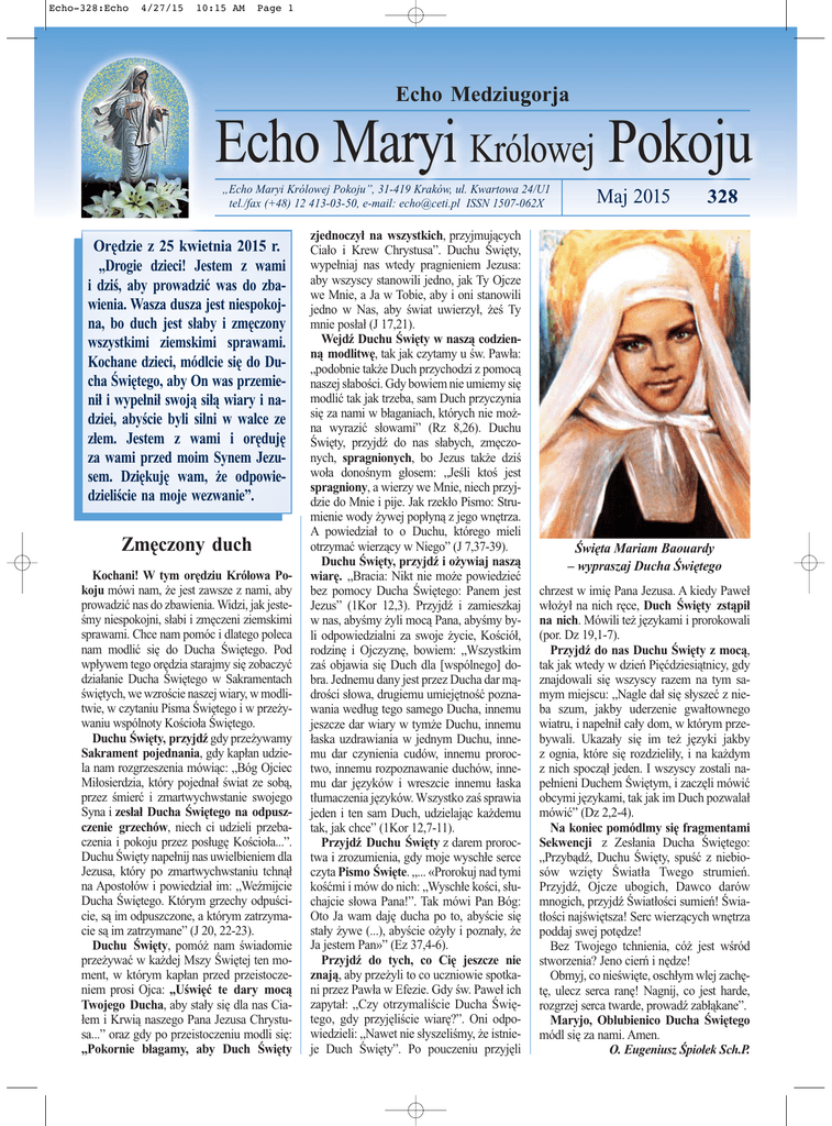 Echo-328:Echo 4/27/15 10:15 AM Page 1 Echo Medziugorja Echo Maryi Królowej Pokoju „Echo Maryi Królowej Pokoju”, 31-419 Kraków, ul. Kwartowa 24/U1 tel./fax (+48) 12 413-03-50, e-mail: [email protected] ISSN 1507-062X Orędzie z 25 kwietnia 2015 r. „Drogie dzieci! Jestem z wami i dziś, aby prowadzić was do zbawienia. Wasza dusza jest niespokojna, bo duch jest słaby i zmęczony wszystkimi ziemskimi sprawami. Kochane dzieci, módlcie się do Ducha Świętego, aby On was przemienił i wypełnił swoją siłą wiary i nadziei, abyście byli silni w walce ze złem. Jestem z wami i oręduję za wami przed moim Synem Jezusem. Dziękuję wam, że odpowiedzieliście na moje wezwanie”. Zmęczony duch Kochani! W tym orędziu Królowa Pokoju mówi nam, że jest zawsze z nami, aby prowadzić nas do zbawienia. Widzi, jak jesteśmy niespokojni, słabi i zmęczeni ziemskimi sprawami. Chce nam pomóc i dlatego poleca nam modlić się do Ducha Świętego. Pod wpływem tego orędzia starajmy się zobaczyć działanie Ducha Świętego w Sakramentach świętych, we wzroście naszej wiary, w modlitwie, w czytaniu Pisma Świętego i w przeżywaniu wspólnoty Kościoła Świętego. Duchu Święty, przyjdź gdy przeżywamy Sakrament pojednania, gdy kapłan udziela nam rozgrzeszenia mówiąc: „Bóg Ojciec Miłosierdzia, który pojednał świat ze sobą, przez śmierć i zmartwychwstanie swojego Syna i zesłał Ducha Świętego na odpuszczenie grzechów, niech ci udzieli przebaczenia i pokoju przez posługę Kościoła...”. Duchu Święty napełnij nas uwielbieniem dla Jezusa, który po zmartwychwstaniu tchnął na Apostołów i powiedział im: „Weźmijcie Ducha Świętego. Którym grzechy odpuścicie, są im odpuszczone, a którym zatrzymacie są im zatrzymane” (J 20, 22-23). Duchu Święty, pomóż nam świadomie przeżywać w każdej Mszy Świętej ten moment, w którym kapłan przed przeistoczeniem prosi Ojca: „Uświęć te dary mocą Twojego Ducha, aby stały się dla nas Ciałem i Krwią naszego Pana Jezusa Chrystusa...” oraz gdy po przeistoczeniu modli się: „Pokornie błagamy, aby Duch Święty zjednoczył na wszystkich, przyjmujących Ciało i Krew Chrystusa”. Duchu Święty, wypełniaj nas wtedy pragnieniem Jezusa: aby wszyscy stanowili jedno, jak Ty Ojcze we Mnie, a Ja w Tobie, aby i oni stanowili jedno w Nas, aby świat uwierzył, żeś Ty mnie posłał (J 17,21). Wejdź Duchu Święty w naszą codzienną modlitwę, tak jak czytamy u św. Pawła: „podobnie także Duch przychodzi z pomocą naszej słabości. Gdy bowiem nie umiemy się modlić tak jak trzeba, sam Duch przyczynia się za nami w błaganiach, których nie można wyrazić słowami” (Rz 8,26). Duchu Święty, przyjdź do nas słabych, zmęczonych, spragnionych, bo Jezus także dziś woła donośnym głosem: „Jeśli ktoś jest spragniony, a wierzy we Mnie, niech przyjdzie do Mnie i pije. Jak rzekło Pismo: Strumienie wody żywej popłyną z jego wnętrza. A powiedział to o Duchu, którego mieli otrzymać wierzący w Niego” (J 7,37-39). Duchu Święty, przyjdź i ożywiaj naszą wiarę. „Bracia: Nikt nie może powiedzieć bez pomocy Ducha Świętego: Panem jest Jezus” (1Kor 12,3). Przyjdź i zamieszkaj w nas, abyśmy żyli mocą Pana, abyśmy byli odpowiedzialni za swoje życie, Kościół, rodzinę i Ojczyznę, bowiem: „Wszystkim zaś objawia się Duch dla [wspólnego] dobra. Jednemu dany jest przez Ducha dar mądrości słowa, drugiemu umiejętność poznawania według tego samego Ducha, innemu jeszcze dar wiary w tymże Duchu, innemu łaska uzdrawiania w jednym Duchu, innemu dar czynienia cudów, innemu proroctwo, innemu rozpoznawanie duchów, innemu dar języków i wreszcie innemu łaska tłumaczenia języków. Wszystko zaś sprawia jeden i ten sam Duch, udzielając każdemu tak, jak chce” (1Kor 12,7-11). Przyjdź Duchu Święty z darem proroctwa i zrozumienia, gdy moje wyschłe serce czyta Pismo Święte. „... «Prorokuj nad tymi kośćmi i mów do nich: „Wyschłe kości, słuchajcie słowa Pana!”. Tak mówi Pan Bóg: Oto Ja wam daję ducha po to, abyście się stały żywe (...), abyście ożyły i poznały, że Ja jestem Pan»” (Ez 37,4-6). Przyjdź do tych, co Cię jeszcze nie znają, aby przeżyli to co uczniowie spotkani przez Pawła w Efezie. Gdy św. Paweł ich zapytał: „Czy otrzymaliście Ducha Świętego, gdy przyjęliście wiarę?”. Oni odpowiedzieli: „Nawet nie słyszeliśmy, że istnieje Duch Święty”. Po pouczeniu przyjęli Maj 2015 328 Święta Mariam Baouardy – wypraszaj Ducha Świętego chrzest w imię Pana Jezusa. A kiedy Paweł włożył na nich ręce, Duch Święty zstąpił na nich. Mówili też językami i prorokowali (por. Dz 19,1-7). Przyjdź do nas Duchu Święty z mocą, tak jak wtedy w dzień Pięćdziesiątnicy, gdy znajdowali się wszyscy razem na tym samym miejscu: „Nagle dał się słyszeć z nieba szum, jakby uderzenie gwałtownego wiatru, i napełnił cały dom, w którym przebywali. Ukazały się im też języki jakby z ognia, które się rozdzieliły, i na każdym z nich spoczął jeden. I wszyscy zostali napełnieni Duchem Świętym, i zaczęli mówić obcymi językami, tak jak im Duch pozwalał mówić” (Dz 2,2-4). Na koniec pomódlmy się fragmentami Sekwencji z Zesłania Ducha Świętego: „Przybądź, Duchu Święty, spuść z niebiosów wzięty Światła Twego strumień. Przyjdź, Ojcze ubogich, Dawco darów mnogich, przyjdź Światłości sumień! Światłości najświętsza! Serc wierzących wnętrza poddaj swej potędze! Bez Twojego tchnienia, cóż jest wśród stworzenia? Jeno cierń i nędze! Obmyj, co nieświęte, oschłym wlej zachętę, ulecz serca ranę! Nagnij, co jest harde, rozgrzej serca twarde, prowadź zabłąkane”. Maryjo, Oblubienico Ducha Świętego módl się za nami. Amen. O. Eugeniusz Śpiołek Sch.P. Echo-328:Echo 4/27/15 10:15 AM Page 2 Echo 328 ~2~ Z ˚ycia KoÊcio∏a W hołdzie Janowi Pawłowi II – w 