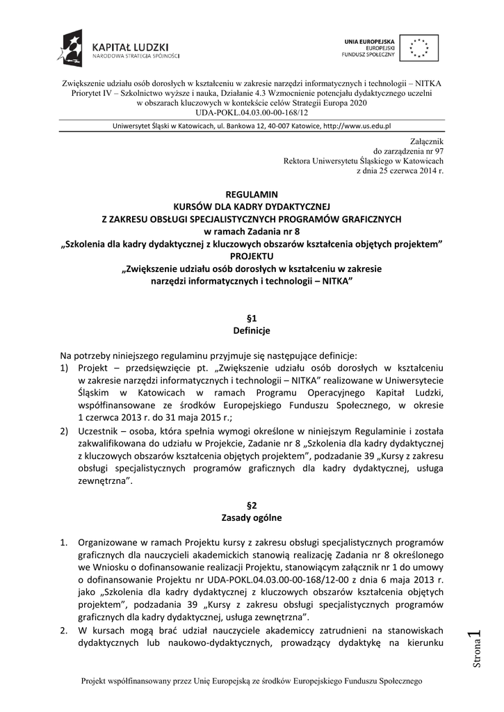 Zwiększenie udziału osób dorosłych w kształceniu w zakresie narzędzi informatycznych i technologii – NITKA Priorytet IV – Szkolnictwo wyższe i nauka, Działanie 4.3 Wzmocnienie potencjału dydaktycznego uczelni w obszarach kluczowych w kontekście celów Strategii Europa 2020 UDA-POKL.04.03.00-00-168/12 Uniwersytet Śląski w Katowicach, ul. Bankowa 12, 40-007 Katowice, http://www.us.edu.pl Załącznik do zarządzenia nr 97 Rektora Uniwersytetu Śląskiego w Katowicach z dnia 25 czerwca 2014 r. REGULAMIN KURSÓW DLA KADRY DYDAKTYCZNEJ Z ZAKRESU OBSŁUGI SPECJALISTYCZNYCH PROGRAMÓW GRAFICZNYCH w ramach Zadania nr 8 „Szkolenia dla kadry dydaktycznej z kluczowych obszarów kształcenia objętych projektem” PROJEKTU „Zwiększenie udziału osób dorosłych w kształceniu w zakresie narzędzi informatycznych i technologii – NITKA” §1 Definicje Na potrzeby niniejszego regulaminu przyjmuje się następujące definicje: 1) Projekt – przedsięwzięcie pt. „Zwiększenie udziału osób dorosłych w kształceniu w zakresie narzędzi informatycznych i technologii – NITKA” realizowane w Uniwersytecie Śląskim w Katowicach w ramach Programu Operacyjnego Kapitał Ludzki, współfinansowane ze środków Europejskiego Funduszu Społecznego, w okresie 1 czerwca 2013 r. do 31 maja 2015 r.; 2) Uczestnik – osoba, która spełnia wymogi określone w niniejszym Regulaminie i została zakwalifikowana do udziału w Projekcie, Zadanie nr 8 „Szkolenia dla kadry dydaktycznej z kluczowych obszarów kształcenia objętych projektem”, podzadanie 39 „Kursy z zakresu obsługi specjalistycznych programów graficznych dla kadry dydaktycznej, usługa zewnętrzna”. 2. Organizowane w ramach Projektu kursy z zakresu obsługi specjalistycznych programów graficznych dla nauczycieli akademickich stanowią realizację Zadania nr 8 określonego we Wniosku o dofinansowanie realizacji Projektu, stanowiącym załącznik nr 1 do umowy o dofinansowanie Projektu nr UDA-POKL.04.03.00-00-168/12-00 z dnia 6 maja 2013 r. jako „Szkolenia dla kadry dydaktycznej z kluczowych obszarów kształcenia objętych projektem”, podzadania 39 „Kursy z zakresu obsługi specjalistycznych programów graficznych dla kadry dydaktycznej, usługa zewnętrzna”. W kursach mogą brać udział nauczyciele akademiccy zatrudnieni na stanowiskach dydaktycznych lub naukowo-dydaktycznych, prowadzący dydaktykę na kierunku Projekt współfinansowany przez Unię Europejską ze środków Europejskiego Funduszu Społecznego Strona 1. 1 §2 Zasady ogólne Zwiększenie udziału osób dorosłych w kształceniu w zakresie narzędzi informatycznych i technologii – NITKA Priorytet IV – Szkolnictwo wyższe i nauka, Działanie 4.3 Wzmocnienie potencjału dydaktycznego uczelni w obszarach kluczowych w kontekście celów Strategii Europa 2020 UDA-POKL.04.03.00-00-168/12 Uniwersytet Śląski w Katowicach, ul. Bankowa 12, 40-007 Katowice, http://www.us.edu.pl 3. 4. Projektowanie gier i przestrzeni wirtualnej prowadzonym na Wydziale Artystycznym Uniwersytetu Śląskiego. Za całość realizacji Zadania, o którym mowa w ust. 1, odpowiedzialny jest Koordynator realizacji kursów i e-learningu na kierunku „Projektowanie gier i przestrzeni wirtualnej”, powołany przez Rektora Uniwersytetu Śląskiego w Katowicach. W ramach projektu realizowane będą kursy w dwóch cyklach: Pierwszy cykl: (60 h lekcyjnych) Kursy z zakresu grafiki 2D: 1. Zastosowania grafiki 2D w grach wideo (12 godzin lekcyjnych) 2. Wybrane zagadnienia techniczne grafiki 2D w grach wideo (12 godzin lekcyjnych) 3. Tworzenie grafik koncepcyjnych (12 godzin lekcyjnych) 4. Tworzenie grafik sprajtów (12 godzin lekcyjnych) 5. Tworzenie tekstur (12 godzin lekcyjnych) Drugi cykl: (60 h lekcyjnych) Kursy z zakresu grafiki 3D: 1. Zastosowania grafiki 3D w grach wideo (12 godzin lekcyjnych) 2. Wybrane zagadnienia techniczne grafiki 3D w grach wideo (12 godzin lekcyjnych) 3. Modelowanie obiektów dla gier wideo (12 godzin lekcyjnych) 4. Teksturowanie obiektów dla gier wideo (12 godzin lekcyjnych) 5. Animacja obiektów dla gier wideo (12 godzin lekcyjnych) 2. 3. 4. 5. Koordynator realizacji kursów i e-learningu na kierunku „Projektowanie gier i przestrzeni wirtualnej” informuje o możliwości udziału w kursach zainteresowane osoby wysyłając wiadomości e-mail. Nabór uczestników kursów odbywa się na zasadzie dobrowolnych zgłoszeń pracowników Uniwersytetu Śląskiego w Katowicach z wykorzystaniem formularza stanowiącego załącznik nr 1 do Regulaminu. Kwalifikacji na kursy dokona komisja rekrutacyjna, w której skład wchodzi Koordynator realizacji kursów i e-learningu na kierunku „Projektowanie gier i przestrzeni wirtualnej” oraz Dziekan Wydziału Artystycznego lub wskazana przez niego osoba. Kwalifikacja na kursy odbywać się będzie na podstawie listy rankingowej oceniającej osiągnięcia naukowe i dydaktyczne kandydata oraz propozycję wykorzystania zdobytej wiedzy do podwyższenia jakości kształcenia. Osoby, które ukończyły 45 lat premiowane będą dodatkowym punktem w rekrutacji. Strona 1. 2 §3 Rekrutacja uczestników Projekt współfinansowany przez Unię Europejską ze środków Europejskiego Funduszu Społecznego Zwiększenie udziału osób dorosłych w kształceniu w zakresie narzędzi informatycznych i technologii – NITKA Priorytet IV – Szkolnictwo wyższe i nauka, Działanie 4.3 Wzmocnienie potencjału dydaktycznego uczelni w obszarach kluczowych w kontekście celów Strategii Europa 2020 UDA-POKL.04.03.00-00-168/12 Uniwersytet Śląski w Katowicach, ul. Bankowa 12, 40-007 Katowice, http://www.us.edu.pl 6. 7. Przystąpienie do zajęć każdy uczestnik potwierdza wypełniając i podpisując deklarację udziału w Projekcie (załącznik nr 2 do Regulaminu) oraz zgodę na przetwarzanie danych osobowych (załącznik nr 3 do Regulaminu). Rekrutacja realizowana w ramach Projektu prowadzona jest z zachowaniem zasady równości szans w tym z