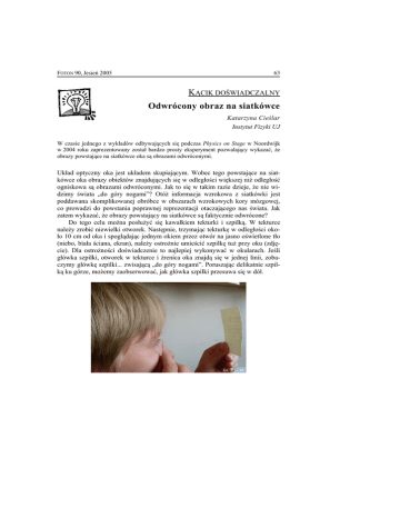 FOTON 90, Jesień 2005 63 KĄCIK DOŚWIADCZALNY Odwrócony obraz na siatkówce Katarzyna Cieślar Instytut Fizyki UJ W czasie jednego z wykładów odbywających się podczas Physics on Stage w Noordwijk w 2004 roku zaprezentowany został bardzo prosty eksperyment pozwalający wykazać, że obrazy powstające na siatkówce oka są obrazami odwróconymi. Układ optyczny oka jest układem skupiającym. Wobec tego powstające na siatkówce oka obrazy obiektów znajdujących się w odległości większej niż odległość ogniskowa są obrazami odwróconymi. Jak to się w takim razie dzieje, że nie widzimy świata „do góry nogami”? Otóż informacja wzrokowa z siatkówki jest poddawana skomplikowanej obróbce w obszarach wzrokowych kory mózgowej, co prowadzi do powstania poprawnej reprezentacji otaczającego nas świata. Jak zatem wykazać, że obrazy powstający na siatkówce są faktycznie odwrócone? Do tego celu można posłużyć się kawałkiem tekturki i szpilką. W tekturce należy zrobić niewielki otworek. Następnie, trzymając tekturkę w odległości około 10 cm od oka i spoglądając jednym okiem przez otwór na jasno oświetlone tło (niebo, biała ściana, ekran), należy ostrożnie umieścić szpilkę tuż przy oku (zdjęcie). Dla ostrożności doświadczenie to najlepiej wykonywać w okularach. Jeśli główka szpilki, otworek w tekturce i źrenica oka znajdą się w jednej linii, zobaczymy główkę szpilki... zwisającą „do góry nogami”. Poruszając delikatnie szpilką ku górze, możemy zaobserwować, jak główka szpilki przesuwa się w dół. fot. Z.G-M FOTON 90, Jesień 2005 64 Wyjaśnienie tego zjawiska jest następujące. Tekturka z otworkiem służy jako punktowe źródła światła, dające dobrze zdefiniowany cień szpilki na ekranie (rys. 1a). Jeśli szpilkę umieścimy tuż przed soczewką oka (rys. 1b), to rzuci ona cień na siatkówkę, która w tym wypadku pełni rolę ekranu. Jednak w korze mózgu cień ten jest interpretowany jako obraz na siatkówce i jest w procesie obróbki „odwracany”. W ten sposób powstaje nasze zmysłowe wrażenie zawieszonej „do góry nogami” szpilki. ekran (a) przesłona z otworkiem szpilka cień (b) ekran (siatkówka) przesłona z otworkiem soczewka Na podstawie artykulu „Simple experiments on the physics of vision” Adolfa Cortela Ortuño, opublikowanego w Alambique, 39, s. 93–98 (2004). Patrz także Gabrielson C.: „Pinheads, Pin Shadows, Pinholes”, The Physics Teacher, 31, s. 380–382. (1993); Layton B.: „Inverted images and noninverted shadows”, The Physics Teacher, vol. 39, s. 530–532 (2001).