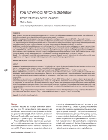 PRACA ORYGINALNA STAN AKTYWNOŚCI FIZYCZNEJ STUDENTÓW STATE OF THE PHYSICAL ACTIVITY OF STUDENTS Martyna Dębska Licencjat z Fizjoterapii. Wydział Nauk o Zdrowiu, Instytut Fizjoterapii, Uniwersytet Jana Kochanowskiego w Kielcach STRESZCZENIE Wstęp. Aktywność fizyczna jest ważnym elementem zdrowego stylu życia. Systematycznie podejmowana posiada wiele korzystnych skutków, które oddziałują m.in. na układ oddechowy, krążenia, hormonalny, mięśniowo-szkieletowy oraz wpływa na aspekt psychologiczny. Cel. Celem niniejszej pracy było zbadanie poziomu aktywności fizycznej studentów mieszkających w roku akademickim 2013/2014 w akademikach w Kielcach. Materiał i metody. Badania przeprowadzono w kwietniu 2014 roku. Objęto nimi 132 studentów, którzy w roku akademickim 2013/2014 mieszkali w akademikach w Kielcach. Większość badanych osób stanowiły kobiety (86,36%). Podczas badań zastosowano metodę sondażu diagnostycznego, zaś narzędziem badawczym był autorski kwestionariusz ankiety, który został przesłany do studentów przez Internet. Wykorzystano test Kruskala-Wallisa oraz korelację rho-Spearmana. Wyniki. Badani respondenci byli w przedziale wiekowym od 19 do 28 lat. Prawie 55% (54,55%) respondentów według subiektywnej oceny uważa, że są osobami aktywnie fizycznymi. Najwięcej osób swoją aktywność fizyczną uważa za przeciętną (41,67%), zaś najmniej osób za bardzo dobrą (3,03%). Przeważająca większość ankietowanych, bo 129 (97,73%) osób, zadeklarowała w badaniach, że zna korzystny wpływ aktywności fizycznej na organizm człowieka. Najwięcej ankietowanych (44,44%) systematycznie biega. Studenci innych kierunków studiów nie różnią się pod względem wybranych aspektów aktywności fizycznej. Analizy korelacji nie wykazały istotnych statystycznie związków pomiędzy wiekiem badanych osób a oceną aktywności fizycznej, rolą, jaką pełni aktywność fizyczna w życiu badanych. Wnioski. 1. Wiek ankietowanych nie oddziałuje na średni wymiar czasowy jednorazowej aktywności fizycznej. 2. Studenci innych kierunków studiów nie różnią się pod względem swojej oceny aktywności fizycznej. 3. Studenci znają korzystny wpływ aktywności fizycznej na organizm człowieka. Słowa kluczowe: aktywność fizyczna, fizjoterapia, zdrowie. ABSTRACT 138 Introduction. The physical activity is an important component of the healthier lifestyle. Systematically taken many beneficial effects which are having an influence among others on a respiratory system, have circulations, hormone, musculoskeletal and influences the psychological aspect. Aim. Examining of the level of physical activity of students living in the academic year 2013/2014 was a purpose of this work in halls of residence in Kielce. Material and methods. They conducted research in April 2014. They embraced with 132 of them of students, which in academic year 2013/2014 stayed in halls of residence in Kielce. Women comprised majority of examined persons, of which was 86.36%. During examinations a method of the diagnostic survey was applied, whereas an author’s questionnaire of the questionnaire form which was sent by the Internet to students was a research tool. A test was used Kruskala-Wallisa and rho-Spearmana correlation. Results. Examined respondents were in an age bracket from 19 up to 28 years. Almost a 55% (54.55%) according to the subjective evaluation regards respondents are persons actively physical. The most persons regard their physical activity as the average (41.67%), whereas fewest persons too very good (3.03%). Overwhelming majority of respondents, because 129 (97.73%) it declared in examinations, that knew the beneficial effect of the physical activity to the human body. The most respondents (44.44%) systematically undertakes running. Students of other subjects don’t differ in terms of selected aspects of the physical activity. Correlation analyses didn’t show essential statistically of connections of persons between the age examined but with the evaluation of the physical activity, with role a physical activity is performing which in the life examined. Conclusions. 1. The age of respondents isn’t having an influence on an average temporary dimension of the disposable physical activity. 2. Students of other subjects don’t differ in terms of their evaluation of the physical activity. 3. Students know the beneficial effect of the physical activity to the human body. Keywords: physical activity, physiotherapy, health. Wstęp Aktywność fizyczna jest ważnym elementem zdrowego stylu życia [1]. Jednak obecnie można zauważyć, że wśród dzieci oraz młodzieży powstaje tendencja obniżenia sprawności fizycznej [2]. Warto nadmienić, że zdaniem Światowej Organizacji Zdrowia brak aktywności fizycznej jest jednym z czynników ryzyka dla zdrowia [3]. Aktywność fizyczną można rozumieć jako „wymuszone” czynności, powiązane z pracą fizyczną lub pewne czynności wykonywane świadomie i planowo z nieprzymuszonej woli [4]. W utrzymaniu oraz poprawianiu zdrowia była Polski Przegląd Nauk o Zdrowiu 2 (39) 2014 ona treścią zainteresowań badawczych autorów, w tym również Starosty W. [5]. Uważał on, że aktywność fizyczna jest potrzebą biologiczną każdego człowieka, gwarantującą mu utrzymanie zdrowia [5]. „Ruch powinien towarzyszyć nam niezależnie od wieku, płci czy wykonywanego zawodu, przy czym wielkość obciążenia fizycznego winna być dostosowana indywidualnie z uwzględnieniem m.in. wymienionych wyżej czynników” [5]. Systematycznie podejmowana posiada wiele korzystnych skutków, które oddziałują m.in. na układ oddechowy, krążenia, hormonalny, mięśniowo-szkieletowy oraz wpływa na aspekt psychologiczny. Jednym z najbardziej decydujących czynników oddziałujących na odpowiednie samopoczucie człowieka, jego jakość życia i długowieczność jest systematyczny wysiłek fizyczny. Powinien on być adekwatny do st