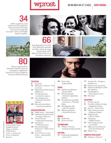 10 VII 2011 NR 27 (1482) SPIS TREŚCI 34 Jedne są gotowe rzucić studia, inne prać publicznie domowe brudy. Wszystkie uwierzyły, że mogą zajść na szczyt w show „Top Model. Zostań modelką”. 80 66 Transakcję planował od lat. Teraz Polkomtel, operator sieci Plus, należy do niego. Kosztował 18 mld zł. Zygmunt Solorz-Żak ma już prawdziwe imperium. Wbrew zapowiedziom Stanisław Mikulski raczej nie wystartuje w najbliższych wyborach. Za to już niebawem wróci do roli Hansa Klossa! POLITYKA 6 12 Naskróty Talibowiewnatarciu–PiS nawirażu 16 NajsztubpytaBronisława Wildsteina 21 Wimięspuścizny –Smoleńskiwybory 24 Tercetegzotyczny –GiertychKamiński Sikorski 28 Rokpodżyrandolem –rocznicaprezydenta ZDJĘCIA: M. KALIŃSKI, M. STELMACH/PHOTOO.PL SPOŁECZEŃSTWO Projekt okładki: Kasper Skirgajłło-Krajewski Zdjęcia na okładce: AFP/East New, Corbis, J. Kucharczyk/ Forum, W. Rozbicki/ Reporter 34 Wejśćnatop–„TopModel” 38 Kolekcjonerzykoncertów –pociągnaOpen’era 41 Uniwersytucja –studenckaprostytucja 44 Zawieszeni –młodzibezpracy 46 Ktoukradłświętą Pulcherię?–RobinHood zzakonu 48 TonieLitwintonasz Grześ–wojnapolsko-litewska 50 Numerdwa –ŁukaszKubot ŚWIAT 54 Krajobrazpogilotynie –Strauss-Kahn 57 Okrutneigrzyska –rozmowazAgnieszką Holland 58 Tenatakmniezmiażdżył –rozmowazoMaciejem Ziębą 60 NiezatapialnaJulia –JuliaTymoszenko 64 Niklowanyplayboy –MichaiłProchorow BIZNES 66 Wielkiskok 70 Złymocnyfrank TECHNOLOGIE 72 Witajciewchmurze –komputerbardziejosobisty KULTURA 74 Fantasydlainteligentów –„Graotron” 77 Awanturnik–Grzegorz Królikiewicz 80 Wciążznamitenumery 82 MałykrokdlaBjörkwielki dlaludzkości 84 Trendseerka –RomaGąsiorowska 86 Recenzje FELIETONY 4 31 32 94 95 96 97 97 98 Mówiącwprost ZpunktuwidzeniaInnego –MagdalenaŚroda Adrem–MarcinKról Mojewidzenieświata –ZbigniewHołdys Nagaprawda –MarcinMeller Gotujęsię –MagdaGessler Mamswojepowody –JanWróbel Bajkaprawiepolityczna –GrzesiekMarkowski Skibąwmur DODATEK SPECJALNY 88 Wakacjez„Wprost” 3