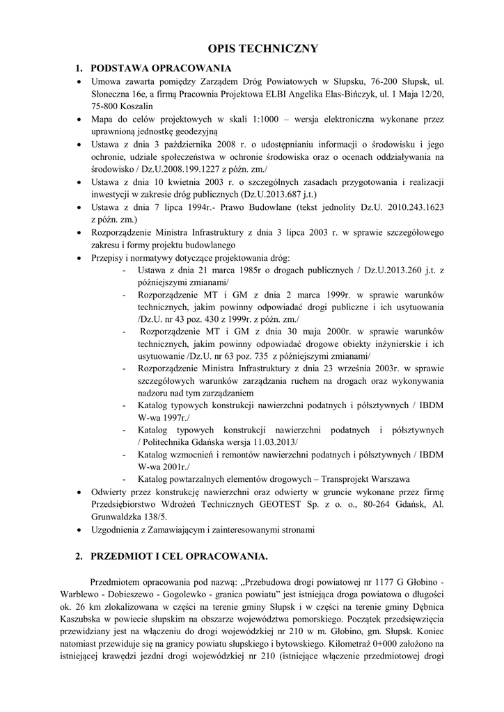 OPIS TECHNICZNY 1. PODSTAWA OPRACOWANIA Umowa zawarta pomiędzy Zarządem Dróg Powiatowych w Słupsku, 76-200 Słupsk, ul. Słoneczna 16e, a firmą Pracownia Projektowa ELBI Angelika Elas-Bińczyk, ul. 1 Maja 12/20, 75-800 Koszalin Mapa do celów projektowych w skali 1:1000 – wersja elektroniczna wykonane przez uprawnioną jednostkę geodezyjną Ustawa z dnia 3 października 2008 r. o udostępnianiu informacji o środowisku i jego ochronie, udziale społeczeństwa w ochronie środowiska oraz o ocenach oddziaływania na środowisko / Dz.U.2008.199.1227 z późn. zm./ Ustawa z dnia 10 kwietnia 2003 r. o szczególnych zasadach przygotowania i realizacji inwestycji w zakresie dróg publicznych (Dz.U.2013.687 j.t.) Ustawa z dnia 7 lipca 1994r.- Prawo Budowlane (tekst jednolity Dz.U. 2010.243.1623 z późn. zm.) Rozporządzenie Ministra Infrastruktury z dnia 3 lipca 2003 r. w sprawie szczegółowego zakresu i formy projektu budowlanego Przepisy i normatywy dotyczące projektowania dróg: - Ustawa z dnia 21 marca 1985r o drogach publicznych / Dz.U.2013.260 j.t. z późniejszymi zmianami/ - Rozporządzenie MT i GM z dnia 2 marca 1999r. w sprawie warunków technicznych, jakim powinny odpowiadać drogi publiczne i ich usytuowania /Dz.U. nr 43 poz. 430 z 1999r. z późn. zm./ Rozporządzenie MT i GM z dnia 30 maja 2000r. w sprawie warunków technicznych, jakim powinny odpowiadać drogowe obiekty inżynierskie i ich usytuowanie /Dz.U. nr 63 poz. 735 z późniejszymi zmianami/ - Rozporządzenie Ministra Infrastruktury z dnia 23 września 2003r. w sprawie szczegółowych warunków zarządzania ruchem na drogach oraz wykonywania nadzoru nad tym zarządzaniem - Katalog typowych konstrukcji nawierzchni podatnych i półsztywnych / IBDM W-wa 1997r./ - Katalog typowych konstrukcji nawierzchni podatnych i półsztywnych / Politechnika Gdańska wersja 11.03.2013/ - Katalog wzmocnień i remontów nawierzchni podatnych i półsztywnych / IBDM W-wa 2001r./ - Katalog powtarzalnych elementów drogowych – Transprojekt Warszawa Odwierty przez konstrukcję nawierzchni oraz odwierty w gruncie wykonane przez firmę Przedsiębiorstwo Wdrożeń Technicznych GEOTEST Sp. z o. o., 80-264 Gdańsk, Al. Grunwaldzka 138/5. Uzgodnienia z Zamawiającym i zainteresowanymi stronami 2. PRZEDMIOT I CEL OPRACOWANIA. Przedmiotem opracowania pod nazwą: „Przebudowa drogi powiatowej nr 1177 G Głobino Warblewo - Dobieszewo - Gogolewko - granica powiatu” jest istniejąca droga powiatowa o długości ok. 26 km zlokalizowana w części na terenie gminy Słupsk i w części na terenie gminy Dębnica Kaszubska w powiecie słupskim na obszarze województwa pomorskiego. Początek przedsięwzięcia przewidziany jest na włączeniu do drogi wojewódzkiej nr 210 w m. Głobino, gm. Słupsk. Koniec natomiast przewiduje się na granicy powiatu słupskiego i bytowskiego. Kilometraż 0+000 założono na istniejącej krawędzi jezdni drogi wojewódzkiej nr 210 (istniejące włączenie przedmiotowej drogi powiatowej nr 1177G do drogi wojewódzkiej), km 0+000 jest jednocześnie początkiem projektowanych robót. Kilometraż końcowy to km 26+052.71 - na granicy powiatu słupskiego i bytowskiego, w obrębie Gogolewko, gm. Dębnica Kaszubska - jest jednocześnie koniec projektowanych robót. Po trasie droga przechodzi przez obręby miejscowości położonych na terenie gminy Słupsk: Głobino, Warblewo oraz przez obręby miejscowości Brzeziniec, Dobieszewo, Podole Małe, Dobra, Gogolewo, Gogolewko, położonych na terenie gminy Dębnica Kaszubska. Przedsięwzięcie nie przechodzi przez tereny zamknięte, a większa część przedmiotowego odcinka drogi powiatowej przebiega przez teren gminy Dębnica Kaszubska. Celem opracowania jest przedstawienie zakresu prac, rozwiązań technicznych i technologicznych robót budowlanych mających na celu przywrócenie i poprawę parametrów techniczno-użytkowych istniejącej drogi. Przewidywany zakres robót dla przedmiotowej inwestycji obejmuje: - rozbudowę drogi, z uwagi na lokalne poszerzenie pasa drogowego; - przebudowę i remont istniejącej konstrukcji jezdni, w tym poszerzenia jezdni; - remont, przebudowę, budowę skrzyżowań; - remont, przebudowę, budowę zjazdów; - wykonanie nowych i przebudowę istniejących chodników; - wykonanie nowych i przebudowę istniejących zatok; - oczyszczenie, remont, przebudowę, budowę przepustów; - wykonanie, uzupełnienie i regulacja poboczy; - wykonanie elementów bezpieczeństwa ruchu drogowego; - wykonanie oznakowania poziomego i pionowego; - remont, przebudowę i budowę układu odprowadzającego wody opadowe z drogi, w tym budowa kanalizacji deszczowej w m. Gogolewo i Gogolewko; - remont, przebudowa, uzupełnienie oświetlenia drogowego; - przebudowa i zabezpieczenie odcinków istniejących sieci uzbrojenia terenu. W ramach inwestycji wykonane zostaną również konieczne i niezbędne roboty mające na celu dowiązanie się do istniejącego zagospodarowania wzdłuż drogi, a w szczególności przełożenie lub przebudowa istniejących nawierzchni (bądź gruntu) poza pasem drogowym na dojazdach, ciągach pieszych i dojściach do posesji, w celu wysokościowego dostosowania do projektowanych rzędnych elementów drogi, przesunięcie ogrodzeń zlokalizowanych w pasie drogowym. Z uwagi na to, że przedmiotowe przedsięwzięcie wykracza poza obręb istniejącego pasa drogowego oraz wiąże się ze zmianą jego granic, przedmiotowe przedsięwzięcie realizowane jest w trybie ustawy z dnia 10 kwietnia 2003 r. o szczególnych zasadach przygotowania i realizacji inwestycji w zakresie dróg publicznych. 3. STAN ISTNIEJĄCY Przedmiotowa droga powiatowa objęta opracowaniem, przebiega zarówno przez tereny niezabudowane jak i zabudowane. Obszary zabudowane stanowią miejscowości: Głobino, Warblewo w gm. Słupsk oraz obszar zabudowany miejscowości Borzęcinko, Borzęcino, Dobieszewo, Podole Małe, Dobra, Gogolewo i Gogolewko w gm. Dębnica Kaszubska. Pas drogowy d