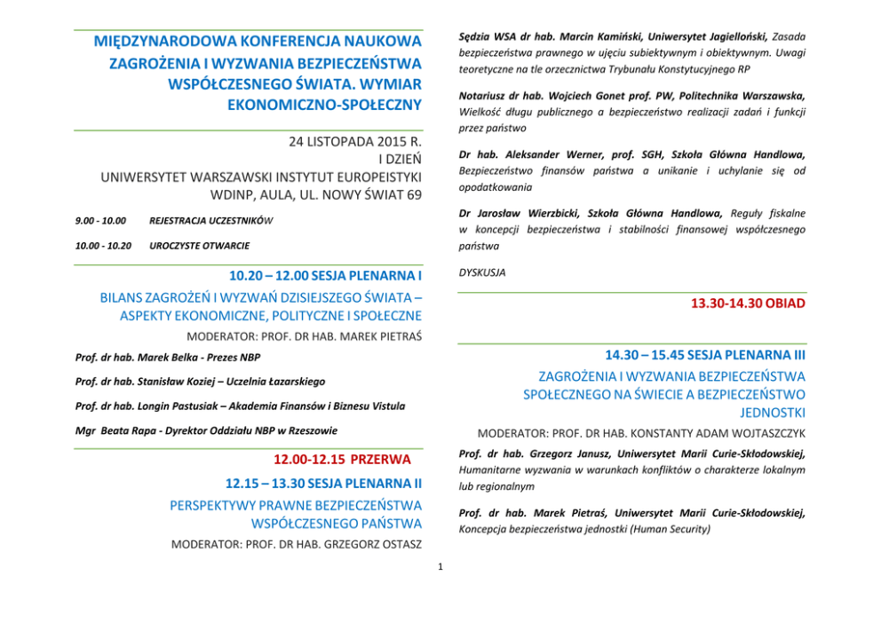 Sędzia WSA dr hab. Marcin Kamiński, Uniwersytet Jagielloński, Zasada bezpieczeństwa prawnego w ujęciu subiektywnym i obiektywnym. Uwagi teoretyczne na tle orzecznictwa Trybunału Konstytucyjnego RP MIĘDZYNARODOWA KONFERENCJA NAUKOWA ZAGROŻENIA I WYZWANIA BEZPIECZEŃSTWA WSPÓŁCZESNEGO ŚWIATA. WYMIAR EKONOMICZNO-SPOŁECZNY Notariusz dr hab. Wojciech Gonet prof. PW, Politechnika Warszawska, Wielkość długu publicznego a bezpieczeństwo realizacji zadań i funkcji przez państwo 24 LISTOPADA 2015 R. I DZIEŃ UNIWERSYTET WARSZAWSKI INSTYTUT EUROPEISTYKI WDINP, AULA, UL. NOWY ŚWIAT 69 9.00 - 10.00 REJESTRACJA UCZESTNIKÓW 10.00 - 10.20 UROCZYSTE OTWARCIE Dr hab. Aleksander Werner, prof. SGH, Szkoła Główna Handlowa, Bezpieczeństwo finansów państwa a unikanie i uchylanie się od opodatkowania Dr Jarosław Wierzbicki, Szkoła Główna Handlowa, Reguły fiskalne w koncepcji bezpieczeństwa i stabilności finansowej współczesnego państwa DYSKUSJA 10.20 – 12.00 SESJA PLENARNA I BILANS ZAGROŻEŃ I WYZWAŃ DZISIEJSZEGO ŚWIATA – ASPEKTY EKONOMICZNE, POLITYCZNE I SPOŁECZNE 13.30-14.30 OBIAD MODERATOR: PROF. DR HAB. MAREK PIETRAŚ 14.30 – 15.45 SESJA PLENARNA III ZAGROŻENIA I WYZWANIA BEZPIECZEŃSTWA SPOŁECZNEGO NA ŚWIECIE A BEZPIECZEŃSTWO JEDNOSTKI Prof. dr hab. Marek Belka - Prezes NBP Prof. dr hab. Stanisław Koziej – Uczelnia Łazarskiego Prof. dr hab. Longin Pastusiak – Akademia Finansów i Biznesu Vistula Mgr Beata Rapa - Dyrektor Oddziału NBP w Rzeszowie MODERATOR: PROF. DR HAB. KONSTANTY ADAM WOJTASZCZYK 12.15 – 13.30 SESJA PLENARNA II Prof. dr hab. Grzegorz Janusz, Uniwersytet Marii Curie-Skłodowskiej, Humanitarne wyzwania w warunkach konfliktów o charakterze lokalnym lub regionalnym PERSPEKTYWY PRAWNE BEZPIECZEŃSTWA WSPÓŁCZESNEGO PAŃSTWA Prof. dr hab. Marek Pietraś, Uniwersytet Marii Curie-Skłodowskiej, Koncepcja bezpieczeństwa jednostki (Human Security) 12.00-12.15 PRZERWA MODERATOR: PROF. DR HAB. GRZEGORZ OSTASZ 1 Dr Juliusz Piwowarski, Prof. WSBPI Apeiron w Krakowie, Kapitał ludzki vs. kapitał społeczny z perspektywy filarów kultury bezpieczeństwa 17.50 – 19.30 SESJA PLENARNA V Dr Urszula Soler, Katolicki Uniwersytet Lubelski, Bezpieczeństwo społeczne versus Internet - jaka przyszłość? DYLEMATY BEZPIECZEŃSTWA WEWNĘTRZNEGO DZISIEJSZEGO PAŃSTWA MODERATOR: DR HAB. WOJCIECH GONET PROF. PW DYSKUSJA 15.45 – 17.30 SESJA PLENARNA IV WSPÓŁCZESNE ZAGROŻENIA I WYZWANIA BEZPIECZEŃSTWA W UJĘCIU MILITARNYM I POZAMILITARNYM Prof. dr sc Gerhard Banse, Berlin Center for Technology and Culture, Sicherheit und Gefährdungen der globalen Informationsgesellschaft Dr hab. Krystyna Gomółka prof. UG, Uniwersytet Gdański, Przemyt na polsko-rosyjskiej granicy Polski w dobie Małego Ruchu Granicznego a bezpieczeństwo ekonomiczne Polski MODERATOR: PROF. DR HAB. GRZEGORZ JANUSZ Dr hab. Karina Paulina Marczuk, Uniwersytet Warszawski, Building the resilience to emergency situations - a case study of Australia Dr Andrzej Piątkowski, Ministerstwo Obrony Narodowej, The evolution of hybrid warfare - achieving economic or social goals through hybrid attacks Dr hab. inż. Andrzej Żebrowski prof. UP Kraków, Uniwersytet Pedagogiczny im. Komisji Edukacji Narodowej w Krakowie, Zainteresowania wywiadowcze w sferze ekonomiczno – gospodarczej Dr Petre Opris, Instytut Nauk Społeczno-Humanistycznych im. C.S. Nicolaescu-Plopsor w Krajowej, Rumuńska Akademia Nauk, Romanian Diamonds and the Romamnian-Yugoslav Military Cooperation (1969 –1989) Dr Krzysztof Michalski, Politechnika Rzeszowska, Społeczne skutki współczesnych transformacji technologicznych a problem bezpieczeństwa DYSKUSJA 19.30-20.00 PRZERWA Dr hab. Włodzimierz Fehler prof. UPH w Siedlcach, Uniwersytet Przyrodniczo-Humanistyczny w Siedlcach, Teoretyczne i metodologiczne podstawy analizy zagrożeń militarnych i paramilitarnych OD 20.00 UROCZYSTA KOLACJA DYSKUSJA 17.30-17.50 PRZERWA 2 3 Dr Filip Tereszkiewicz, Politechnika Opolska, Rewizja Europejskiej Strategii Bezpieczeństwa - kolejna zmarnowana szansa? MIĘDZYNARODOWA KONFERENCJA NAUKOWA ZAGROŻENIA I WYZWANIA BEZPIECZEŃSTWA WSPÓŁCZESNEGO ŚWIATA. WYMIAR EKONOMICZNO-SPOŁECZNY Mgr Paweł Fleischer, Uniwersytet Warszawski, Metodologia analizy polityki zagranicznej w polityce obronnej NATO Dr Marcin Tarnawski, Uniwersytet Jagielloński, Dylematy rosyjskiej polityki bezpieczeństwa energetycznego 25 LISTOPADA 2015 R. II DZIEŃ Dr Hanna Sommer, Politechnika Rzeszowska, Przestępczość ekonomiczna w Polsce - wybrane aspekty UNIWERSYTET WARSZAWSKI INSTYTUT EUROPEISTYKI WDINP, UL. KRAKOWSKIE PRZEDMIEŚCIE 3 Dr Kinga Stępień, Politechnika Rzeszowska, Bezpieczeństwo bankowości mobilnej 9:00-10:45 PANEL I Dr Grzegorz Zimon, Politechnika Rzeszowska, Wpływ grup zakupowych na bezpieczeństwo ekonomiczne przedsiębiorstw handlowych ZAGROŻENIA I WYZWANIA WYMIARU GOSPODARCZEGO W KONTEKŚCIE BEZPIECZEŃSTWA ŚWIATA Dr Anna Feruś, Politechnika Rzeszowska, Ocena ryzyka kredytowego przedsiębiorstw z zastosowaniem metody granicznej analizy danych celem zwiększenia bezpieczeństwa działalności kredytowej banku MODERATOR: PROF. DR HAB. TOMASZ ALEKSANDROWICZ Prof. Enrique Viana Remis, Universidad de Castilla – La Mancha, The causes and consequences of the economic crisi in the European Union Prof. Gülçimen Yurtsever, Hasan Kalyoncu University, The Relationships Between Budget Deficits and Balance on the exemple of Italy 9:00 - 10:45 PANEL II ZAGROŻENIA I WYZWANIA WSPÓŁCZESNEJ POLITYKI MIĘDZYNARODOWEJ Mgr Jakub Florczyk, Uniwersytet Marii Curie-Skłodowskiej, Transnarodowe organizacje społeczeństwa obywatelskiego jako stymulator bezpieczeństwa w późnowestfalskim ładzie MODERATOR: DR HAB. IZABELA OLEKSIEWICZ PROF. PRZ Prof. dr Piotr Żmuda, FOM University of Applied Science Köln, Global Security Issues Mgr Diana Bednarz, Uniwersytet Marii Curie-Skłodowskiej, Wymiar teoretyczny zapewniania bezpieczeństwa gospodarczego Polski na g