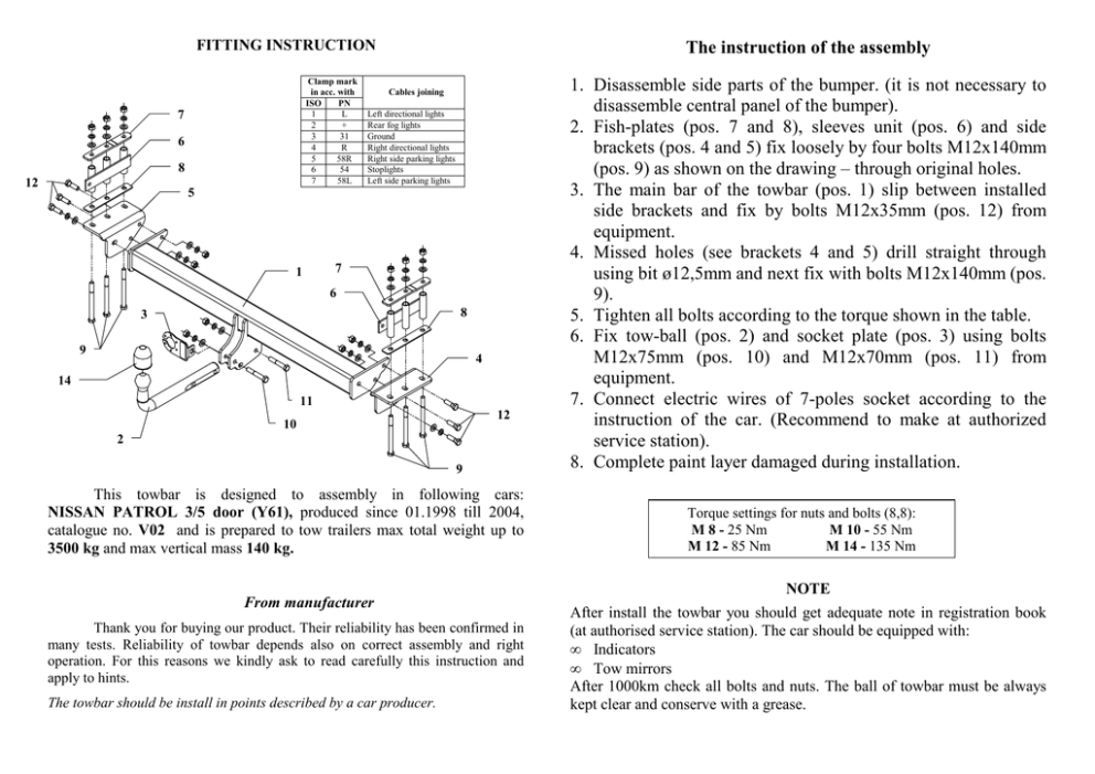 FITTING INSTRUCTION Clamp mark in acc. with ISO PN 1 L 2 + 3 31 4 R 5 58R 6 54 7 58L 7 6 8 12 The instruction of the assembly Cables joining Left directional lights Rear fog lights Ground Right directional lights Right side parking lights Stoplights Left side parking lights 5 1 7 6 8 3 9 4 14 11 12 10 2 9 This towbar is designed to assembly in following cars: NISSAN PATROL 3/5 door (Y61), produced since 01.1998 till 2004, catalogue no. V02 and is prepared to tow trailers max total weight up to 3500 kg and max vertical mass 140 kg. From manufacturer Thank you for buying our product. Their reliability has been confirmed in many tests. Reliability of towbar depends also on correct assembly and right operation. For this reasons we kindly ask to read carefully this instruction and apply to hints. The towbar should be install in points described by a car producer. 1. Disassemble side parts of the bumper. (it is not necessary to disassemble central panel of the bumper). 2. Fish-plates (pos. 7 and 8), sleeves unit (pos. 6) and side brackets (pos. 4 and 5) fix loosely by four bolts M12x140mm (pos. 9) as shown on the drawing – through original holes. 3. The main bar of the towbar (pos. 1) slip between installed side brackets and fix by bolts M12x35mm (pos. 12) from equipment. 4. Missed holes (see brackets 4 and 5) drill straight through using bit ø12,5mm and next fix with bolts M12x140mm (pos. 9). 5. Tighten all bolts according to the torque shown in the table. 6. Fix tow-ball (pos. 2) and socket plate (pos. 3) using bolts M12x75mm (pos. 10) and M12x70mm (pos. 11) from equipment. 7. Connect electric wires of 7-poles socket according to the instruction of the car. (Recommend to make at authorized service station). 8. Complete paint layer damaged during installation. Torque settings for nuts and bolts (8,8): M 8 - 25 Nm M 10 - 55 Nm M 12 - 85 Nm M 14 - 135 Nm NOTE After install the towbar you should get adequate note in registration book (at authorised service station). The car should be equipped with: • Indicators • Tow mirrors After 1000km check all bolts and nuts. The ball of towbar must be always kept clear and conserve with a grease. Towbar equipment: PPUH AUTO-HAK S.J. Produkcja Haków Holowniczych Henryk & Zbigniew Nejman 76-200 SŁUPSK ul. Słoneczna 16K tel/fax (059) 8-414-414; 8-414-413 Email: [email protected] www. autohak.com.pl Towing hitch (without electrical set) Class: A50-X Designed for: Cat. no. V02 Technical data: D-value: 16,63 kN maximum trailer weight: 3500 kg maximum vertical cup load: 140 kg Manufacturer: NISSAN Model: PATROL Type: Y61, 3/5 doors produced since 01.1998 till 2004 Approval number according to Directive 94/20/EC: e20*94/20*0223*00 Foreword This towbar is designed according to rules of safety traffic regulations. The towing hitch is a safety component and can be install only by qualified personnel. Any alteration or conversion of the towing hitch is prohibited and would lead to cancellation of design certification. Remove insulating compound and underseal from vehicle (if present) in the area of the matting surfaces of the towing hitch. The vehicle manufacturer’s specifications regarding trailer load and max. vertical cup load are decisive for driving whereat values for the towing hitch cannot be exceeded. D-value formula: x Max vehicle weight [kg] Max trailer weight [kg] + Max vehicle weight [kg] Max trailer weight [kg] X 9,81 = 1000 D [kN] INSTRUCTION De montage et d’exploitation du dispositif d'attelage à boule Désignation de borne selon la norme ISO PN 7 6 8 12 5 1 1 L 2 3 + 31 4 R 5 6 7 58R 54 58L Instructions de montage 1. Démonter le pare-chocs (le côté droit et le côté gauche). Il ne faut pas démonter la partie centrale du pare-chocs. 2. Serrer de manière lâche les éclisses (pos.7), les douilles (pos.6), les rondelles (pos.8) et les appuis latéraux (pos.4 et 5) au châssis, à travers des trous d’origine, à l’aide des vis M12x140mm (pos. 9) comme indiqué sur le dessin. 3. Faire glisser la poutre principale de l’attelage (pos.1) entre les appuis latéraux et serrer à l’aide des vis M12x35mm (pos. 12). 4. Les trous manquants (les appuis pos. 4 et 5), percer avec la mèche ø12,5 le trou et serrer à l’aide des vis M12x140mm (pos. 9). 5. Serrer toutes les vis aux couples de serrage, comme indiqué dans le tableau. 6. Fixer la boule d’attelage (pos.2) avec la tôle sous la prise (pos.3) à l’aide des vis M12x75mm (pos. 10) et M12x70mm (pos. 11). 7. Connecter les câbles de la prise 7 – à l'installation électrique en conformité avec les instructions d'une usine automobile (recommandé la mise en œuvre d’une station-service autorisée). 8. Remplir des pertes de peinture causées durant l'installation. Connexion des câbles Pour indicateurs de direction gauche Feux de brouillard arrière Au poids du véhicule Pour indicateurs de direction droite Feux de circulation droites Pour feux de freinage Feux de circulation gauches 7 6 8 3 9 4 14 11 12 10 2 9 Le dispositif d'attelage à boule est conçu pour être monté dans la voiture: NISSAN PATROL GR, 3/5 portes, (Y61), produit à partir de 01.1998 au 2004, numéro de catalogue V02 et est utilisé pour tirer des remorques du poids total 3500 kg et de la pression totale sur la boule max 140 kg. DE LA PART DU FABRICANT Merci d'avoir choisi le dispositif d'attelage à boule produit par notre société. Son fiabilité a été confirmée dans de nombreux tests et par les opinions des clients satisfaits. Toutefois, la fiabilité des dispositifs d'attelage à boule dépend aussi d'installation et d’exploitation correcte. Pour cette raison, nous vous demandons de lire attentivement cette instruction de montage et de respecter les conseils. Le dispositif d'attelage à boule doit être monté dans des emplacements prévus a ce but par le fabricant de voiture. Couples de serrage recommandé pour les vis et les écrous 8,8: M6 - 11 Nm M 8 - 25 Nm M 10 - 50 Nm M 12 - 87 Nm M 14 - 1