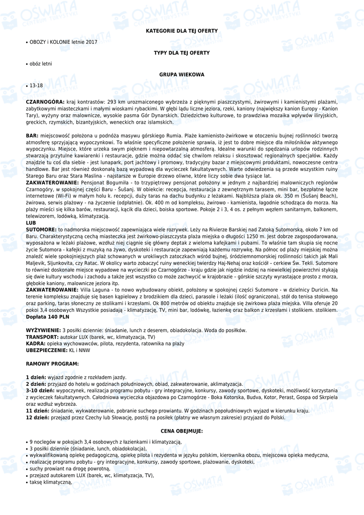 KATEGORIE DLA TEJ OFERTY ● OBOZY i KOLONIE letnie 2017 TYPY DLA TEJ OFERTY ● obóz letni GRUPA WIEKOWA ● 13-18 CZARNOGÓRA: kraj kontrastów: 293 km urozmaiconego wybrzeża z pięknymi piaszczystymi, żwirowymi i kamienistymi plażami, zabytkowymi miasteczkami i małymi wioskami rybackimi. W głębi lądu liczne jeziora, rzeki, kaniony (największy kanion Europy - Kanion Tary), wyżyny oraz malownicze, wysokie pasma Gór Dynarskich. Dziedzictwo kulturowe, to prawdziwa mozaika wpływów iliryjskich, greckich, rzymskich, bizantyjskich, weneckich oraz islamskich. BAR: miejscowość położona u podnóża masywu górskiego Rumia. Plaże kamienisto-żwirkowe w otoczeniu bujnej roślinności tworzą atmosferę sprzyjającą wypoczynkowi. To właśnie specyficzne położenie sprawia, iż jest to dobre miejsce dla miłośników aktywnego wypoczynku. Miejsce, które urzeka swym pięknem i niepowtarzalną atmosferą. Idealne warunki do spędzania urlopów rodzinnych stwarzają przytulne kawiarenki i restauracje, gdzie można oddać się chwilom relaksu i skosztować regionalnych specjałów. Każdy znajdzie tu coś dla siebie - jest lunapark, port jachtowy i promowy, tradycyjny bazar z miejscowymi produktami, nowoczesne centra handlowe. Bar jest również doskonałą bazą wypadową dla wycieczek fakultatywnych. Warte odwiedzenia są przede wszystkim ruiny Starego Baru oraz Stara Maslina - najstarsze w Europie drzewo oliwne, które liczy sobie dwa tysiące lat. ZAKWATEROWANIE: Pensjonat Bogumiła - to trzypiętrowy pensjonat położony w jednym z najbardziej malowniczych regionów Czarnogóry, w spokojnej części Baru - Šušanj. W obiekcie: recepcja, restauracja z zewnętrznym tarasem, mini bar, bezpłatne łącze internetowe (Wi-Fi) w małym holu k. recepcji, duży taras na dachu budynku z leżakami. Najbliższa plaża ok. 350 m (Šušanj Beach), żwirowa, serwis plażowy - na życzenie (odpłatnie). Ok. 400 m od kompleksu, żwirowo - kamienista, łagodnie schodząca do morza. Na plaży mieści się kilka barów, restauracji, kącik dla dzieci, boiska sportowe. Pokoje 2 i 3, 4 os. z pełnym węzłem sanitarnym, balkonem, telewizorem, lodówką, klimatyzacją. LUB SUTOMORE: to nadmorska miejscowość zapewniająca wiele rozrywek. Leży na Rivierze Barskiej nad Zatoką Sutomorską, około 7 km od Baru. Charakterystyczną cechą miasteczka jest żwirkowo-piaszczysta plaża miejska o długości 1250 m. Jest dobrze zagospodarowana, wyposażona w leżaki plażowe, wzdłuż niej ciągnie się główny deptak z wieloma kafejkami i pubami. To właśnie tam skupia się nocne życie Sutomora - kafejki z muzyką na żywo, dyskoteki i restauracje zapewniają każdemu rozrywkę. Na północ od plaży miejskiej można znaleźć wiele spokojniejszych plaż schowanych w urokliwych zatoczkach wśród bujnej, śródziemnomorskiej roślinności takich jak Mali Maljevik, Sljunkovita, czy Ratac. W okolicy warto zobaczyć ruiny weneckiej twierdzy Haj-Nehaj oraz kościół – cerkiew Św. Tekli. Sutomore to również doskonałe miejsce wypadowe na wycieczki po Czarnogórze - kraju gdzie jak nigdzie indziej na niewielkiej powierzchni stykają się dwie kultury wschodu i zachodu a także jest wszystko co może zachwycić w krajobrazie – górskie szczyty wyrastające prosto z morza, głębokie kaniony, malownicze jeziora itp. ZAKWATEROWANIE: Villa Laguna - to nowo wybudowany obiekt, położony w spokojnej części Sutomore - w dzielnicy Duricin. Na terenie kompleksu znajduje się basen kąpielowy z brodzikiem dla dzieci, parasole i leżaki (ilość ograniczona), stół do tenisa stołowego oraz parking, taras słoneczny ze stolikami i krzesłami. Ok 800 metrów od obiektu znajduje się żwirkowa plaża miejska. Villa oferuje 20 pokoi 3,4 osobowych Wszystkie posiadają - klimatyzację, TV, mini bar, lodówkę, łazienkę oraz balkon z krzesłami i stolikiem. stolikiem. Dopłata 140 PLN WYŻYWIENIE: 3 posiłki dziennie: śniadanie, lunch z deserem, obiadokolacja. Woda do posiłków. TRANSPORT: autokar LUX (barek, wc, klimatyzacja, TV) KADRA: opieka wychowawców, pilota, rezydenta, ratownika na plaży UBEZPIECZENIE: KL i NNW RAMOWY PROGRAM: 1 dzień: wyjazd zgodnie z rozkładem jazdy. 2 dzień: przyjazd do hotelu w godzinach południowych, obiad, zakwaterowanie, aklimatyzacja. 3-10 dzień: wypoczynek, realizacja programu pobytu - gry integracyjne, konkursy, zawody sportowe, dyskoteki, możliwość korzystania z wycieczek fakultatywnych. Całodniowa wycieczka objazdowa po Czarnogórze - Boka Kotorska, Budva, Kotor, Perast, Gospa od Skrpiela oraz wzdłuż wybrzeża. 11 dzień: śniadanie, wykwaterowanie, pobranie suchego prowiantu. W godzinach popołudniowych wyjazd w kierunku kraju. 12 dzień: przejazd przez Czechy lub Słowację, postój na posiłek (płatny we własnym zakresie) przyjazd do Polski. CENA OBEJMUJE: ● ● ● ● ● ● ● 9 noclegów w pokojach 3,4 osobowych z łazienkami i klimatyzacją, 3 posiłki dziennie (śniadanie, lunch, obiadokolacja), wykwalifikowaną opiekę pedagogiczną, opiekę pilota i rezydenta w języku polskim, kierownika obozu, miejscowa opieka medyczna, realizację programu pobytu - gry integracyjne, konkursy, zawody sportowe, plażowanie, dyskoteki, suchy prowiant na drogę powrotną, przejazd autokarem LUX (barek, wc, klimatyzacja, TV), taksę klimatyczną, ● ● ● ubezpieczenie KL - 10 000 EUR, NNW - 7000 zł i bagaż – 800 zł (ubezpieczenie Signal Iduna, wariant BP_1), całodniową wycieczkę objazdową po Czarnogórze - Boka Kotorska, Budva, Kotor, Perast, Gospa od Skrpiela oraz wzdłuż wybrzeża. składka na Turystyczny Fundusz Gwarancyjny CENA NIE OBEJMUJE: ● ● ● ● ● zwrotnej kaucji 20 EUR/os. (pobierana podczas drogi i zwracana w ostatnim dniu pobytu po sprawdzeniu pokoi), świadczeń nie wymienionych w ofercie, wycieczek fakultatywnych, dodatkowych napoi (poza wodą) do obiadokolacji. dopłaty do zakwaterowania w Villa Laguna*** WYCIECZKI FAKULTATYWN