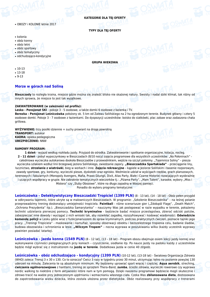 KATEGORIE DLA TEJ OFERTY ● OBOZY i KOLONIE letnie 2017 TYPY DLA TEJ OFERTY ● ● ● ● ● ● kolonia obóz konny obóz letni obóz sportowy obóz tematyczny odchudzająco-kondycyjne GRUPA WIEKOWA ● ● ● 10-13 13-18 9-13 Morze w górach nad Soliną Bieszczady to rozległa kraina, miejsce gdzie można się znaleźć blisko nie skażonej natury. Swoisty i nadal dziki klimat, tak różny od innych sprawia, że miejsce to jest tak wyjątkowe. ZAKWATEROWANIE (w zależności od profilu): Lesko - Pensjonat SKI - pokoje 3 - 5 osobowe, a także domki 6 osobowe z łazienką i TV. Berezka - Pensjonat Leśniczówka położony ok. 5 km od Zalewu Solińskiego na 2 ha ogrodzonym terenie. Budynek główny i cztery 5 osobowe domki. Pokoje 3 - 7 osobowe z łazienkami. Do dyspozycji uczestników: boisko do siatkówki, plac zabaw oraz zadaszona chata grillowa. WYŻYWIENIE: trzy posiłki dziennie + suchy prowiant na drogę powrotną TRANSPORT: autokar KADRA: opieka pedagogiczna UBEZPIECZENIE: NNW RAMOWY PROGRAM: 1 dzień - wyjazd według rozkładu jazdy. Przyjazd do ośrodka. Zakwaterowanie i spotkanie organizacyjne, kolacja, nocleg. 2 - 11 dzień - pobyt wypoczynkowy w Bieszczadach (8/10 nocy) zajęcia programowe dla wszystkich uczestników: „Na Połoninach” całodniowa wycieczka autokarowa dookoła Bieszczadów z przewodnikiem, wejście na szczyt połoniny. „Tajemnice Soliny” – piesza wycieczka szlakiem wzdłuż linii brzegowej jeziora Solińskiego, zwiedzanie zapory. „Bieszczadzka Spartakiada” – przeciąganie liny, łucznictwo, strzelanie z wiatrówki, bieg w workach i inne. Zajęcia rekreacyjne – kąpiele w Jeziorze Solińskim i basenie rozporowym, zawody sportowe, gry, konkursy, wycieczki piesze, dyskoteki oraz ognisko. Weźmiecie udział w wyścigach rzędów, grach planszowych, terenowych i fabularnych (Monopoly Avengers, Mafia, Prawo Dżungli, Dixit, Alias Party, Białe i Czarne Historie) rozwijających wyobraźnię i uczących współpracy w grupie. Nie zabraknie tematycznych wieczorków tj.: „Piżama Party”, „Mam Talent”, karaoke, wybory „Miss i Mistera” czy „Śluby Obozowe”, które na długo zapadną w Waszej pamięci. Ponadto do wyboru programy tematyczne: Leśniczówka - Detektywistyczny Bieszczadzki Tropiciel (1399 PLN) (8 - 13 lat), (14 - 18 lat) - Obóz pełen przygód w odkrywaniu tajemnic, które ukryte są w malowniczych Bieszczadach. W programie: „Szkolenie Bieszczadnika” – na leśnej polanie przeprowadzimy trening doskonalący umiejętności tropiciela. Paintball - różne scenariusze gier („Zdobądź Flagę”, „Death Match”, „Ochrona Prezydenta” itp.). „Bieszczadzka Samarytanka” – nauczymy Was jak postępować w razie wypadku w terenie, pokażemy techniki udzielania pierwszej pomocy. Techniki kryminalne - będziecie badać miejsce przestępstwa, zbierać odciski palców, zabezpieczać inne dowody i wyciągać z nich wnioski tak, aby rozwikłać zagadkę, rozszyfrowywać i kodować wiadomości. Odwiedzicie komendę policji w Lesku gdzie wraz z funkcjonariuszem do spraw kryminalnych, podczas praktycznych ćwiczeń, poznacie tajniki jego pracy. „Treningi Tropiciela” - maskowanie i kamuflaż, sposoby obserwacji obiektu i bezszelestnego tropienia celu, badanie śladów, budowa obozowiska i schronienia w lesie. „Wilczym Tropem” – nocna wyprawa w poszukiwaniu wilka (każdy uczestnik wyprawy powinien posiadać latarkę). Leśniczówka - Jazda konna (1549 PLN) (8 - 12 lat), (13 - 18 lat) - Program obozu obejmuje osiem lekcji jazdy konnej oraz wykonywanie czynności pielęgnacyjnych przy koniach – czyszczenie, siodłanie itp. Po nauce jazdy na padoku każdy z uczestników będzie mógł wybrać się z instruktorem na jazdę w terenie. Dodatkowa jazda w cenie 40 zł/godz. Leśniczówka - obóz odchudzająco - kondycyjny (1399 PLN) (10-12 lat), (13-18 lat) - Światowa Organizacja Zdrowia (WHO) zaleca: Trenuj 3 x 30 x 130. Co to oznacza? Ćwicz 3 razy w tygodniu przez 30 minut, utrzymując tętno na poziomie powyżej 130 uderzeń na minutę. Zalecenia te są absolutnym minimum. My będziemy uprawiać sport więcej i częściej. Aqua aerobik, streching, ćwiczenia ogólnorozwojowe z hantlami, trening ze sprzętem Thera–Band, zumba, ścieżki zdrowia, wycieczki rowerowe czy wyprawa nordic walking to niektóre z form aktywności które nam w tym pomogą. Dzięki naszemu programowi będziecie mogli skutecznie i zdrowo tracić na wadze przy jednoczesnym ujędrnianiu i wzmacnianiu własnego ciała. Czeka Was zbilansowana dieta, dostosowana do zapotrzebowania wieku dziecka, która została ułożona przez dietetyków. Obóz realizowany przy współpracy z trenerami personalnymi i dietetykami układającymi program oparty na aktualnej wiedzy zakresu fizjologii, anatomii, korekcji wad postawy czy odpowiedniej bazy ćwiczeń. Postaramy się abyście po naszym obozie śmielej podejmowali nowe wyzwania, ciesząc się każdym dniem bez problemów zdrowotnych. Lesko SKI - Projekt Przygoda (1449 PLN) (8-12 lat), (13-18 lat) Program obozu: Quadomania - przejażdżki quadem. Ogniska i wieczory legend – wspólne wieczorki przy ogniskach, snując smętne opowieści i legendy bieszczadzkie. Zajęcia linowe – technika posługiwania się liną, uprzężami, karabinkami i bloczkami. Zjazd tyrolski, most panamski, ściana wspinaczkowa. Weremień Exploration – gra terenowa, w trakcie której przeprawimy się przez górskie przeszkody, a w zakamarkach Weremienia nauczymy Was posługiwania się mapami, kompasem oraz GPS`em. Strzelectwo - spróbujesz swoich siłę strzelając z repliki broni palnej: krótkiej, długiej i wiatrówki. Slackline – taśma napięta między dwoma punktami stwarza doskonałe możliwości do ćwiczenia równowagi. Satysfakcja i ogromna frajda z każdego kolejnego kroku. Zostań Bieszczadzkim Traperem – na leśnej polanie przeprowadzimy konkurencje: mega bramka celnościowa, Mega Dart, przeciąganie liny, strze