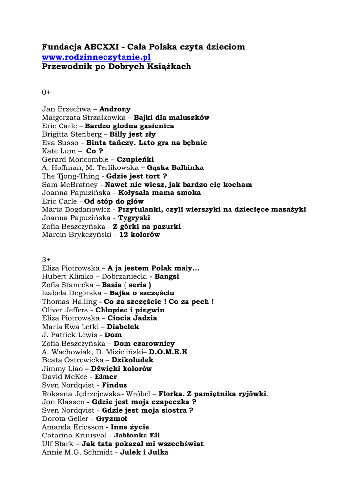 Fundacja ABCXXI - Cała Polska czyta dzieciom www.rodzinneczytanie.pl Przewodnik po Dobrych Książkach 0+ Jan Brzechwa – Androny Małgorzata Strzałkowka – Bajki dla maluszków Eric Carle – Bardzo głodna gąsienica Brigitta Stenberg – Billy jest zły Eva Susso – Binta tańczy. Lato gra na bębnie Kate Lum – Co ? Gerard Moncomble – Czupieńki A. Hoffman, M. Terlikowska – Gąska Balbinka The Tjong-Thing - Gdzie jest tort ? Sam McBratney - Nawet nie wiesz, jak bardzo cię kocham Joanna Papuzińska - Kołysała mama smoka Eric Carle - Od stóp do głów Marta Bogdanowicz - Przytulanki, czyli wierszyki na dziecięce masażyki Joanna Papuzińska - Tygryski Zofia Beszczyńska - Z górki na pazurki Marcin Brykczyński - 12 kolorów 3+ Eliza Piotrowska – A ja jestem Polak mały… Hubert Klimko – Dobrzaniecki - Bangsi Zofia Stanecka – Basia ( seria ) Izabela Degórska – Bajka o szczęściu Thomas Halling - Co za szczęście ! Co za pech ! Oliver Jeffers - Chłopiec i pingwin Eliza Piotrowska – Ciocia Jadzia Maria Ewa Letki – Diabełek J. Patrick Lewis - Dom Zofia Beszczyńska – Dom czarownicy A. Wachowiak, D. Mizieliński– D.O.M.E.K Beata Ostrowicka – Dzikoludek Jimmy Liao – Dźwięki kolorów David McKee - Elmer Sven Nordqvist - Findus Roksana Jędrzejewska- Wróbel – Florka. Z pamiętnika ryjówki. Jon Klassen - Gdzie jest moja czapeczka ? Sven Nordqvist - Gdzie jest moja siostra ? Dorota Geller - Gryzmoł Amanda Ericsson - Inne życie Catarina Kruusval - Jabłonka Eli Ulf Stark – Jak tata pokazał mi wszechświat Annie M.G. Schmidt - Julek i Julka Astrid Lindgren - Ja też chcę mieć rodzeństwo Lotta Geffenblad - Kamyki Astona Joanna Chmielewska - Kłopot Christina Bjork - Linnea w ogrodzie Moneta Roksana Jędrzejewska – Wróbel - Maleńkie królestwo królewny Aurelki A. i D.Mizielińscy - Mapy A. i D. Mizielińscy - Miasteczko Mamoko J.i T. Wieslander - Mama Mu Liliana Bardijewska - Moje – nie moje Joanna Papuzińska - Mój tato szczęściarz Pija Lindenbaum - Nusia i wilki Stanisław Wygodzki - Odwiedziła mnie żyrafa Jacek Jelonkiewicz - Okruszek z Zaczarowanego Lasu Ian Falconer - Oliwia Wojciech Widłak - Pan Kuleczka ( seria ) Astrid Lindgren - Pewnie, że Lotta umie jeździć na rowerze Anna Onichimowska - Piecyk, czapeczka i budyń Simme Tabback - Płaszcz Józefa Emily Horn - Przepraszam, czy jesteś czarownicą ? Adam Jaromir - Słoniątko Danuta Wawiłow - Strasznie ważna rzecz Markus Majaluoma - Tato, popłyńmy na wyspę Zdenek Sverak - Ucieszki Cieszka Przemysław Wechterowicz – W pogoni za życiem Wojciech Widłak - Wesoły Ryjek Małgorzata Strzałkowska - Wiersze do poduchy Małgorzata Strzałkowska - Wiersze, że aż strach Melanie Watt - Wiewiór wystraszony Maria Marjańska- Czernik - Wypożyczalnia babć Łukasz Wierzbicki - Wyprawa niesłychana Benedykta i Jana Annelore Parot - Yumi Anna Onichimowska - Zasypianki na każdy dzień miesiąca Małgorzata Strzałkowska - Zielony, żółty, rudy, brązowy ! Liliana Bardijewska - Zielony wędrowiec Bibi Dumon Tak - Zwierzaki – cudaki Max Velthuijs – Żabka i obcy Eliza Piotrowska - Żółte kółka 6+ Małgorzata Strykowska-Zaręba – Abecelki Łukasz Wierzbicki – Afryka Kazika Markery Williams – Aksamitny królik Joanna Papuzińska – Asiunia Baśnie świata ( Media Rodzina ) David Williams – Babcia Rabuś Zbigniew Kiersznowski – Baśnie japońskie. Bezpowrotna góra Paweł Beręsewicz – Co tam u Ciumków ? Ivona Brezinova – Cukierek dla dziadka Tadka Afanasjewowie – Czarodziejski Młyn Iwona Chmielewska – Cztery zwykłe miski Ulf Stark – Czy umiesz gwizdać Joanno ? Liliana Bardijewska – Dom ośmiu tajemnic Łukasz Wierzbicki – Dziadek i niedźwiadek Oskar Brenifier - Dzieci filozofują ( seria ) David Almond - Dzikus Edith Nesbit – Feniks i dywan Ingelin Angerborn – Gdybym nie pomyliła psów Sali Peltoniemi – Groszka. Piesek, który chciał mieć dziewczynkę Michał Rusinek – Jak robić przekręty. Poradnik dla dzieci T. Kwaśniewski, A. Bedyńska – Jedno oko na Maroko Leo Buscaglia – Jesień liścia Jasia Beata Ostrowicka – Jest taka historia. Opowieść o Januszu Korczaku Katarzyna Kotowska – Jeż Ingmar Fjell – Joachim Lis Grzegorz Kasdepke - Kacperiada Roksana Jędrzejewska – Wróbel - Kamienica Rafał Witek – Klub latających ciotek Maria Ewa Letki – Królewna w koronie Marek Bieńczyk – Książę w cukierni Andrzej Maleszka – Magiczne drzewo Szymon Sławiński – Mały Powstaniec Barbara Voors – Mama, która zagderała się na śmierć Zuzanna Orlińska – Matka Polka Grzegorz Kasdepke – Mity dla dzieci Rose Lagercrantz – Moje szczęśliwe życie Joanna Papuzińska - Mój tata szczęściarz Tove Jansson - Muminki Michael Ende – Niekończąca się historia Gianni Rodari – Niewidzialny Tonino Ulrich Hub – O ósmej na arce Małgorzata Strzałkowska – O wartościach Miroslav Sasek – Oto jest Paryż ( seria ) Wanda Chotomska – Panna Kreseczka Heine Janisz – Pan Jaromir i arcyzłodziej Leena Krohn – Pelikan. Opowieść z miasta Asa Lind – Piaskowy Wilk Joanna Olech – Pompon w rodzinie Fisiów Oscar Brenifier – Prawda według Niny Otfried Preussler –Rozbójnik Hotzenplotz Marketa Bankowa - Sroka w krainie entropii Zofia Stanecka – Świat według dziadka Martin Widmark – Tajemnica mumii Paweł Beręsewicz – Tajemnica człowieka z blizną Myoko Matsutani - Tatsu Taro, syn smoka Maria Parr - Tonja z Glimmerdalen Moni Nilsson - Tsatsiki A. i D. Mizielińscy – Tu jesteśmy. Kosmiczne wyprawy, wizje i eksperymenty Olga Masiak – Tydzień Konstancji Jerzy Broszkiewicz – Wielka, większa i największa Paweł Beręsewicz – Warszawa. Spacery z Ciumkami A. M. Grabowski – Wojna na Pięknym Brzegu Renata Piątkowska – Wszystkie moje mamy Joanna Rudniańska - XY Małgorzata Strzałkowska – Zielony i Nikt Barbara Gawryluk - Zuzanka z pistacjowego domu Vera Ferra-Mikura – Zwierzyn