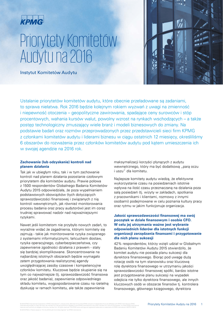 Priorytety Komitetów Audytu na 2016 Instytut Komitetów Audytu Ustalanie priorytetów komitetów audytu, które obecnie przeładowane są zadaniami, to sprawa niełatwa. Rok 2016 będzie kolejnym rokiem wyzwań z uwagi na zmienność i niepewność otoczenia – geopolityczne zawirowania, spadające ceny surowców i stóp procentowych, wahania kursów walut, powolny wzrost na rynkach wschodzących – a także postęp technologiczny zmuszający wiele branż i modeli biznesowych do zmiany. Na podstawie badań oraz rozmów przeprowadzonych przez przedstawicieli sieci firm KPMG z członkami komitetów audytu i liderami biznesu w ciągu ostatnich 12 miesięcy, określiliśmy 6 obszarów do rozważenia przez członków komitetów audytu pod kątem umieszczenia ich w swojej agendzie na 2016 rok. Zachowanie (lub odzyskanie) kontroli nad planem działania Tak jak w ubiegłym roku, tak i w tym zachowanie kontroli nad planem działania pozostanie czołowym priorytetem dla komitetów audytu. Prawie połowa z 1500 respondentów Globalnego Badania Komitetów Audytu 2015 odpowiedziała, że poza wypełnianiem podstawowych obowiązków (tych dotyczących sprawozdawczości finansowej i związanych z nią kontroli wewnętrznych, jak również monitorowania procesu badania oraz pracy audytorów) jest im coraz trudniej sprawować nadzór nad najważniejszymi ryzykami. Nawet jeśli komitetom nie przybyło nowych zadań, to wyraźnie widać że zagadnienia, którymi komitety się zajmują - takie jak monitorowanie ryzyka związanego z systemami informatycznymi, łańcuchem dostaw, ryzyka operacyjnego, cyberbezpieczeństwa, czy zapewnienie zgodności działania z prawem - stały się bardziej skomplikowane. Skoncentrowanie na najbardziej istotnych obszarach będzie wymagało zatem przygotowania realistycznej agendy uwzględniającej zasoby czasowe i kompetencyjne członków komitetu. Kluczowe będzie skupienie się na tym co najważniejsze (tj. sprawozdawczość finansowa oraz jakość badania), zapewnienie odpowiedniego składu komitetu, wygospodarowanie czasu na rzetelną dyskusję w ramach komitetu, ale także zapewnienie maksymalizacji korzyści płynących z audytu wewnętrznego, który ma być dodatkową „parą oczu i uszu” dla komitetu. Najlepsze komitety audytu wiedzą, że efektywne wykorzystanie czasu na posiedzeniach istotnie wpływa na ilość czasu przeznaczaną na działania poza salą posiedzeń (tj. wizyty w zakładach, spotkania z pracownikami i klientami, rozmowy z innymi osobami) podejmowane w celu poznania kultury pracy oraz rytmu w jakim funkcjonuje organizacja. Jakość sprawozdawczości finansowej ma swój początek w dziale finansowym i osobie CFO. W celu jej utrzymania ważne jest wybranie odpowiednich liderów dla istotnych funkcji organizacji zarządzania finansami i przygotowanie dla nich planu sukcesji 42% respondentów, którzy wzięli udział w Globalnym Badaniu Komitetów Audytu 2015 stwierdziło, że komitet audytu nie posiada planu sukcesji dla dyrektora finansowego. Biorąc pod uwagę dużą rotację osób na tym stanowisku oraz kluczową rolę dyrektora finansowego w utrzymaniu jakości sprawozdawczości finansowej spółki, bardzo istotne jest przygotowanie planu sukcesji na wypadek odejścia nie tylko dyrektora finansowego, ale innych kluczowych osób w obszarze finansów tj. kontrolera finansowego, głównego księgowego, dyrektora © 2016 KPMG International Cooperative (“KPMG International”), a Swiss entity. Member firms of the KPMG network of independent firms are affiliated with KPMG International. KPMG International provides no client services. No member firm has any authority to obligate or bind KPMG International or any other member firm vis-à-vis third parties, nor does KPMG International have any such authority to obligate or bind any member firm. All rights reserved. The KPMG name and logo are registered trademarks or trademarks of KPMG International. NDPPS 516610 © 2016 KPMG in Poland, based on “On the 2016 Audit Committee Agenda” by KPMG international. Priorytety Komitetów Audytu na 2016 1 ds. kontroli wewnętrznej, dyrektora departamentu skarbu (treasurer), dyrektora ds. zapewnienia zgodności działania z prawem i przepisami (chief compliance oficer) oraz dyrektora ds. ryzyka (chief risk officer). Jak komitet audytu ocenia zasoby kompetencyjne w organizacji zarządzania finansami? Czy osobom tym zapewnia się szkolenia i zasoby potrzebne do osiągnięcia sukcesu? W jaki sposób osoby te są motywowane do angażowania się w sprawy spółki w długiej perspektywie? Co myśli na ten temat audytor wewnętrzny i biegły rewident spółki? Monitorowanie szacunków wartości godziwej, utraty wartości aktywów oraz ocena głównych założeń, na których opierają się najważniejsze szacunki księgowe Te i inne kwestie, takie jak straty z tytułu zobowiązań warunkowych, niepewność co do kontynuacji działalności spółki, nietypowe transakcje o kluczowym znaczeniu, czy finansowe powiązania i transakcje z kluczową kadrą kierowniczą spółki powinny być w centrum uwagi komitetów audytu. Największe ryzyko w sprawozdawczości finansowej często dotyczy obszarów, gdzie istnieje wiele możliwych rozwiązań i tych, w których kierownictwo musi 2 Priorytety Komitetów Audytu na 2016 dokonywać skomplikowanych osądów i szacunków. Dla zapewnienia jakości sprawozdawczości finansowej potrzebny jest usystematyzowany, solidny i zapewniający bezstronność proces dokonywania osądów księgowych i określania wartości szacunkowych. Aby to osiągnąć komitety audytu powinny postarać się zrozumieć ramy działania kierownictwa spółki oraz upewniać się, że zarząd wprowadził odpowiednie mechanizmy kontrolne. Warto byłoby także poznać zdanie biegłego rewidenta w tym zakresie. Ocena przygotowania spółki na zastosowanie wspólnego standardu IASB i FASB dotyczącego ujęcia przychodów oraz raportowania CbC w zakresie podatków (tzw