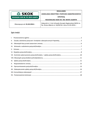 REGULAMIN UDZIELANIA KREDYTÓW I POŻYCZEK ZABEZPIECZONYCH HIPOTEKĄ REGIONALNEJ SKOK IM. ŚW. BRATA ALBERTA Obowiązuje od: 01.04.2016 r. Załącznik nr 1 do Uchwały Zarządu Regionalnej SKOK im. Św. Brata Alberta nr 34/03/16 z dnia 31.03.2016 r. Spis treści I. Postanowienia ogólne ....................................................................................................................... 2 II. Zasady udzielania pożyczek i kredytów zabezpieczonych hipoteką ................................................. 3 III. Obowiązki Kasy przed zawarciem umowy ........................................................................................ 6 IV. Wniosek o udzielenie pożyczki/kredytu ........................................................................................... 7 V. Umowa .............................................................................................................................................. 7 VI. Wypłata pożyczki/kredytu ................................................................................................................. 8 VII. Kontrola wykorzystania pożyczki/kredytu i spłaty pożyczki/kredytu............................................ 10 VIII. Obowiązki pożyczkobiorcy/kredytobiorcy ..................................................................................... 11 IX. Spłata pożyczki/kredytu.................................................................................................................. 11 X. Wypowiedzenie umowy ................................................................................................................. 12 XI. Oprocentowanie pożyczki/kredytu ................................................................................................ 13 XII. Zabezpieczenie spłaty pożyczki/kredytu ........................................................................................ 14 XIV. Konsolidacja zobowiązań ............................................................................................................... 17 XV. Postanowienia końcowe ................................................................................................................ 18 I. Postanowienia ogólne §1 1. Niniejszy Regulamin określa, z zastrzeżeniem ust. 3, zasady udzielania przez Regionalną Spółdzielczą Kasę Oszczędnościowo-Kredytową im. Św. Brata Alberta, swoim członkom pożyczek i kredytów zabezpieczonych hipoteką, do których zastosowanie znajdują przepisy ustawy z dnia 12 maja 2011 r. o kredycie konsumenckim (tekst jednolity Dz. U. z 2014 roku, poz. 1497 z późn. zm.). 2. Niniejszy Regulamin nie ma zastosowania do pożyczek i kredytów niezabezpieczonych hipoteką. 3. Pożyczka lub kredyt udzielane na podstawie niniejszego Regulaminu nie mogą być przeznaczone na cele związane z prowadzoną przez członka działalnością gospodarzą. 4. Pożyczka lub kredyt udzielane są na podstawie niniejszego Regulaminu jedynie w walucie polskiej. §2 Użyte w Regulaminie określenia oznaczają: 1) Kasa lub SKOK – Regionalną Spółdzielczą Kasę Oszczędnościowo-Kredytową im. Św. Brata Alberta; 2) Regulamin - Regulamin udzielania pożyczek i kredytów zabezpieczonych hipoteką Regionalnej Spółdzielczej Kasy Oszczędnościowo - Kredytowej im. Św. Brata Alberta; 3) całkowity koszt kredytu - wszelkie koszty, które pożyczkobiorca/kredytobiorca jest zobowiązany ponieść w związku z umową o kredyt, w szczególności: a) odsetki, opłaty, prowizje, podatki i marże jeżeli są znane Kasie oraz b) koszty usług dodatkowych w przypadku gdy ich poniesienie jest niezbędne do uzyskania kredytu; - z wyjątkiem kosztów opłat notarialnych ponoszonych przez pożyczkobiorcę/kredytobiorcę; 4) całkowita kwota kredytu - suma wszystkich środków pieniężnych, które Kasa udostępnia pożyczkobiorcy/kredytobiorcy na podstawie umowy pożyczki/kredytu; 5) całkowita kwota do zapłaty przez pożyczkobiorcę/kredytobiorcę - suma całkowitego kosztu kredytu i całkowitej kwoty kredytu; 6) stopa referencyjna - stopa oprocentowania służąca za podstawę ustalenia oprocentowania pożyczki/kredytu, odnosząca się do minimalnego oprocentowania podstawowych operacji otwartego rynku, prowadzonych przez Narodowy Bank Polski, ustalana przez Radę Polityki Pieniężnej, ogłaszana w Dzienniku Urzędowym Narodowego Banku Polskiego; 7) stopa oprocentowania pożyczki/kredytu – stopa oprocentowania wyrażona jako stałe lub zmienne oprocentowanie, stosowane do wypłaconej kwoty na podstawie umowy o kredyt w stosunku rocznym; 8) stała stopa oprocentowania pożyczki/kredytu - stopa oprocentowania określona wyłącznie w umowie pożyczki/kredytu, przy wykorzystaniu określonej stałej wartości procentowej wyrażonej na cały czas obowiązywania umowy lub w danych okresach obowiązywania umowy; 9) rzeczywista roczna stopa oprocentowania - całkowity koszt kredytu ponoszony przez pożyczkobiorcę/kredytobiorcę, wyrażony jako wartość procentowa całkowitej kwoty kredytu w stosunku rocznym; 10) bazy danych - zbiory danych prowadzone dla celów oceny zdolności kredytowej przez instytucje, o których mowa w art. 105 ust. 4 ustawy z dnia 29 sierpnia 1997 r. - Prawo bankowe (Dz. U. z 2002 r. Nr 72, poz. 665, z późn. zm.5)), oraz biura informacji gospodarczej, o których mowa w ustawie z dnia 9 kwietnia 2010 r. o udostępnianiu informacji gospodarczych i wymianie danych gospodarczych (Dz. U. Nr 81, poz. 530, Nr 182, poz. 1228 i Nr 217, poz. 1427); 11) trwały nośnik - materiał lub urządzenie służące do przechowywania i odczytywania informacji przekazywanych pożyczkobiorcy/kredytobiorcy w związku z umową pożyczki/kredytu, przez czas odpowiedni do celów jakim informacje te służą oraz pozwalające na odtworzenie tych informacji w niezmienionej postaci; 2 12) dom jednorodzinny - budynek mieszkalny jednorodzinny w rozumieniu przepisów ustawy z dnia 7 lipca 1994 r. - Prawo budowlan