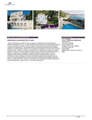 Kod: Francja - Lazurowe Wybrzeże Majestatyczna posiadłość dla 10 osób Willa wybudowana w 1890r cieszy się jedną z najbardziej uprzywilejowanych lokalizacji południa Francji - ponad miasteczkiem Villefranche, skąd rozpościerają się niczym niezakłócone widoki na morze. Willa została gruntownie odrestaurowana i urządzona w klasycznym, ale zapewniającym nowoczesny komfort stylu. Budynek składa się z trzech pięter, każde z nich z pięknymi widokami na morze, oraz z tarasu na dachu willi - idealnym miejscu do wypoczynku i podziwiania sunących w oddali jachtów i statków. 4 minuty spaceru wystarczą aby dotrzeć do niewielkiego portu z dobrymi restauracjami, sklepikami i targiem antyków odbywającym się tu co niedziela. Willa jest bardzo dobrze skomunikowana: położona blisko centrum Villefranche, trasy kolejowej i malowniczej drogi wiodącej wzdłuż wybrzeża. Tym samym willa przeznaczona jest nie tyle dla gości szukających spokojnej, wiejskiej okolicy, co dla wszystkich, którzy chcą poczuć uroki barwnego i energicznego życia Francuskiej Riviery- „joie de vivre!" - jak mówią miejscowi. Charakterystyka Kraj: Francja Region: Lazurowe Wybrzeże Standard: 5 Ilość osób: 12-14 Liczba sypialni: 5 Odległość od morza: 70 m Liczba łazienek: 5 Basen: tak Odległość od centrum miasta: 4 min 1/2 Zakwaterowanie: Budynek główny: Parter: salon z francuskimi drzwiami wiodącymi na taras z widokiem na basen i na morze, w salonie kominek, marmurowe podłogi, telewizor, video, CD; toaleta; jadalnia również z wyjściem na taras i widokiem na morze, do jadalni przylega świetnie wyposażona kuchnia, a także atrium z obszernym tarasem, odpowiednim nawet do organizowania większych przyjęć (40 osób), 2 grille; Pierwsze piętro: dwie dwuosobowe sypialnie (jedna z oddzielnymi łóżkami) z garderobami, wyjściem na taras, łazienkami z prysznicem, toaletami; toaleta dla gości. Drugie piętro: dwie dwuosobowe sypialnie (jedna z oddzielnymi łóżkami) z garderobami, wyjściem na taras, łazienkami z prysznicem - wejście do jednej z łazienek również bezpośrednio z korytarza. Wszystkie sypialnie w budynku głównym są klimatyzowane i mają wspaniały widok na morze. Trzecie piętro: taras na dachu. Domek gościnny: niewielki salonik, sypialnia dwuosobowa, łazienka, toaleta. Dookoła willi znajduje się ogród położony na dwóch poziomach, z tarasem dookoła basenu (12x5m) na niższym poziomie oraz trawnikiem na wyższym poziomie, z którego stopnie prowadzą na umeblowany taras. Z tyłu willi, na kolejnym tarasie, znajduje się plac zabaw dla dzieci z huśtawkami i zjeżdżalnią. Garaż na 1 auto. Dodatkowe informacje: w cenę wliczono 8 godzin sprzątania w tygodniu, internet ADSL. Dodatkowo płatne: podgrzewanie basenu - 300 EUR za tydzień, ogrzewanie willi zimą, klimatyzacja. Lokalizacja: 70 metrów od plaży, Villefranche, 4 minuty pieszo od sklepów, restauracji i portu, Cap Ferrat - 5 min. jazdy, Nicea i Monako - 15 minut. Cena za tydzień wynajmu: od 15 375 GBP w niskim sezonie, 16650 GBP w wysokim sezonie. 2/2 Powered by TCPDF (www.tcpdf.org)
