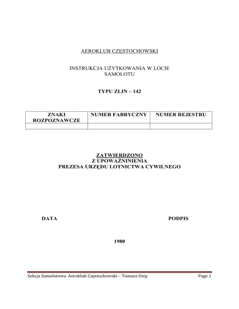 AEROKLUB CZĘSTOCHOWSKI INSTRUKCJA UśYTKOWANIA W LOCIE SAMOLOTU TYPU ZLIN – 142 ZNAKI ROZPOZNAWCZE NUMER FABRYCZNY NUMER REJESTRU ZATWIERDZONO Z UPOWAśNINIENIA PREZESA URZĘDU LOTNICTWA CYWILNEGO DATA PODPIS 1980 Sekcja Samolotowa Aeroklub Częstochowski – Tomasz Osip Page 1 ZLIN-142 – INSTRUKCJA UśYTKOWANIA W LOCIE W niniejszej Instukcji uŜytkowania w Locie samolotu Z-142 nie wolno dokonywać Ŝadnych zmian, wpisów i uzupełnień bez zgody Urzędu Lotnictwa Cywilnego. W razie zgubienia niniejszej instrukcji naleŜy niezwłocznie zawiadomić Urząd Lotnictwa Cywilnego, a poza granicami państwa – placówkę analogiczną. KaŜda osoba, która znajdzie niniejszą instrukcję, winna przesłać ją niezwłocznie do Urzędu Lotnictwa Cywilnego, 00-848 Warszawa ul. śelazna 59, a poza granicami państwa do placówki analogicznej. Sekcja Samolotowa Aeroklub Częstochowski – Tomasz Osip Page 2 INSTRUKCJA UśYTKOWANIA W LOCIE SAMOLOTU Z L I N – 142 Producent: MORAWAN, Przedsiębiorstwo Państowowe OTROKOWICE CSRS Niniejsza instrukcja jest częścią składową świadectwa sprawności technicznej wydanego dla samolotu o znakach rozpoznawczych: Nr rejestracyjny Nr fabryczny/nr serii ……………….. ……………/………… Kategoria: AKROBACYJNA NORMALNA Przepis bodowy: /A/ /N/ FAR PART 23 NEW z wprowadzonymi zmianami do Nr 23-13 włącznie Tekst w języku czeskim został zatwierdzony przez Państwowy Inspektorat Lotnictwa w Pradze – Nr orzeczenia 5326/1254/79/Nw. Podczas eksploatacji s-tu Zlin-142 muszą być przestrzegane ograniczenia uŜytkowania zawarte w rozdz. 2 i w rozdz. 7 ninejszej instrukcji: „Niniejsza instrukcja została opracowana przez Dział techniczny ZG Aeroklubu PRL na podstawie tłumaczenia instrukcji producenta wyd. 1980 – wersja językowa rosyjska oraz uwag i zaleceń IKCSP.” Uzgodniono z Ministerstwem Komunikacji – Inspektoratem Kontroli Cywilnych Statków powietrznych. Sekcja Samolotowa Aeroklub Częstochowski – Tomasz Osip Page 3 SPIS TREŚCI Strona Rozdział 1. - Informacje ogólne 1.1. Wstęp 1.2. Zmiany 1.3. Skróty i definicje 1.4. Rysunek gabarytowy zamolotu ZLIN – 142 1.5. Opis techniczny 1.6. Podstawowe dane techniczne 1.7. WyposaŜenie kabiny Rozdział 2. – Ograniczenia uŜytkowania 2.1. WaŜność ograniczeń uŜytkowania 2.2. Zakres uŜytkowania 2.3. Dopuszczalna masa s-tu do startu i lądowania 2.4. Maksymalna dopuszczalna masa uŜytkowa samolotu 2.5. PołoŜenie środka masy 2.6. Zespół napędowy 2.7. Kolorowe oznakowanie przyrządów kontroli silnika 2.8. Paliwo 2.9. Napełnianie zbiorników paliwowych 2.10. Olej dla silnika 2.11. Napełnianie zbiornika olejowego 2.12. Dopuszczalne prędkości lotu 2.13. Kolorowe oznakowanie predkościomierza i przyspieszeniomierza 2.14. Współczynniki obciąŜenia i krzywe wyrwania 2.15. Figury akrobacji 2.16. Dopuszczalny zakres temperatur powietrza otaczającego 2.17. Największe dopuszczalne składowe wiatru przy starcie i lądowaniu 2.18. Loty w warunkach oblodzenia 2.19. Hamowanie kół podwozia 2.20. Minimalna liczba załogi 2.21. Palenie tytoniu 2.22. Minimalne ciśnienie azotu w dźwigarze skrzydła 2.23. Kolorowe oznakowanie manometru ciśnienia azotu w dźwigarze skrzydła 2.24. Kołowanie 2.25. Tabliczki informacyjne 2.26. Wykres do wyznaczania dopuszczalnych składowych wiatru Sekcja Samolotowa Aeroklub Częstochowski – Tomasz Osip Page 4 Strona Rozdział 3. Sytuacje awaryjne 3.1. PoŜar silnika lub instalacji paliwowej podczas lotu 3.2. Przymusowe opuszczenie samolotu przez wykonanie skoku ze spadochronem 3.3. Spadek ciśnienia azotu w pasie dźwigara centropłata 3.4. Przepalenie kolektora wylotowego spalin Rozdział 4. – Czynności normalne 4.1. Czynności przed wejściem do kabiny 4.2. Czynności po wejściu do kabiny 4.3. Rozruch silnika 4.4. Grzanie silnika 4.5. Próba silnika 4.6. Kołowanie 4.7. Czynności przed startem 4.8. Czynności przy starcie 4.9. Wznoszenie 4.10. Lot turystyczny 4.11. Wytracanie wysokości 4.12. Podchodzenie do lądowania 4.13. Lądowanie 4.14. Czynności po wylądowaniu 4.15. Zatrzymanie silnika 4.16. Opuszczenie kabiny 4.17. Wyprowadzenie z korkociągu 4.18. Odejście na drugi krąg 4.19. Lądowanie przymusowe 4.20. Eksploatacja samolotu w nocy 4.21. Posługiwanie się „sztucznym horyzontem” 4.22. Posługiwanie się Ŝyroskopem kursu 4.23. Akrobacja 4.24. Rysunki ilustrujące sposób wykonywania manewrów w locie i figur akrobacji Rozdział 5. – Osiągi samolotu 5.1. Wiadomości ogólne 5.2. Długość rozbiegu 5.3. Długość rozbiegu na H=15 m 5.4. Maksymalna prędkość wznoszenia 5.5. Pułap praktyczny 5.6. Maksymalna doskonalość w locie szybowym 5.7. Długość lądowania z H=15 m 5.8. Długość dobiegu 5.9. Prędkość przelotowa 5.10. Prędkość maksymalna w locie poziomym 5.11. Długotrwałość lotu Sekcja Samolotowa Aeroklub Częstochowski – Tomasz Osip Page 5 5.12. Zasięg lotu 5.13. Prędkość przeciągnięcia 5.14. Poprawka aerodynamiczna prędkościomierza Rozdział 6. – Masy i połoŜenie środka masy 6.1. Informacje ogólne 6.2. Masa własna i połoŜenie środka masy pustego samolotu 6.3. WyposaŜenie samolotu 6.4. Masa uŜytkowa 6.5. Sprawdzenie masy własnej i uŜytkowej 6.6. Sprawdzenie środka masy (połoŜenia) 6.7. Metoda sprawdzania masy własnej, masy uŜytkowej i połoŜenia środka masy 6.8. Przykład sprawdzania masy własnej, masy uŜytkowej i połoŜenia środka masy 6.9. Wykres nr 1 – Momenty statyczne poszczególnych składników masy uŜytkowej 6.10. Wykres nr 2 – Wyznaczenie połoŜenia środka masy Rozdział 7 – Uzupełnienie 7.1. Informacje ogólne 7.2. Zakres waŜności 7.3. Uzupełnienie Nr 1 Zaczep holowniczy 7.4. Uzupełnienie Nr 2 Radiostacja LUN 3524.21 Uzupełnienie Nr 2a Radiostacja RS-6102 Uzupełnienie Radiokompas ARL 1601 Sekcja Samolotowa Aeroklub Częstochowski – Tomasz Osip Page 6 Wykaz obowiązujących stron Sekcja Samolotowa Aeroklub Częstochowski – Tomasz O