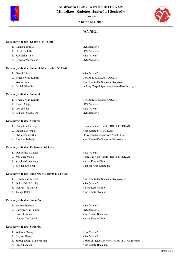Mistrzostwa Polski Karate SHOTOKAN Młodzików, Kadetów, Juniorów i Seniorów Toruń 7 listopada 2015 WYNIKI Kata indywidualne Kadetek (14-15 lat) 1. Ratajska Emilia LKS Zarzewie 2. Niżyńska Julia LKS Zarzewie 3. Kowalska Anna KSA "Atemi" 4. Kruczek Magdalena LKS Zarzewie Kata indywidualne Juniorek Młodszych (16-17 lat) 1. Gaweł Eliza KSA "Atemi" 2. Bracikowska Kamila OBORNICKI KLUB KARATE 3. Wocka Julia Klub Karate-Do Shotokan Krapkowice 4. Bociek Klaudia Ludowy Zespół Sportowy Karate-Do Głubczyce Kata indywidualne Juniorek 1. Bracikowska Kamila OBORNICKI KLUB KARATE 2. Piątek Alicja LKS Zarzewie 3. Gaweł Eliza KSA "Atemi" 4. Kubatek Magdalena LKS Zarzewie Kata indywidualne Seniorek 1. Chmielewska Olga Obornicki Klub Karate "DO SHOTOKAN" 2. Prządka Berenika Klub Karate SHOBU-KAN 3. Dybicz Agnieszka Stowarzyszenie Sportowe "Bushi-Do” 4. Piechota Izabela Klub Karate-Do Shotokan Krapkowice Kata indywidualne Kadetów (14-15 lat) 1. Dobrzyński Mikołaj KSA "Atemi" 2. Mullauer Maciej Obornicki Klub Karate "DO SHOTOKAN" 3. Szydłowski Grzegorz Kaisho Karate Klub 4. Wojdakowski Jan Gdański Klub Karate Do Kata indywidualne Juniorów Młodszych (16-17 lat) 1. Kowalewicz Michał Klub Karate-Do Shotokan Krapkowice 2. Dobrzyński Mikołaj KSA "Atemi" 3. Nguyen Tat Dawid Kaisho Karate Klub 4. Talaga Rafał Klub Karate "Nidan" Kata indywidualne Juniorów 1. Mączka Bartosz KSA "Atemi" 2. Bartoszewski Łukasz LKS Zarzewie 3. Steczuk Adam Klub Karate Bodaikan 4. Nguyen Tat Dawid Kaisho Karate Klub Kata indywidualne Seniorów 1. Wilczek Maciej KSA "Atemi" 2. Mączka Bartosz KSA "Atemi" 3. Szczypkowski Maksymilian Uczniwski Klub Sportowy "HITOTSU" Ostrzeszów 4. Steczuk Adam Klub Karate Bodaikan Strona 1 z 6 Mistrzostwa Polski Karate SHOTOKAN Młodzików, Kadetów, Juniorów i Seniorów Toruń 7 listopada 2015 WYNIKI Kumite indywidualne Kadetek (14-15 lat) 1. Groth Dominika Klub Sportowy Gokken 2. Kuzioła Natalia Sportowy Klub Karate Senshi 3. Michalewicz Marta Klub Karate GOTTSU 3. Olkowska Natasza Klub Karate Shotokan w Lęborku Kumite indywidualne Juniorek Młodszych (16-17 lat) 1. Ambroziak Julia Kaisho Karate Klub 2. Grabska Daria Klub Karate Champion-Team 3. Borys Izabela Karate Klub KUMADE 3. Grejner Wiktoria Klub Karate "Nidan" Kumite indywidualne Juniorek 1. Grabska Daria Klub Karate Champion-Team 2. Rykowska Hanna Klub Sportowy Gokken 3. Bogusław Marta Karate Klub KUMADE 3. Zajdel Ewa Klub Karate "Nidan" Kumite indywidualne Seniorek 1. Gradowska Justyna Karate Klub KUMADE 2. Prządka Berenika Klub Karate SHOBU-KAN 3. Nowakowska Magdalena Wrocławski Klub Sportów Azjatyckich "Budokan" 3. Szponder Natalia Klub Karate "Nidan" Kumite indywidualne Kadetów (14-15 lat) 1. Grzegorczuk Damian Kaisho Karate Klub 2. Sulima Łukasz Klub Karate Kamikaze Szczecin 3. Dziekoński Dawid Kaisho Karate Klub 3. Vogt Kacper Pleszewski Klub Karate Kumite indywidualne Juniorów Młodszych (16-17 lat) 1. Panasewicz Rafał Kaisho Karate Klub 2. Knapik Krzysztof Stowarzyszenie Sympatyków Karate "BUSHIDO" 3. Radziwoniuk Jakub Kaisho Karate Klub 3. Śmigielski Maciej Pleszewski Klub Karate Kumite indywidualne Juniorów 1. Chojnowski Michał Kaisho Karate Klub 2. Królewski Rafał Kaisho Karate Klub 3. Król Michał Klub Karate Champion-Team 3. Migdalski Mariusz Klub Sportowy Gokken Kumite indywidualne Seniorów 1. Warda Kamil Klub Sportowy "Olimp" 2. Królewski Rafał Kaisho Karate Klub 3. Szumiło Piotr Klub Karate Bodaikan 3. Wendt Paweł Klub Sportowy Gokken Strona 2 z 6 Mistrzostwa Polski Karate SHOTOKAN Młodzików, Kadetów, Juniorów i Seniorów Toruń 7 listopada 2015 WYNIKI Kata drużynowe Juniorek Młodszych (16-17 lat) 1. Julia Niżyńska - Magdalena Kruczek - Karolina Zelasko LKS Zarzewie 2. Wiktoria Matuszewska - Zuzanna Gołata - Daniela Holk Stowarzyszenie Sportowe "Bushi-Do” 3. Anastazja Dziągwa - Kamila Klin - Aleksandra Macuga Klub Karate Shotokan "TORA" Legnica Kata drużynowe Seniorek 1. Karolina Makarewicz - Patrycja Krzak - Patrycja Kądziałka Klub Sportowy Shindo 2. Magdalena Mazajczyk - Krystyna Maciejska - Beata Zielińska Wrocławski Klub Sportów Azjatyckich "Budokan" 3. Katarzyna Kawka - Agnieszka Zadka - Marta Dzielak Inowrocławski Klub Sportowy Karate Kata drużynowe Kadetów (14-15 lat) 1. Dawid Dziekoński - Grzegorz Szydłowski - Jakub Michałowski Kaisho Karate Klub 2. Marcin Zieliński - Michał Kotulski - Kamil Wójcik Lubelski Klub Karate Shotokan 3. Jakub Kosiński - Kamil Wojtkowski - Krzysztof Niedolistek ATEMI Warszawa 4. Łukasz Sulejczak - Jakub Koryczan - Michał Zawadzki ATEMI Warszawa Strona 3 z 6 Mistrzostwa Polski Karate SHOTOKAN Młodzików, Kadetów, Juniorów i Seniorów Toruń 7 listopada 2015 WYNIKI Kata drużynowe Juniorów Młodszych (16-17 lat) 1. Grzegorz Szydłowski - Dawid Nguyen Tat - Szymon Bieluczyk Kaisho Karate Klub 2. Michał Szostecki - Beniamin Strzelecki - Michał Kowalewicz Klub Karate-Do Shotokan Krapkowice 3. Mikołaj Osuszkiewicz - Piotr Michałek - Kacper Skrobiszewski M.U.K.S. Dynamic Akademia Karate 4. Grzegorz Sulima - Łukasz Sulima - Szymon Harwat Klub Karate Kamikaze Szczecin Kata drużynowe Juniorów 1. Maciej Skrouba - Dawid Nguyen Tat - Szymon Bieluczyk Kaisho Karate Klub 2. Mikołaj Osuszkiewicz - Piotr Michałek - Kacper Skrobiszewski M.U.K.S. Dynamic Akademia Karate 3. Wojciech Dorywała - Aleksander Gorzelany - Mateusz Bobrzyk Klub Sportowy Shindo Kata drużynowe Seniorów 1. Bartosz Mączka - Dawid Gaweł - Maciej Wilczek KSA "Atemi" 2. Paweł Przewoźny - Paweł Baran - Krzysztof Waśko OBORNICKI KLUB KARATE 3. Bartłomiej Barański - Dariusz Sworeń - Rafał Talaga Klub Karate "Nidan" 4. Wojciech Dorywała - Aleksander Gorzelany - Mateusz Bobrzyk Klub Sportowy Shindo Strona 4 z 6 Mistrzostwa Polski Karate SHOTOKAN Młodzików, Kadetów, Juniorów i Seniorów Toruń 7 listopada 2015 WYNIKI Kumite drużynowe Juniorek 1. Wiktoria Grejner - Weronika Grejner - Ewa Zajdel Klub Karate "Nidan" 2. Patrycja Krzak - Patr